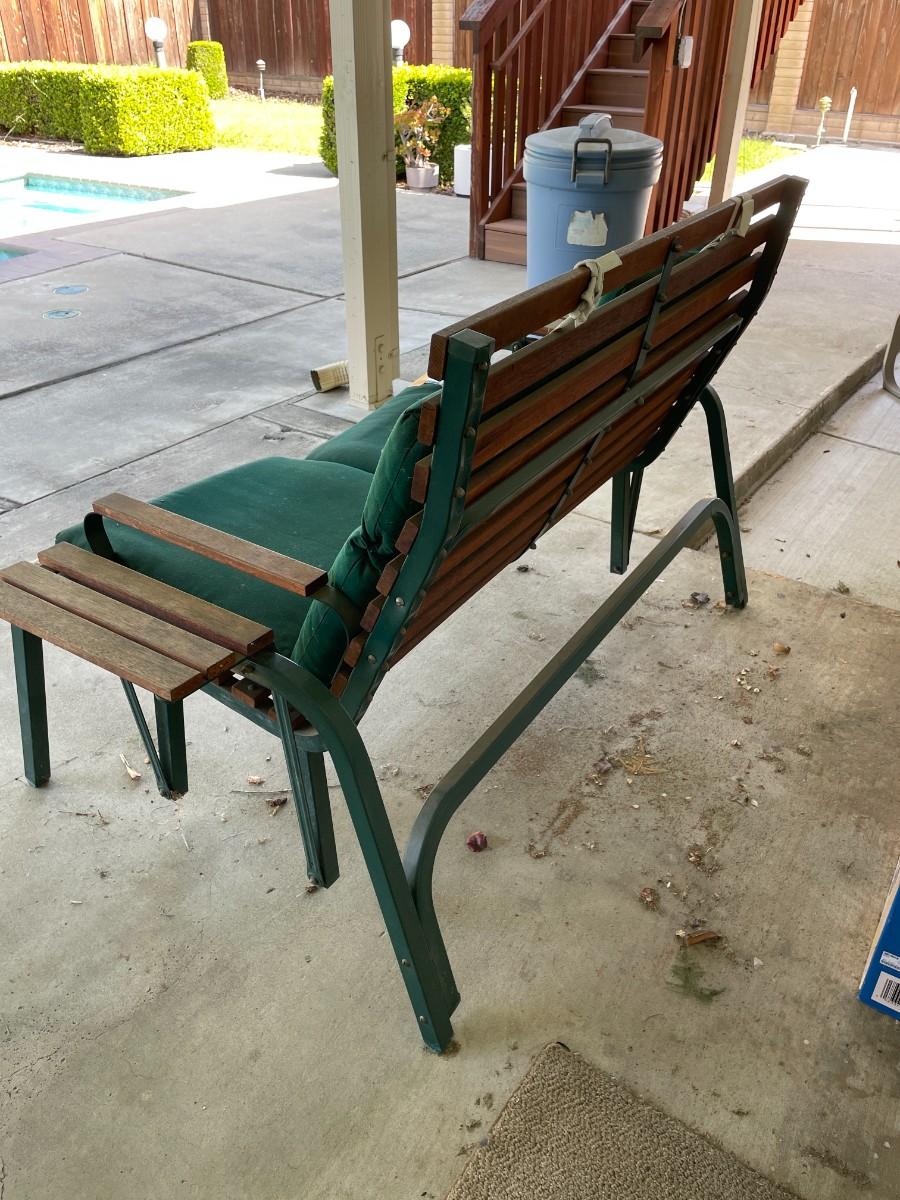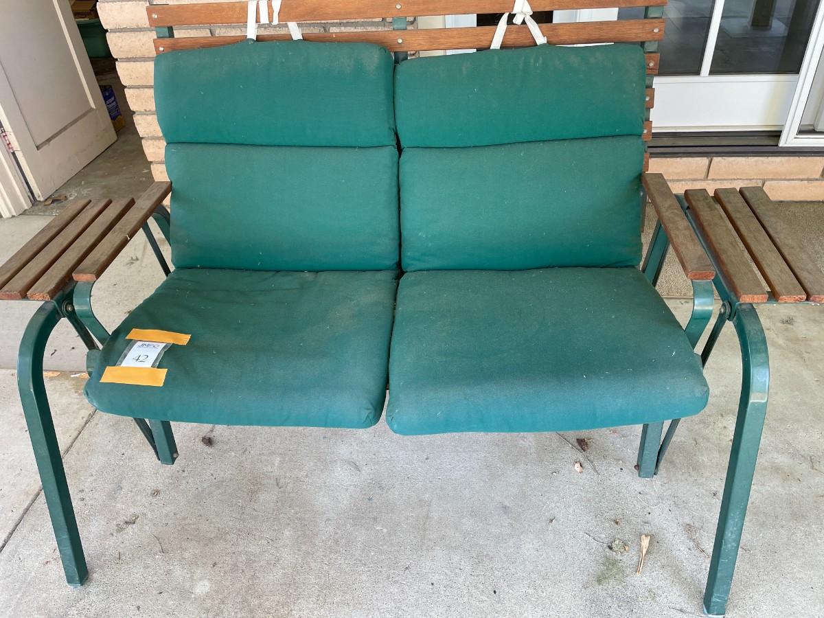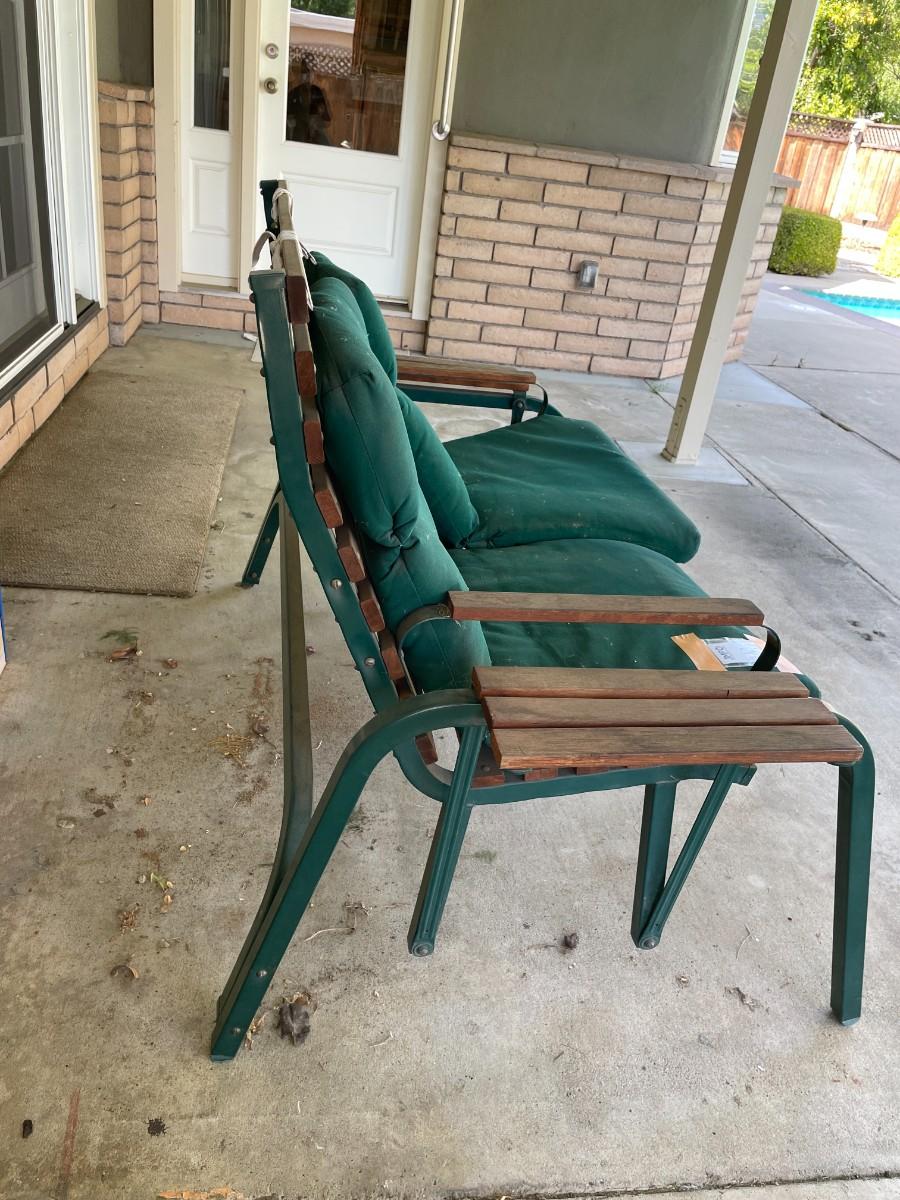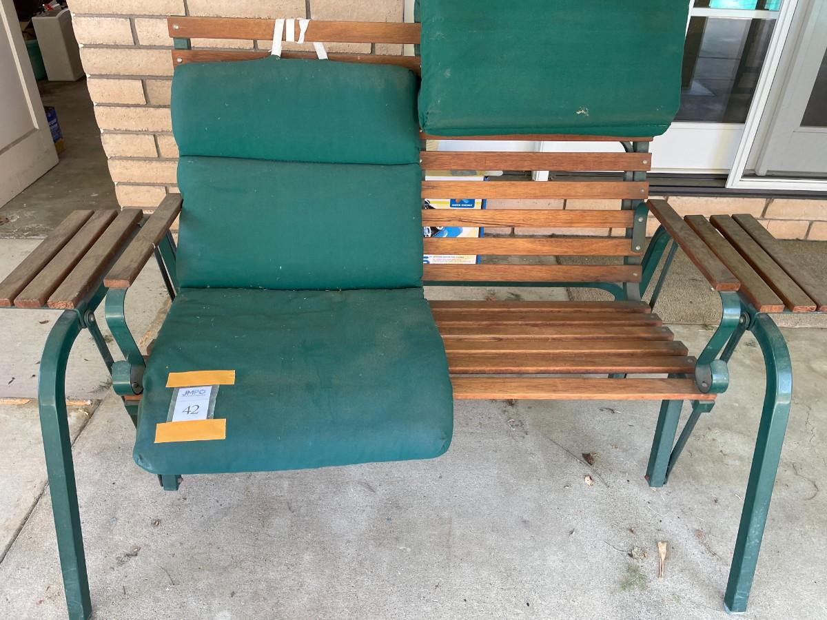 Outdoor Porch 2-seat glider. Metal frame with wood slat seat, back, arms and shelves. Cushions need cleaning - see photos. Large - bring help, tools and appropriate vehicle.