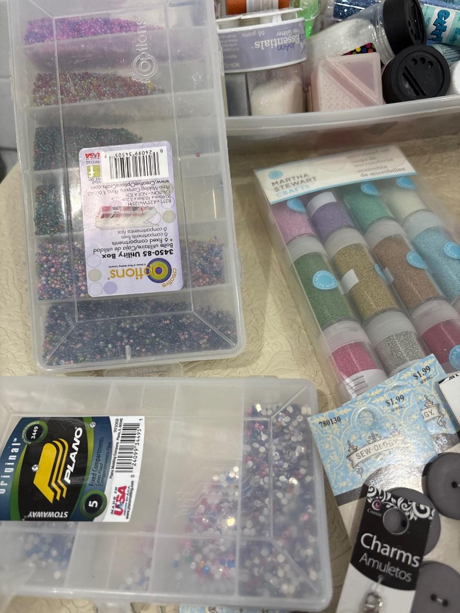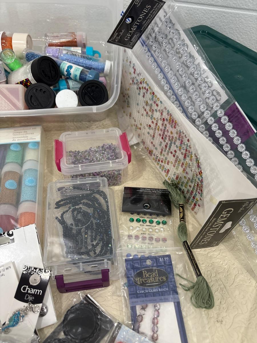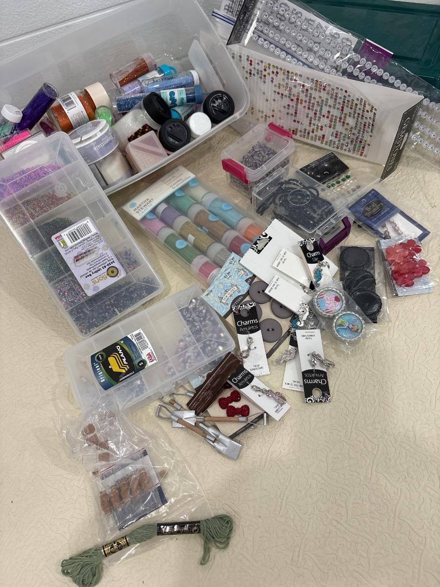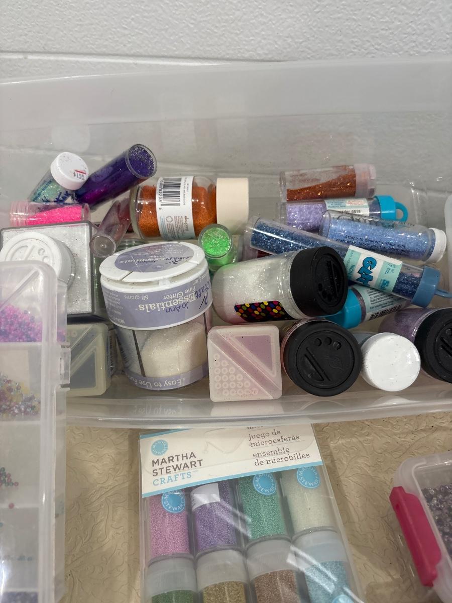 A tote of glitter, beads, and miscellaneous crafting items.