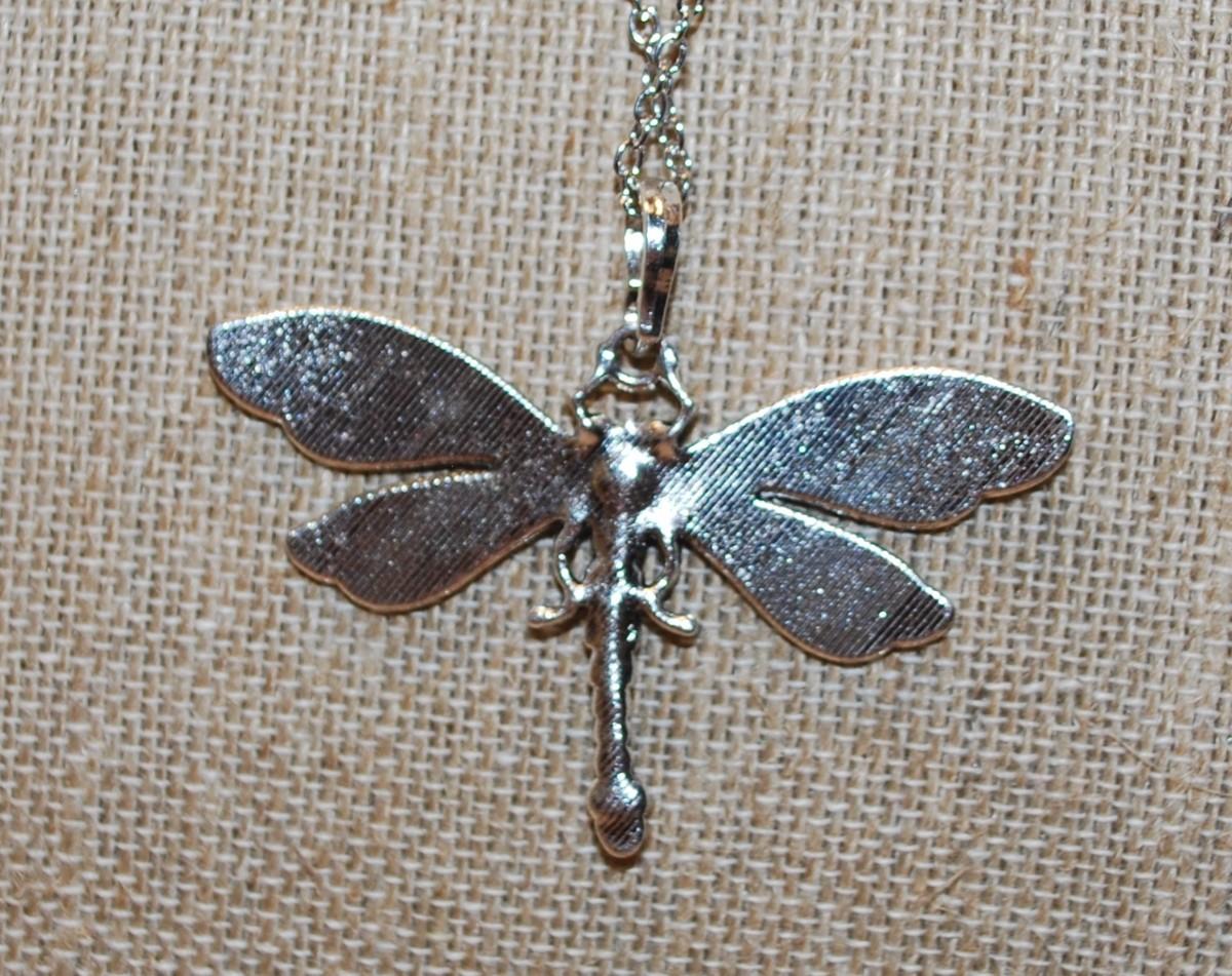 Glittery DEEP GREEN & GRAY Dragonfly PENDANT (2½" x 2") on a Silver Tone Necklace Chain 19" L