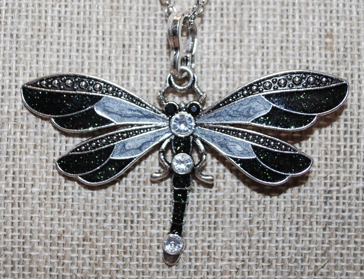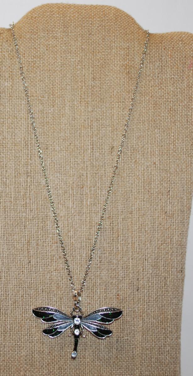 Glittery DEEP GREEN & GRAY Dragonfly PENDANT (2½" x 2") on a Silver Tone Necklace Chain 19" L
