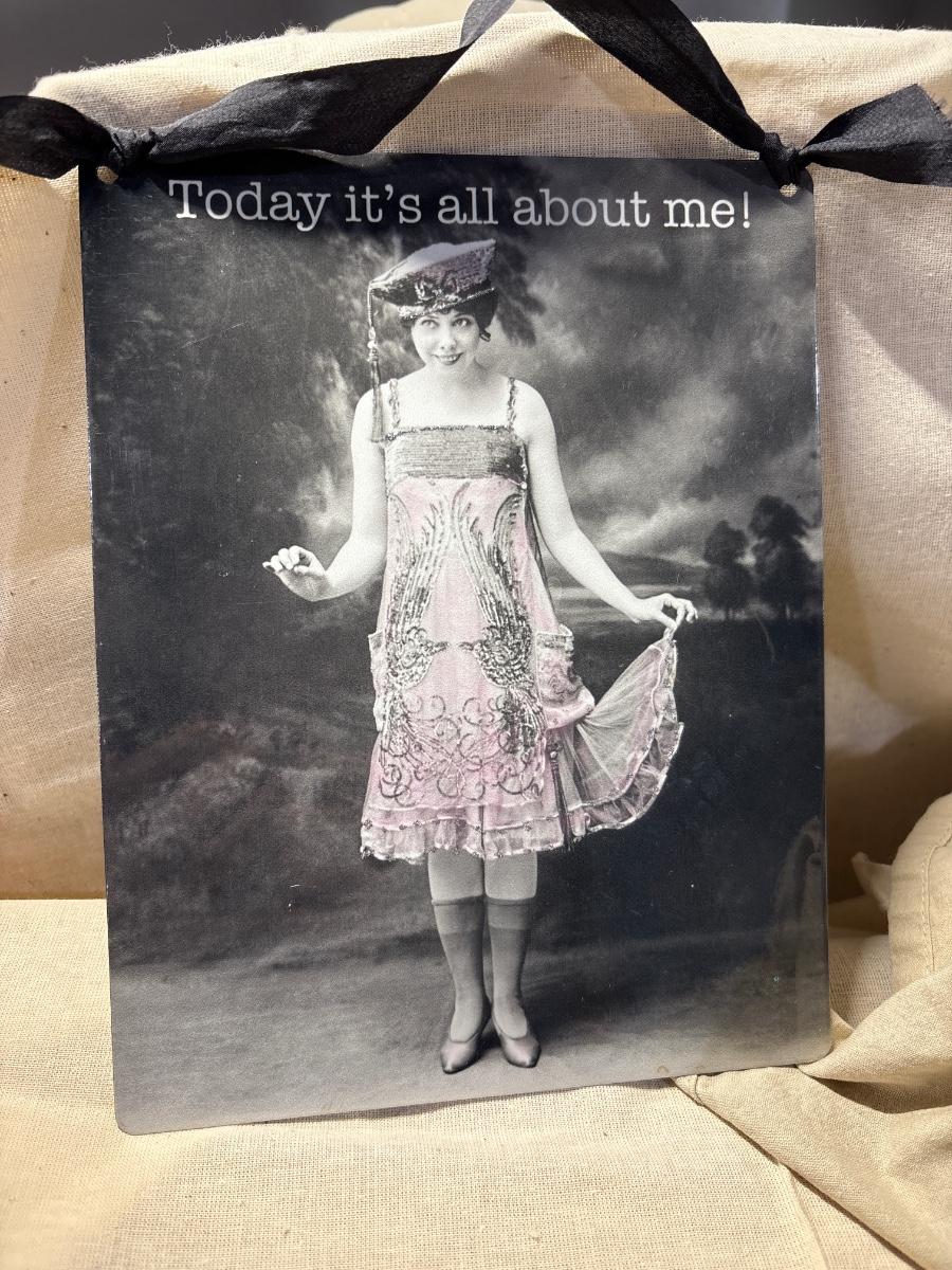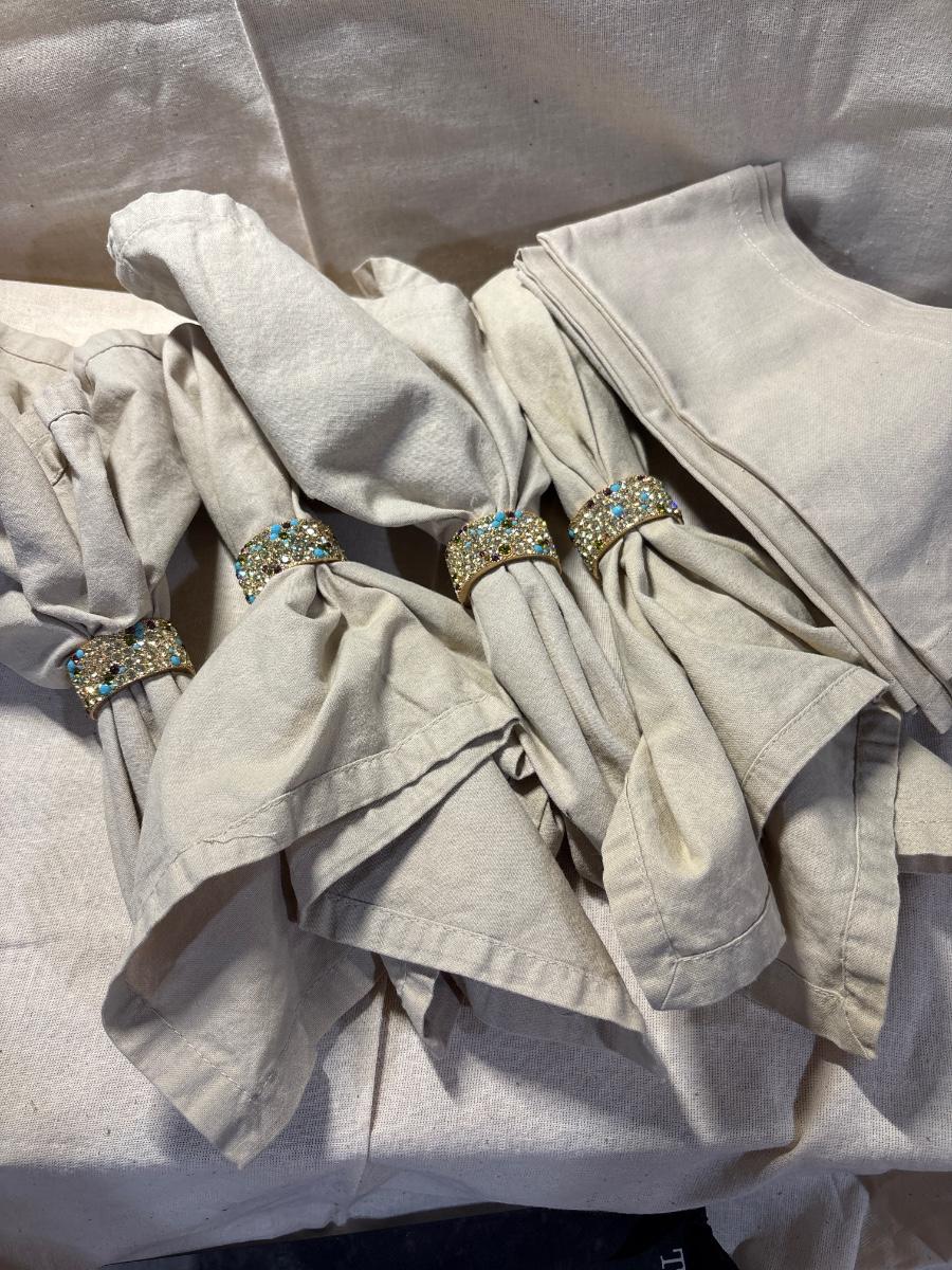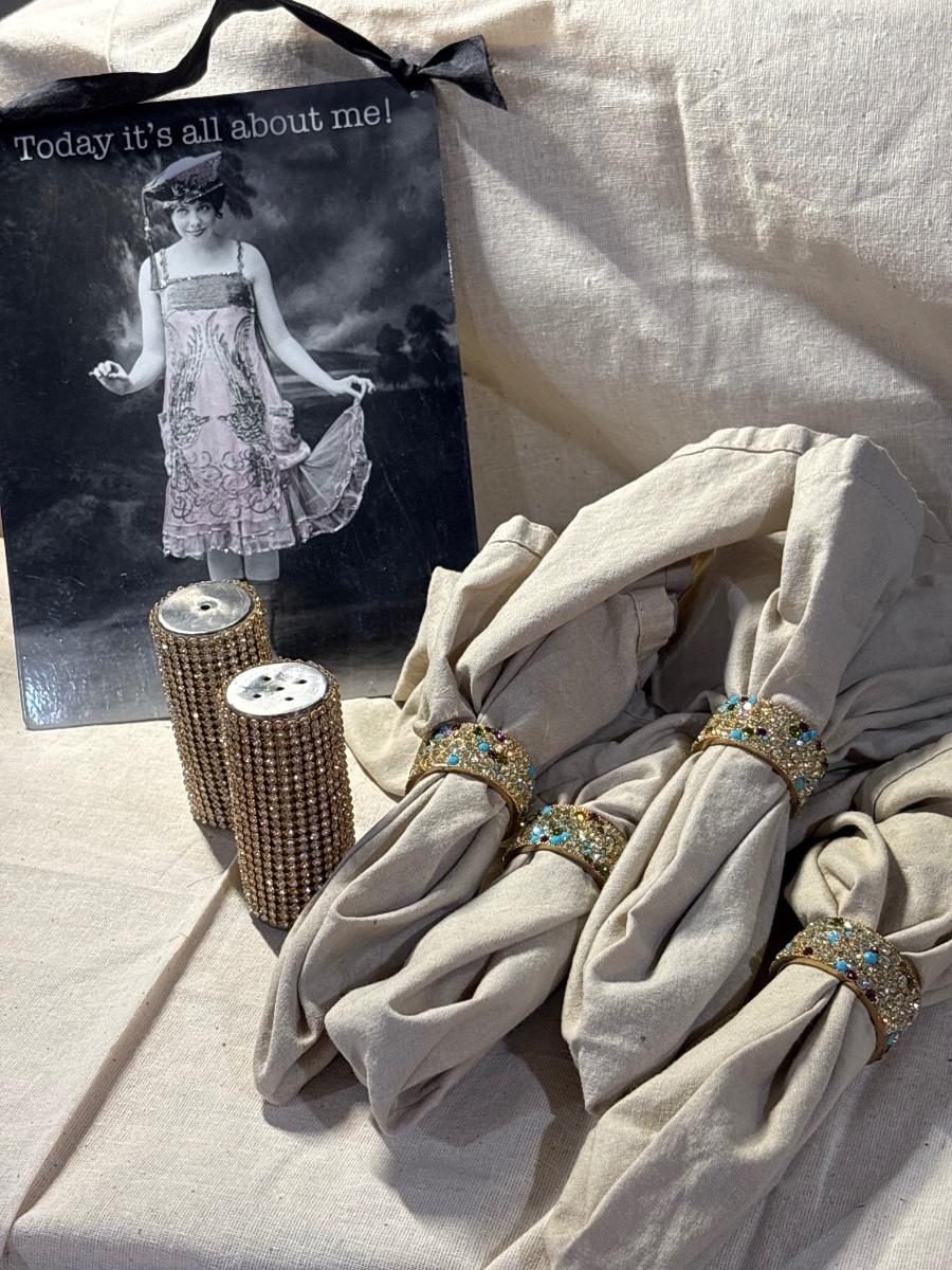 Great metal “Today it’s all about me! Sign! Four glitz napkin rings, plus eight cloth napkins.