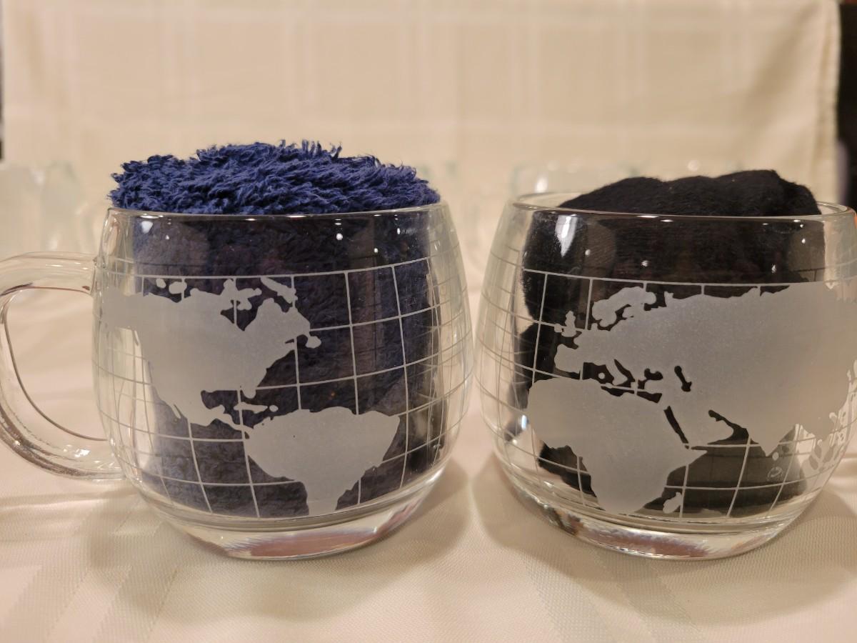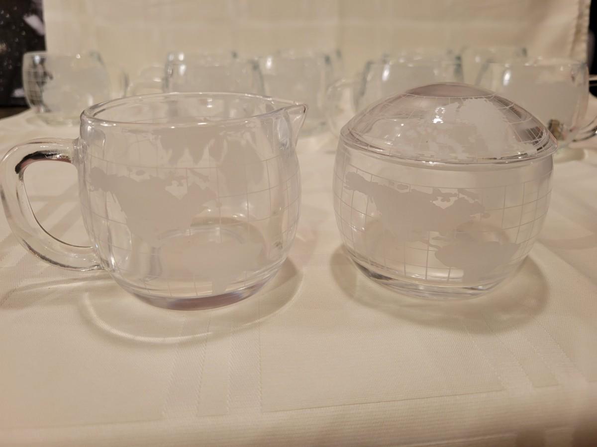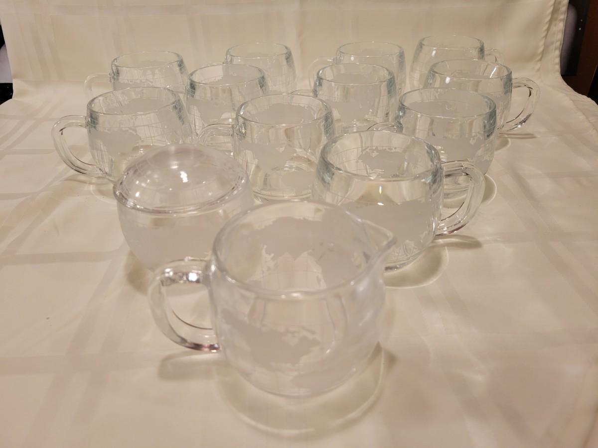 Glass tea/coffee set with 11 cups ans cream and sugar dispensers. All gave the globe etched into the glass.