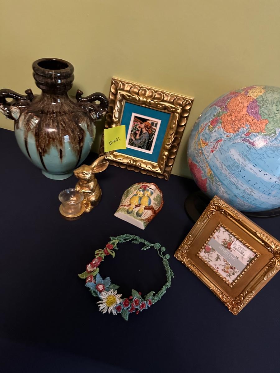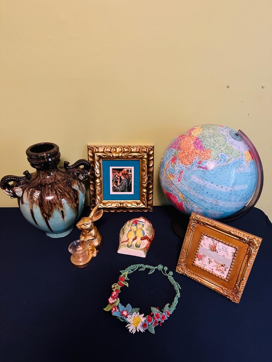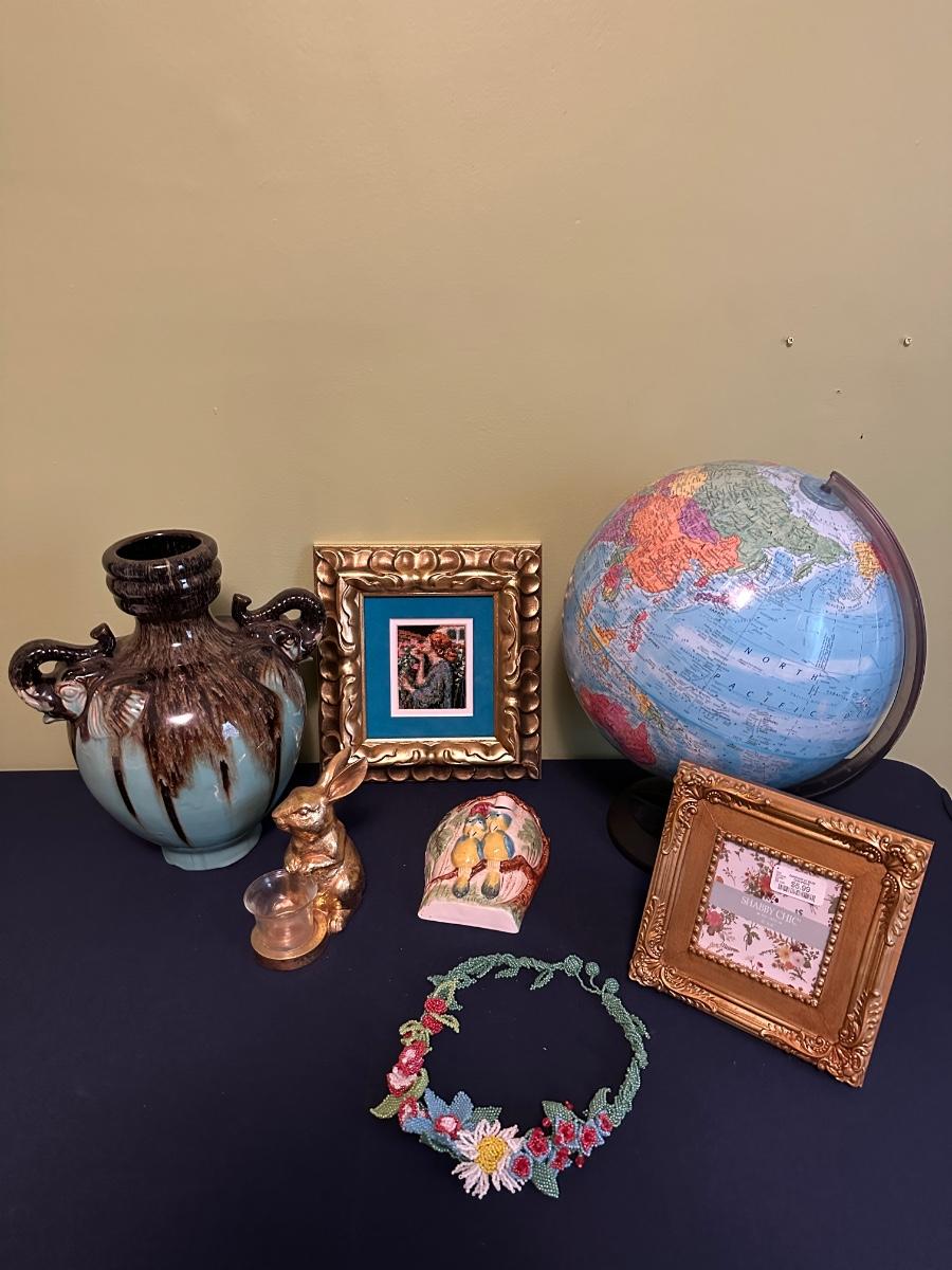 GLOBE, WALL POCKET, EMBROIDERY FRAMED, BUNNY GLASS, HEADPIECE, ELEPHANT VASE AS PICTURED