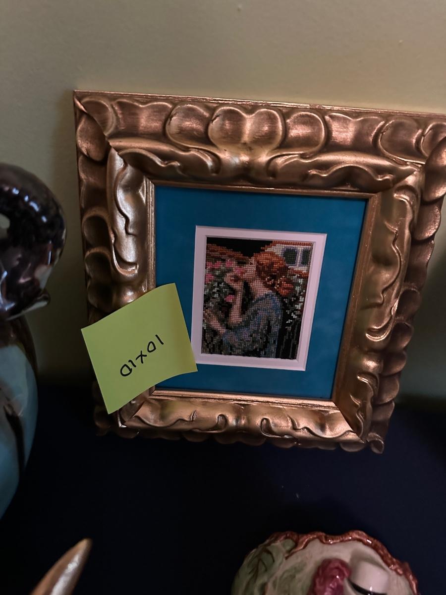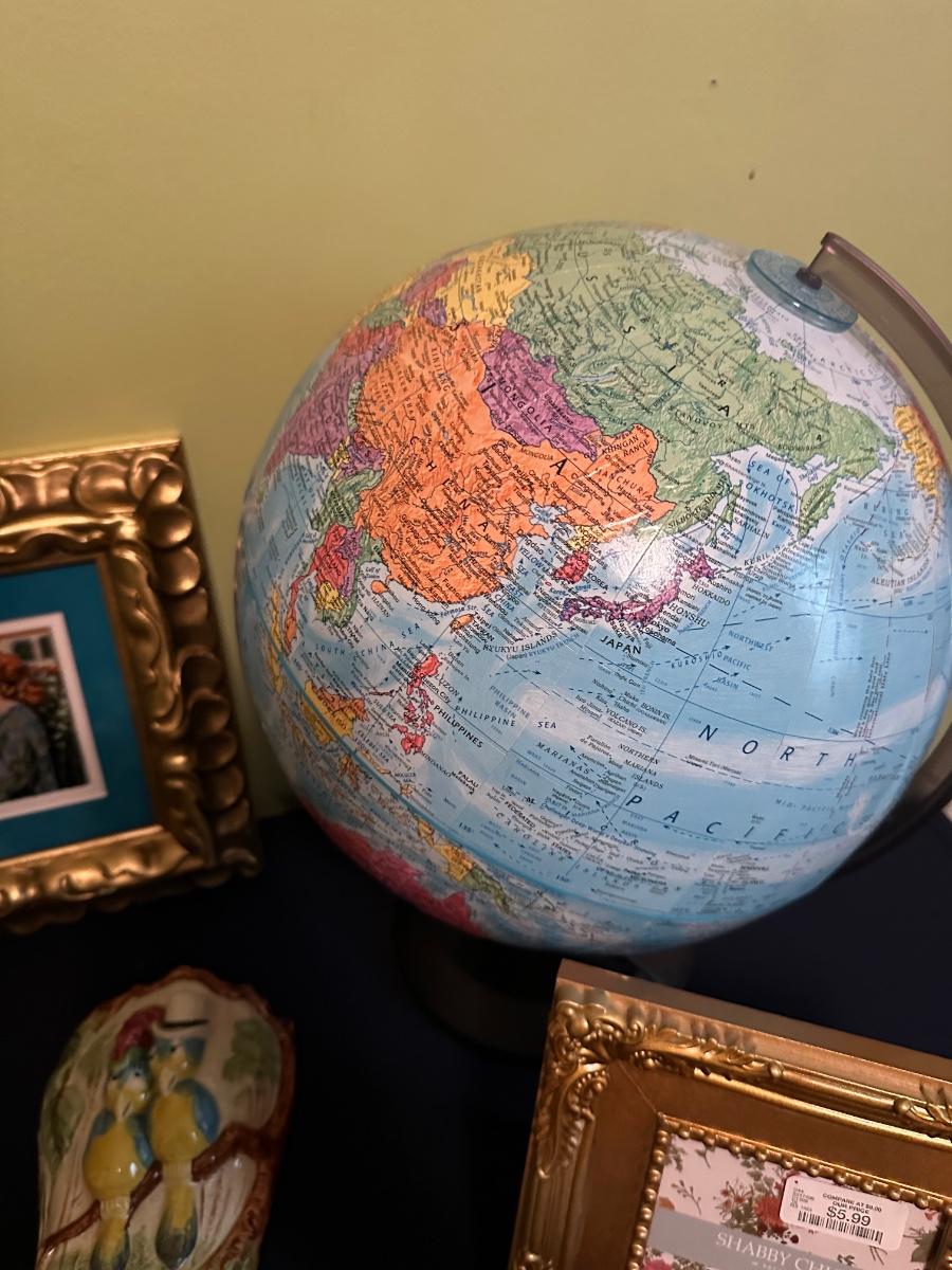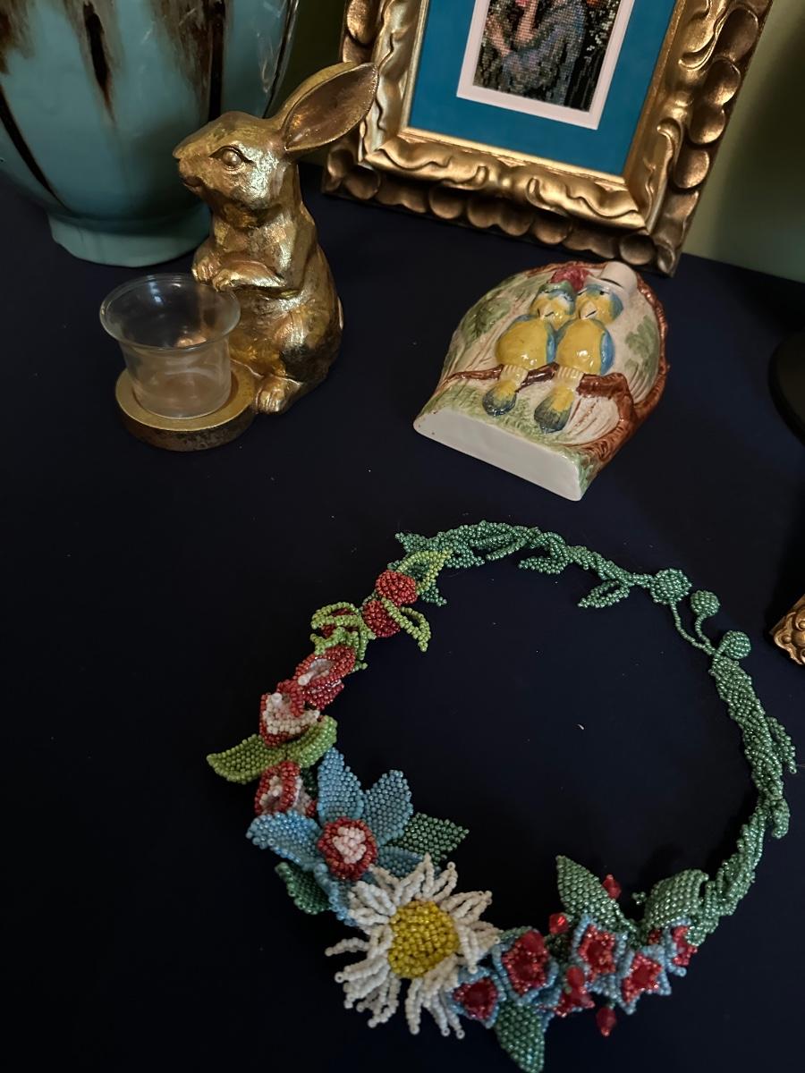 GLOBE, WALL POCKET, EMBROIDERY FRAMED, BUNNY GLASS, HEADPIECE, ELEPHANT VASE AS PICTURED