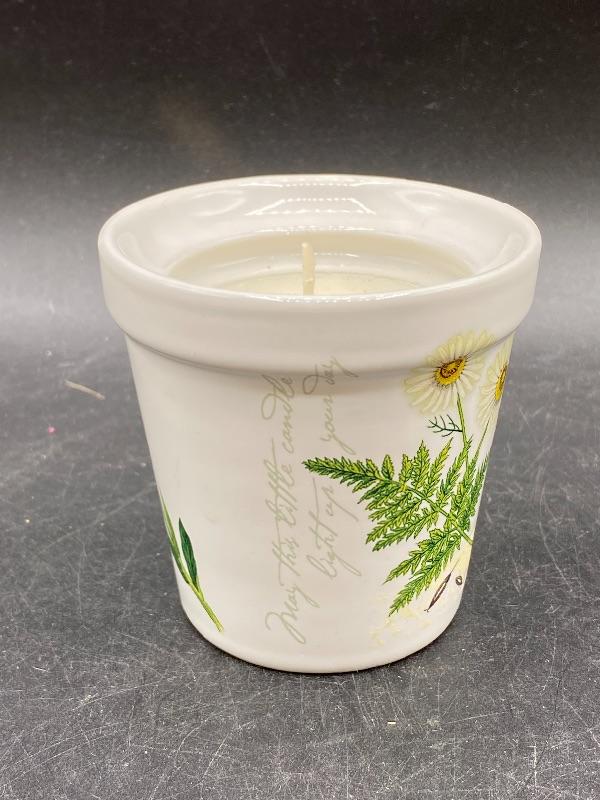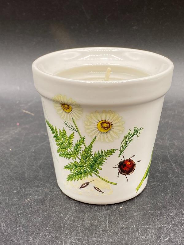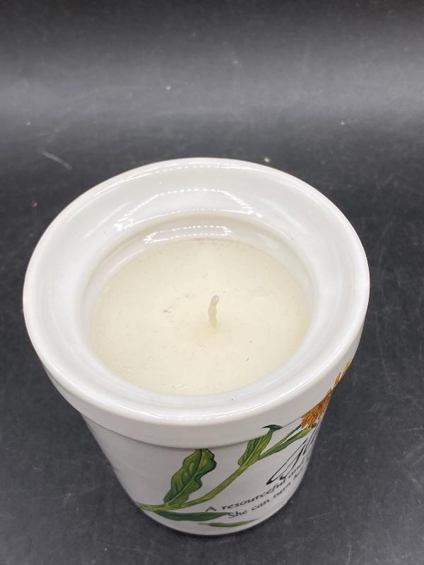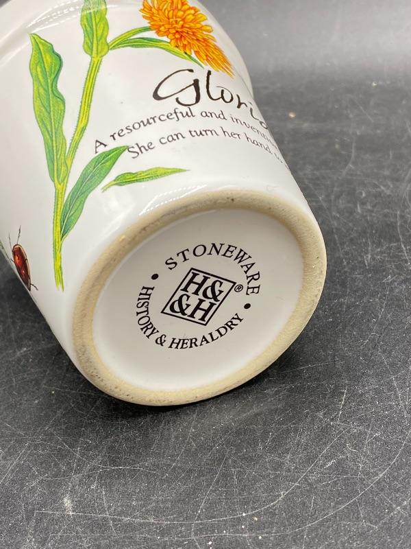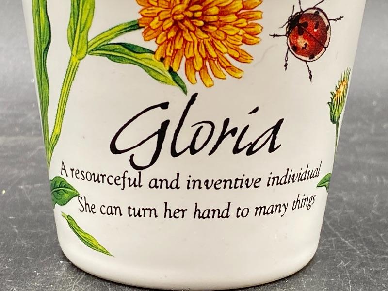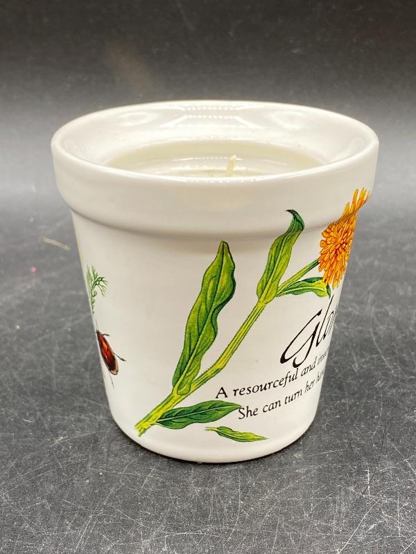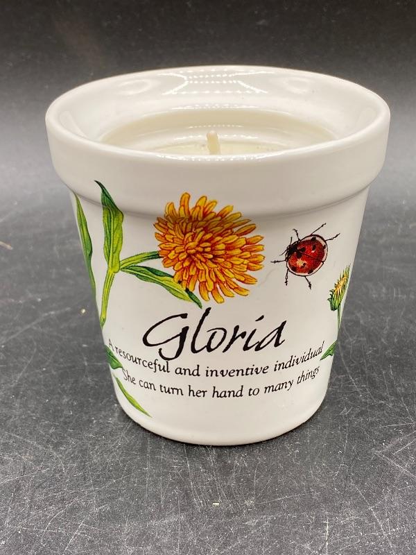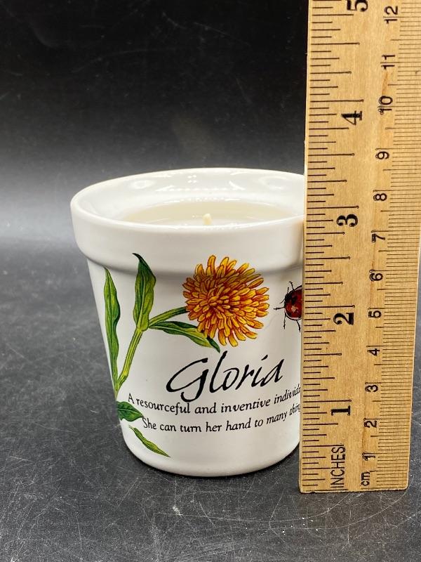Cute garden themed candle with the name Gloria and its meaning on it. Made by History & Heraldry. Features lady bugs and flowers on it. 3" tall. Unscented.