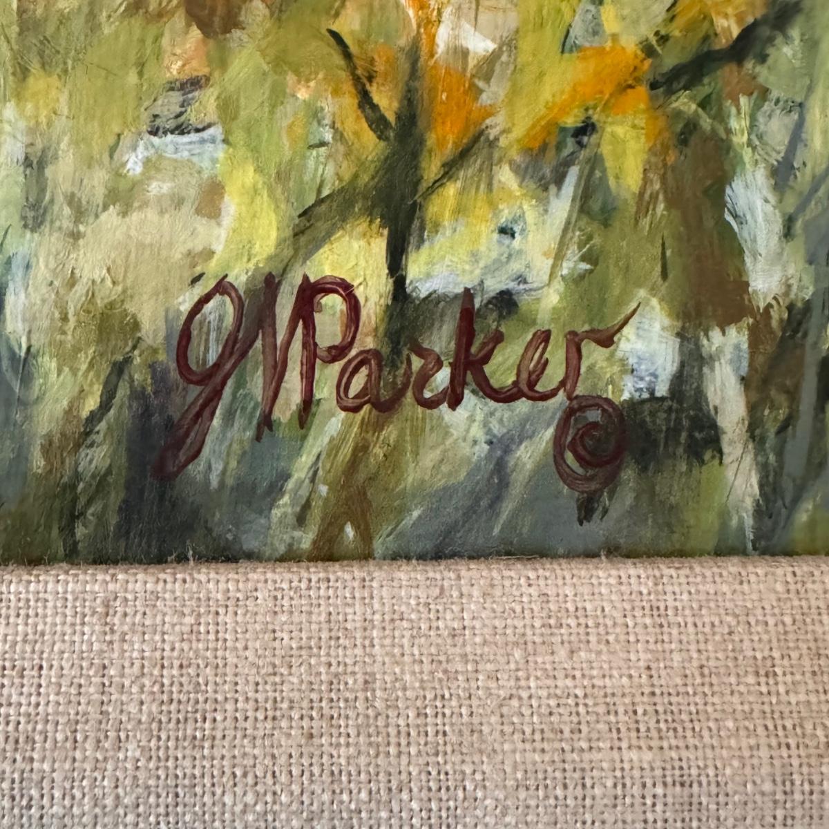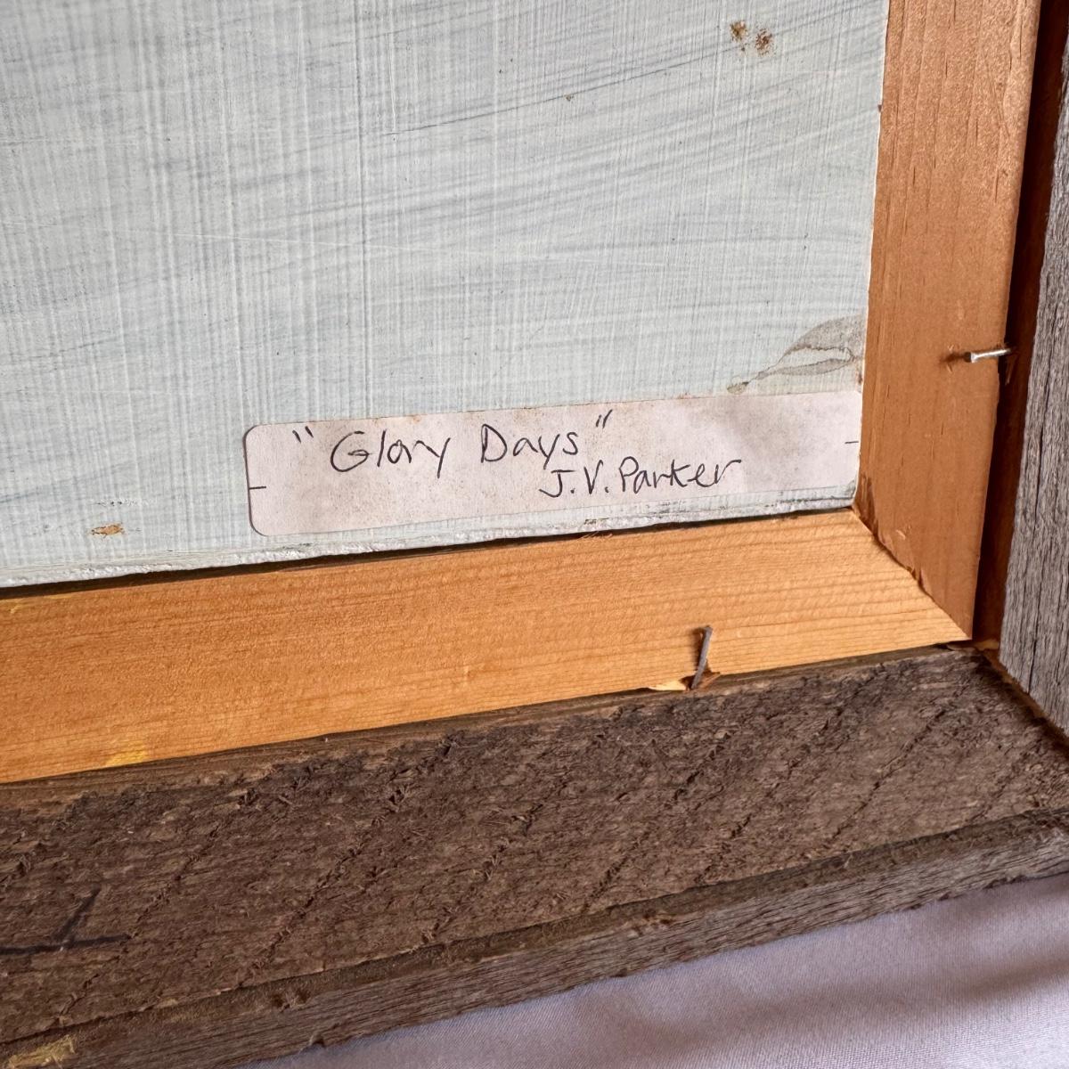 Lot includes one painting with a sticker on the back claiming the title of “Glory Days” by J.V. Parker. The frame is wooden, and the matting appears to be fabric. The art measures 17.5” x 22”H. It appears to be signed in paint in the bottom right corner. Shipping available. Shipping can be costly. We suggest contacting our preferred local shipping provider, Postage Express, with dimensions and getting an estimate before bidding: (828) 255-9250 or shipping@postageexpressnc.com.