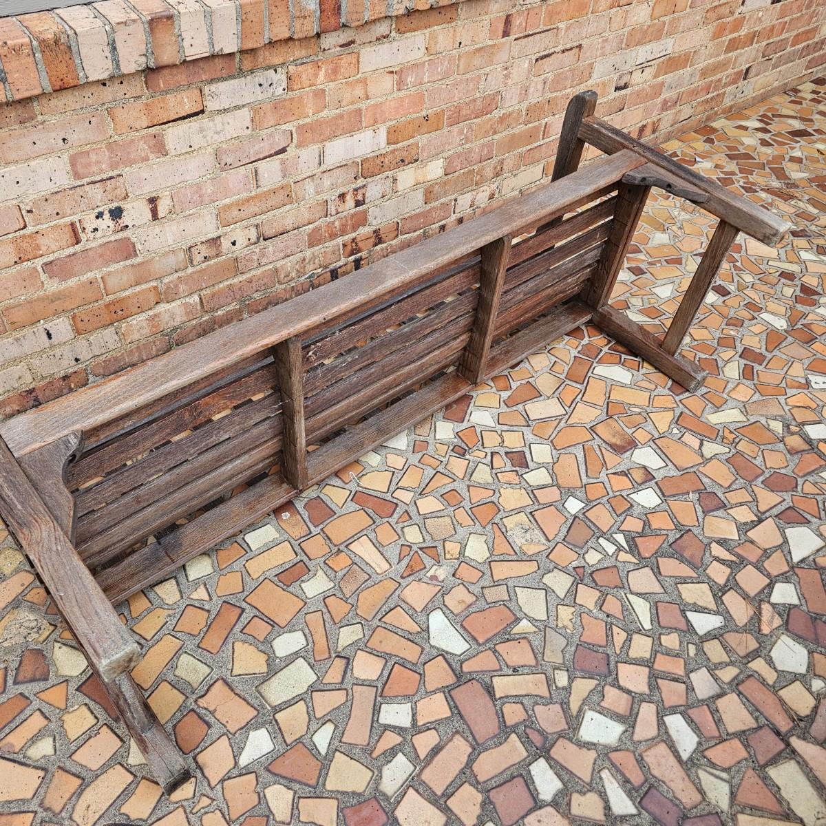 Wooden slat seat and back, this porch or yard bench by Gloster is perfect for relaxing. Put together with some screws and also pinned mortise & tendon, this bench measures 60" x 24" x 33"H, has 16" seat height. Bench may be made of teak. See photos for details. Local pickup only.
