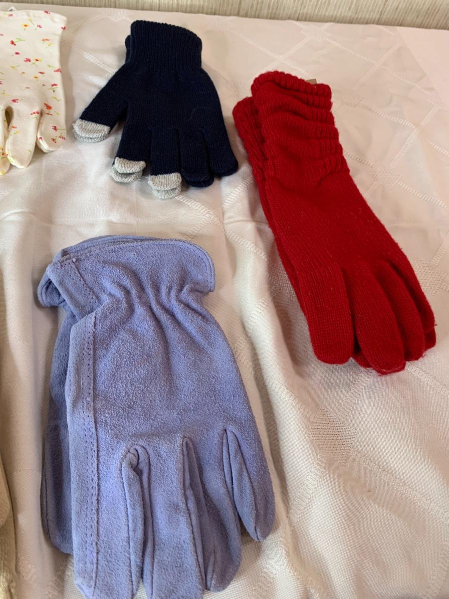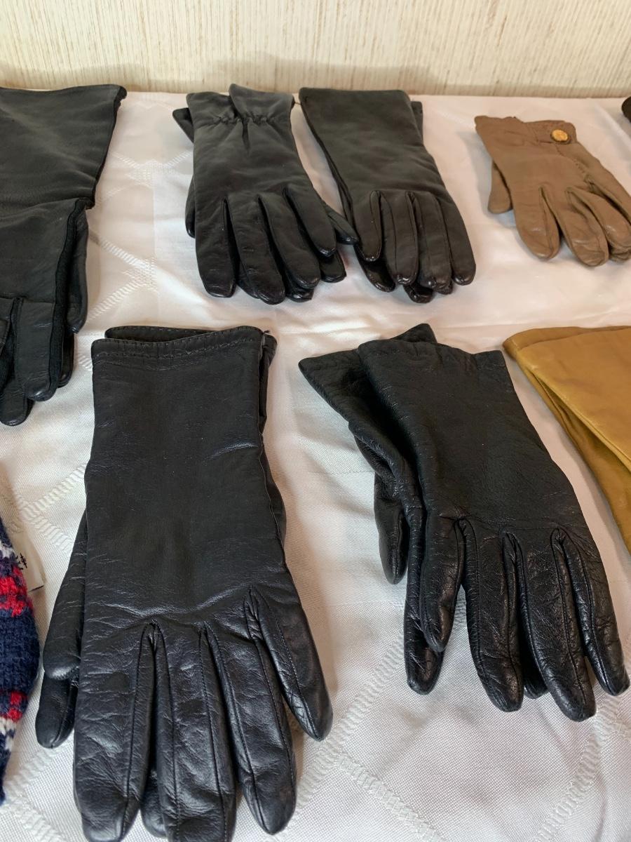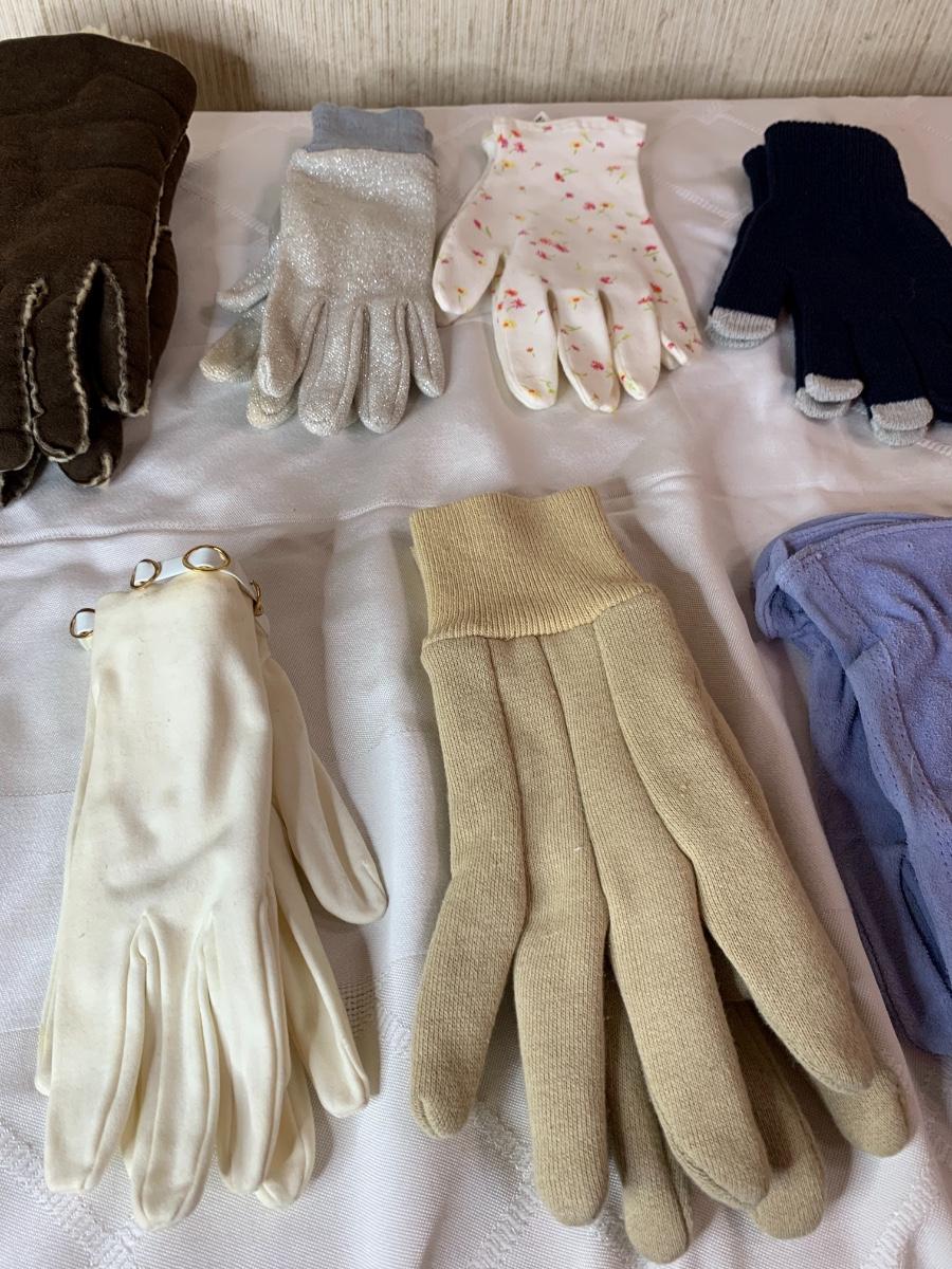 Assorted gloves including leather, vinyl, cotton and polyester. In good condition