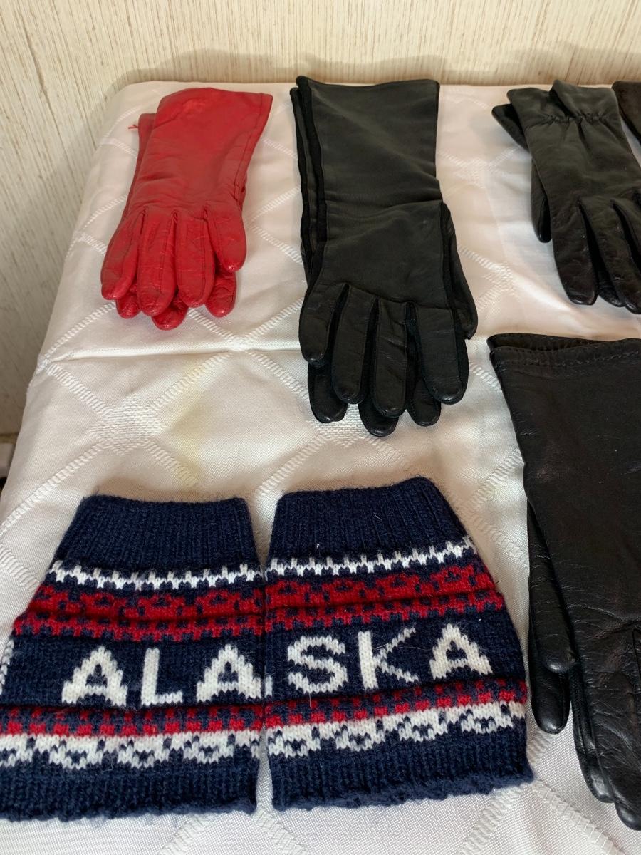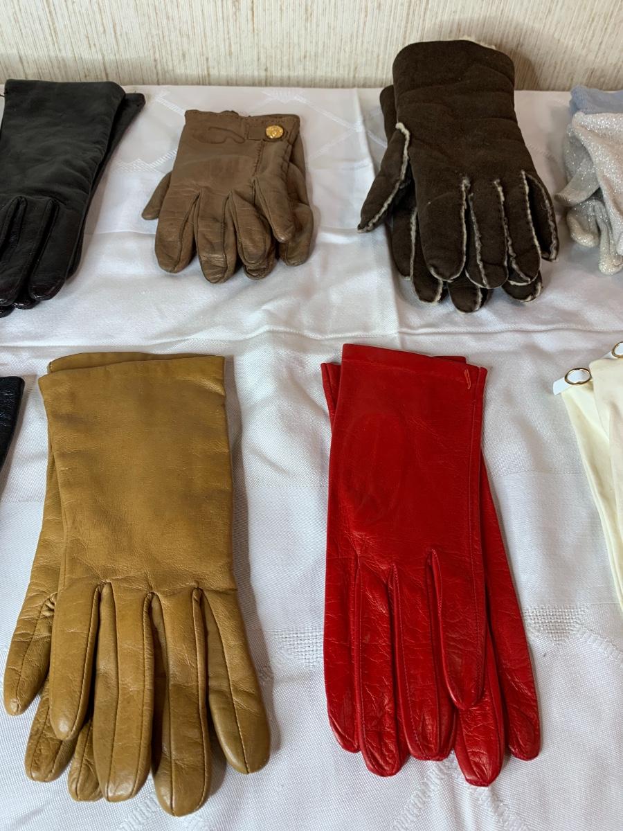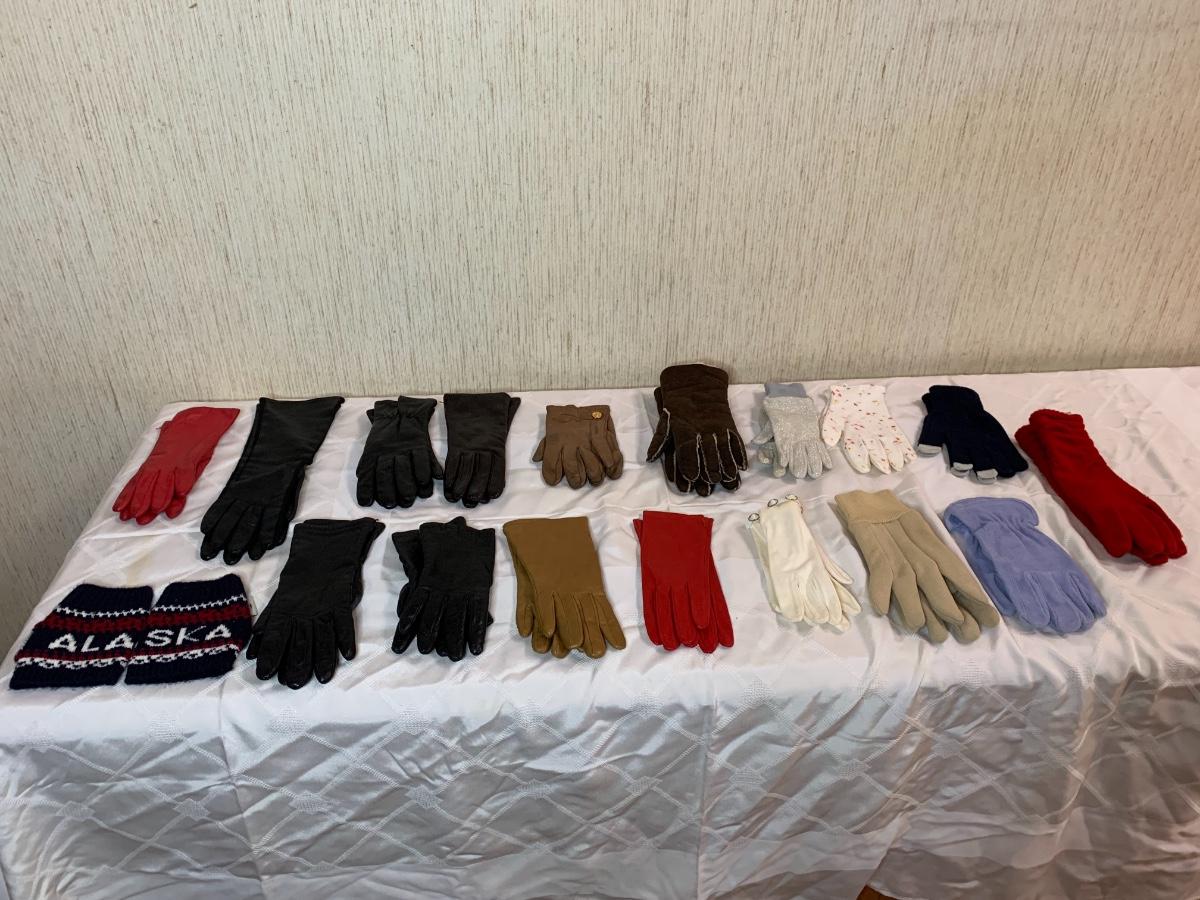Assorted gloves including leather, vinyl, cotton and polyester. In good condition