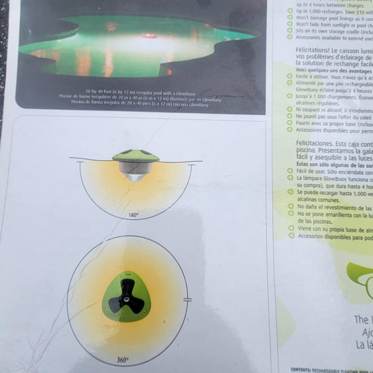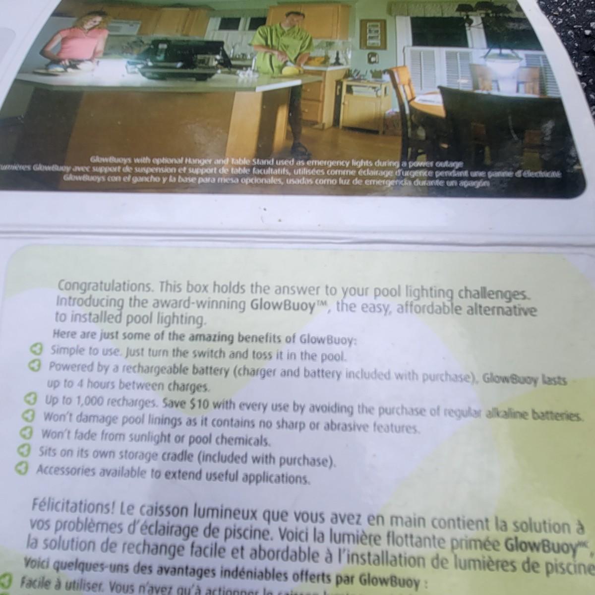 2 Glow buoy classic rechargeable, floating pool lights. Appear to be unused. Charging led indicator lit when plugged in, but lights didn't turn on, likely due to drained batteries. Also included are 5 Gizzmo's for absorbing the expansion of winter freeze up in pool skimmers. Lights measure approximately 11" x 8" and both have chargers. Local pickup only