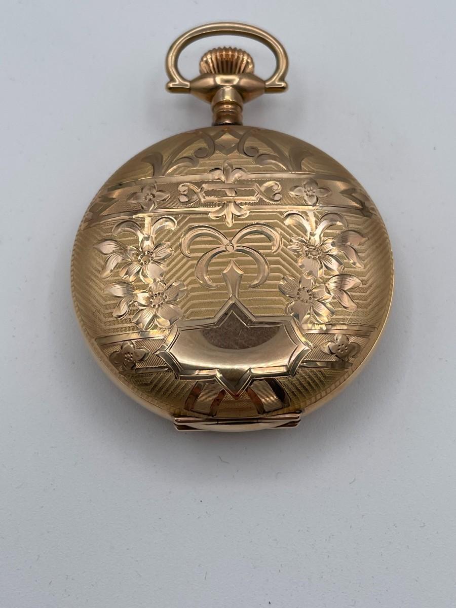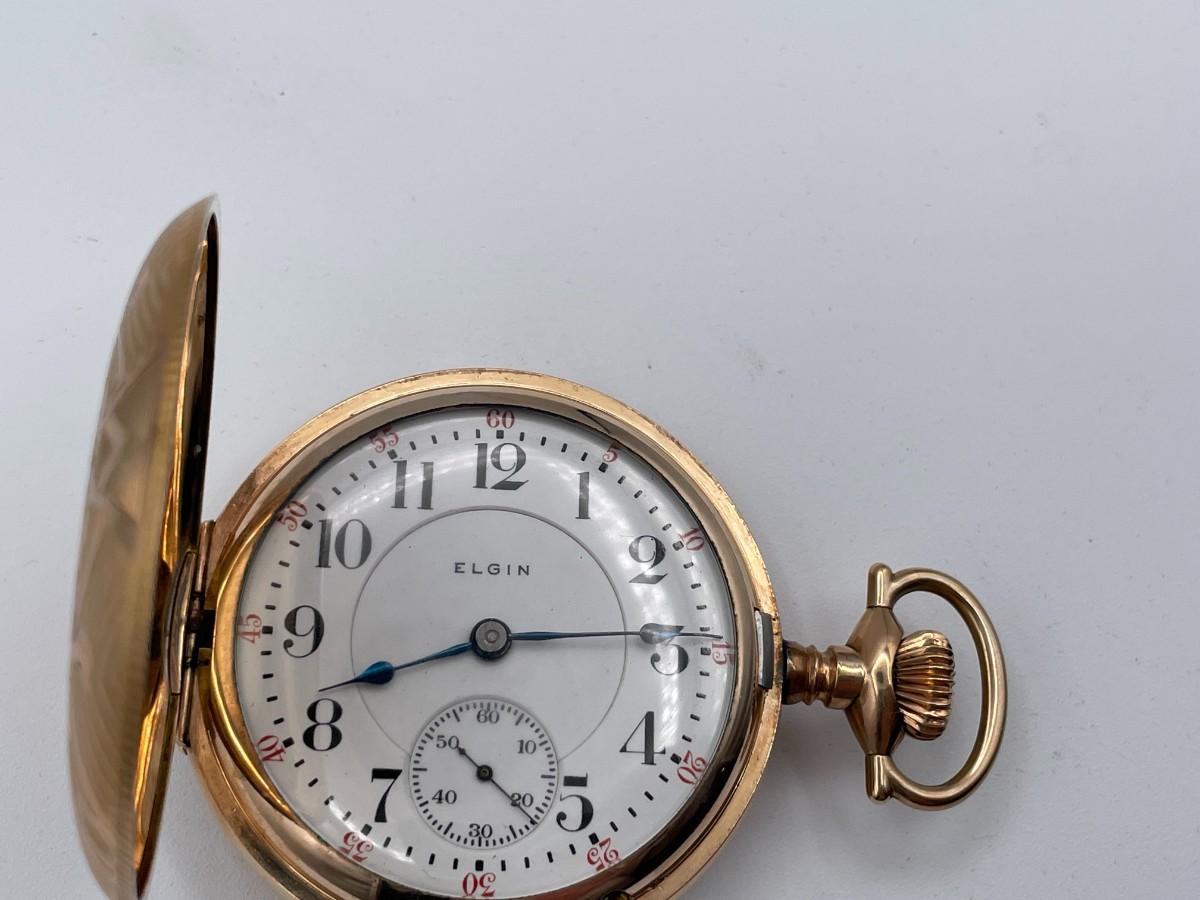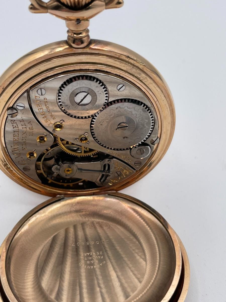 GM Wheeler (Elgin Watch Co) - Gold Tone - Watch Number (15463277) - 17 Jewels, Adjusted -Size 18S- with Gold Filled B&B Case Number (11065807). Condition - Winder & watch are in working order. This is not a guarantee that all parts are original nor is the watch autheniticated. Estimated Value - $260 - $345. Year 1911