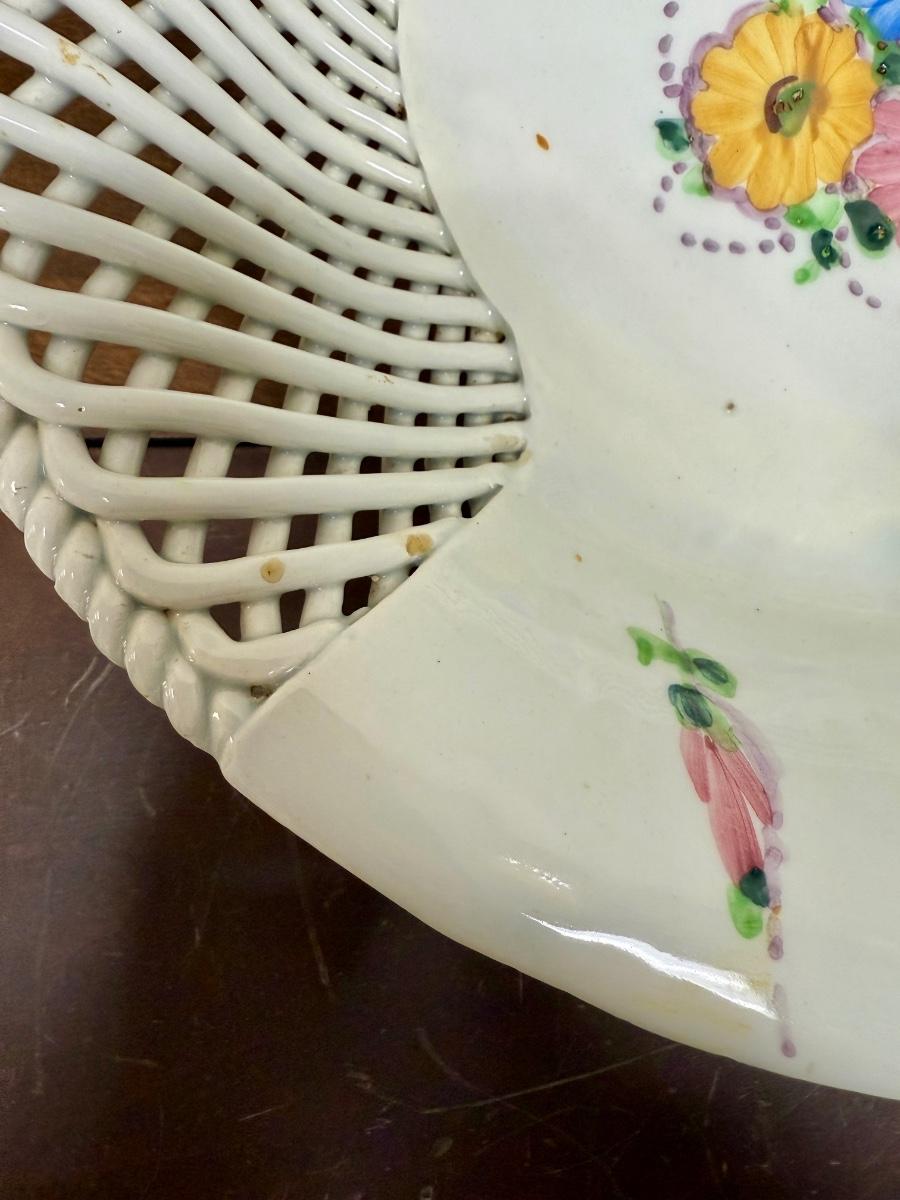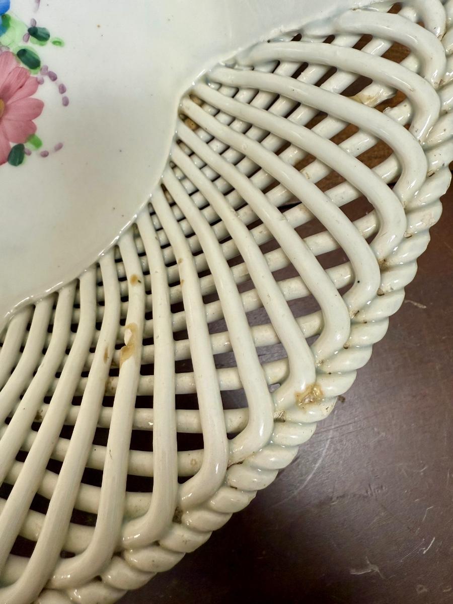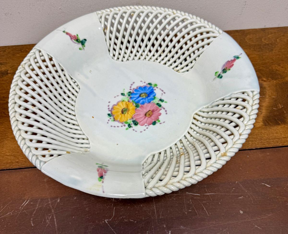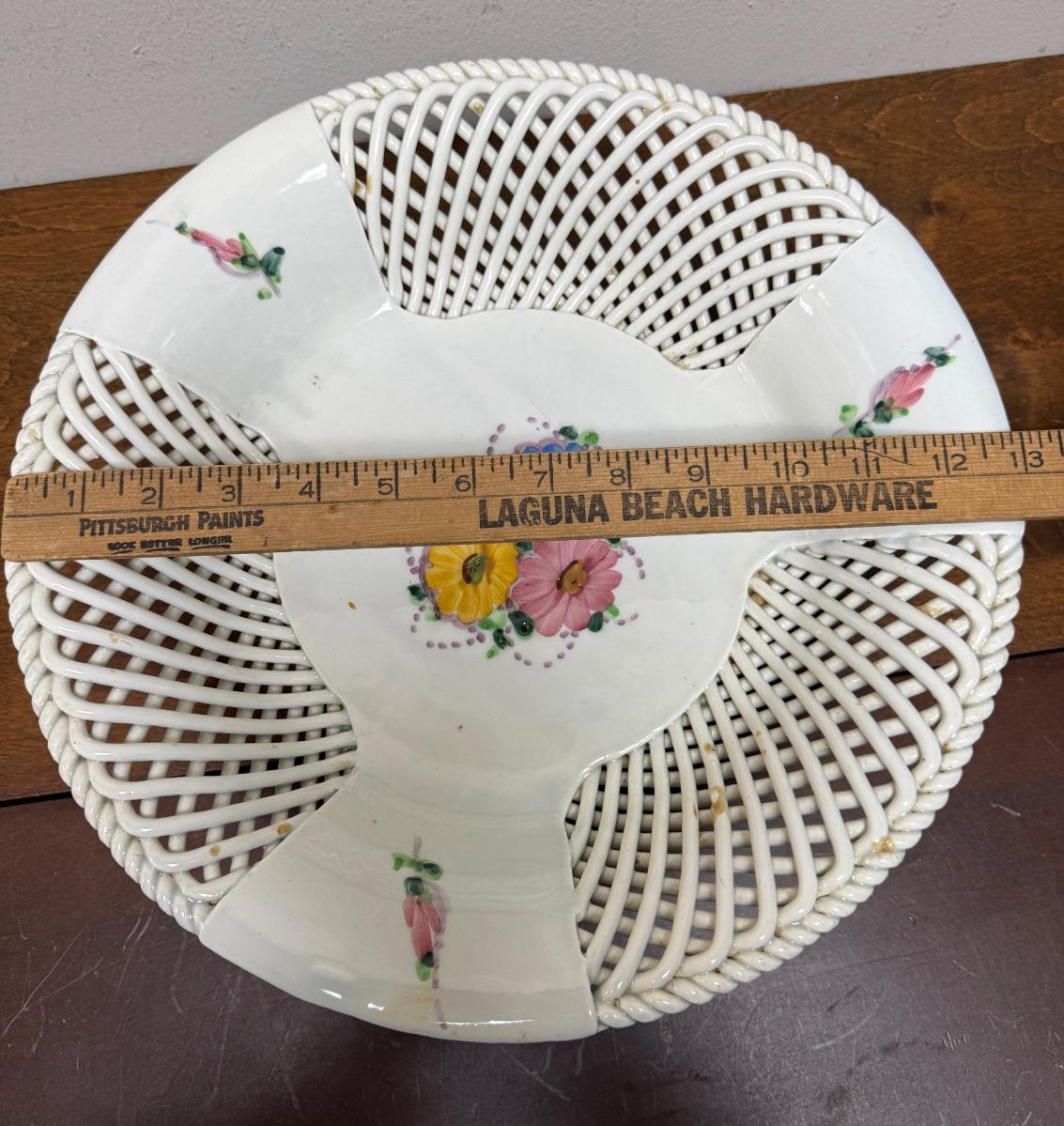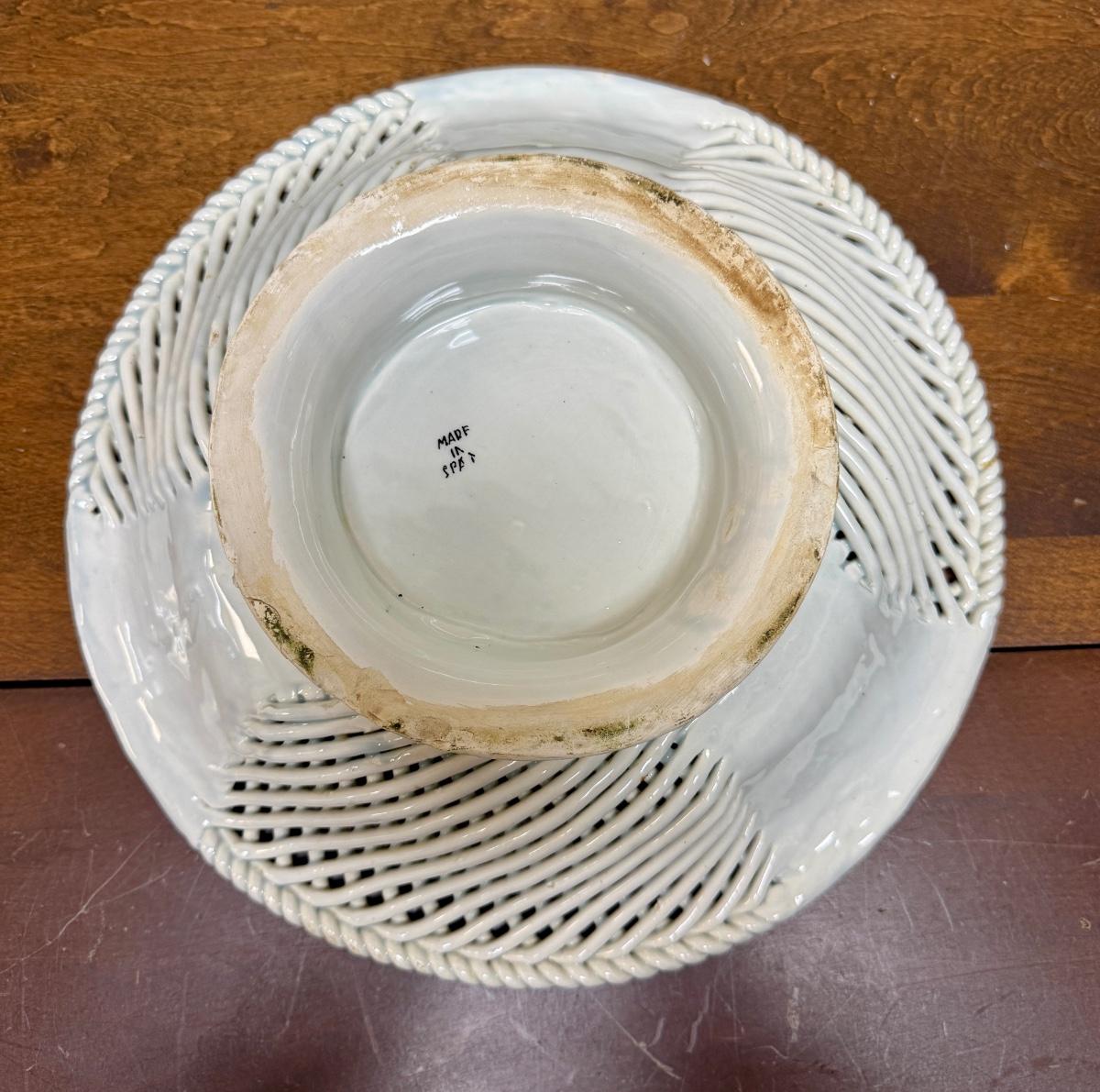 Beautiful lattice work, good to fair condition, there are a few spots where the glazing is worn through to the bare porcelain. Approx. 13" across. Made in Spain.