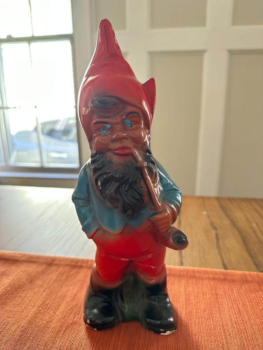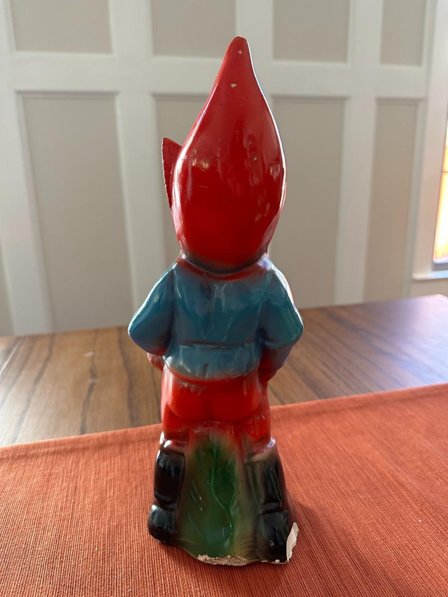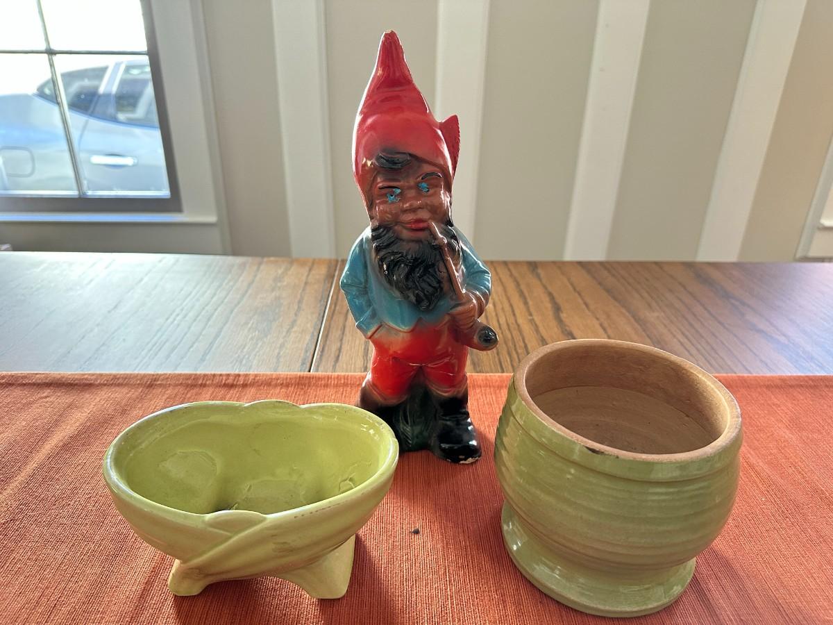 Gnome has chips and blue putty on his eyes that can be removed, 12"h. Green round pot is 5"w x 5". Other green pot is 6.6"L