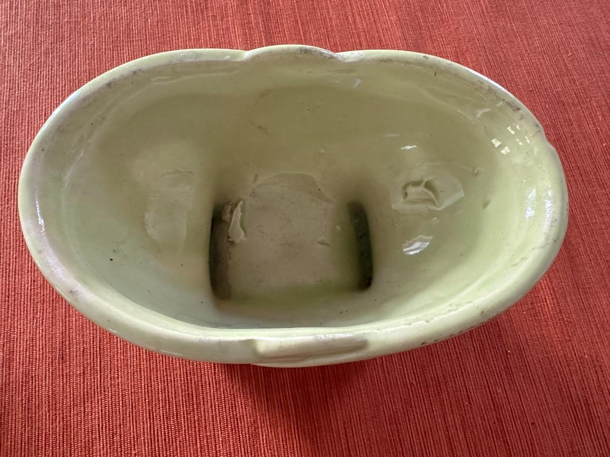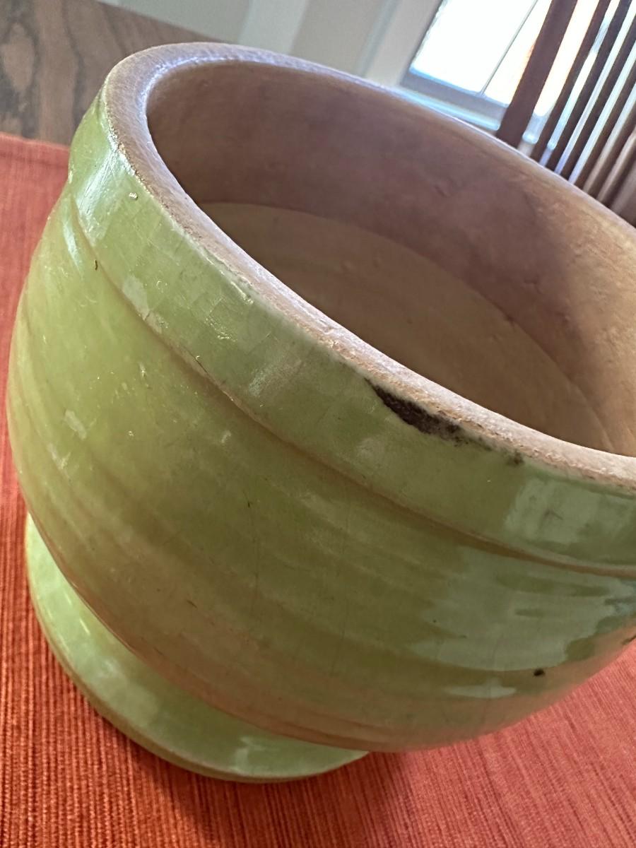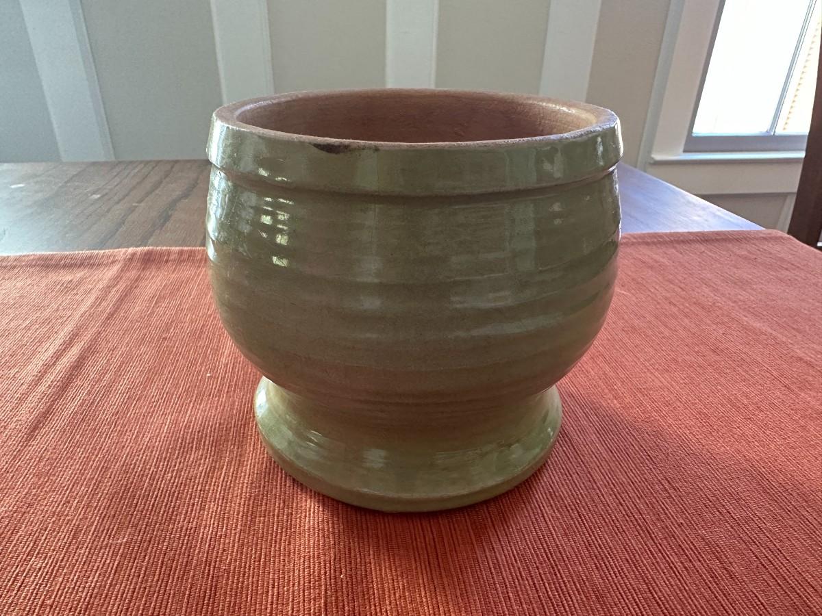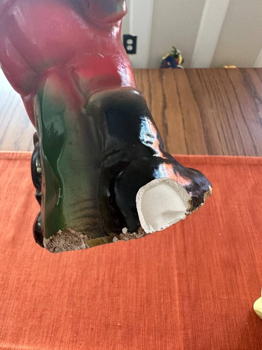 Gnome has chips and blue putty on his eyes that can be removed, 12"h. Green round pot is 5"w x 5". Other green pot is 6.6"L