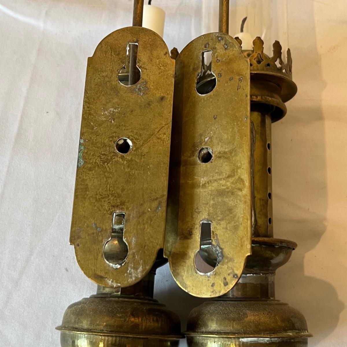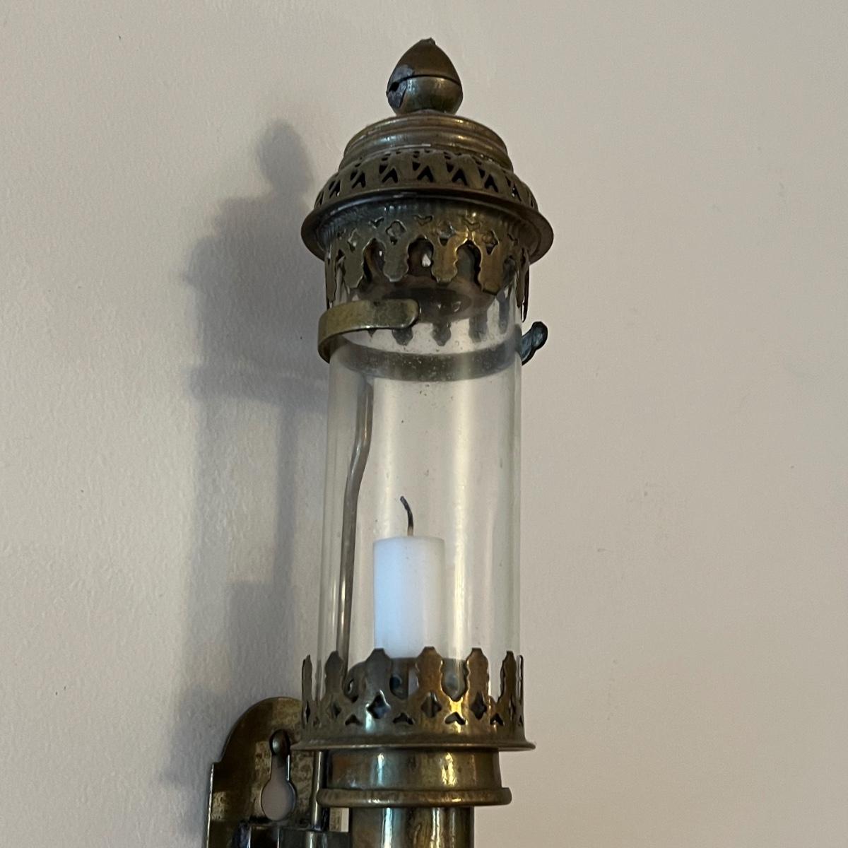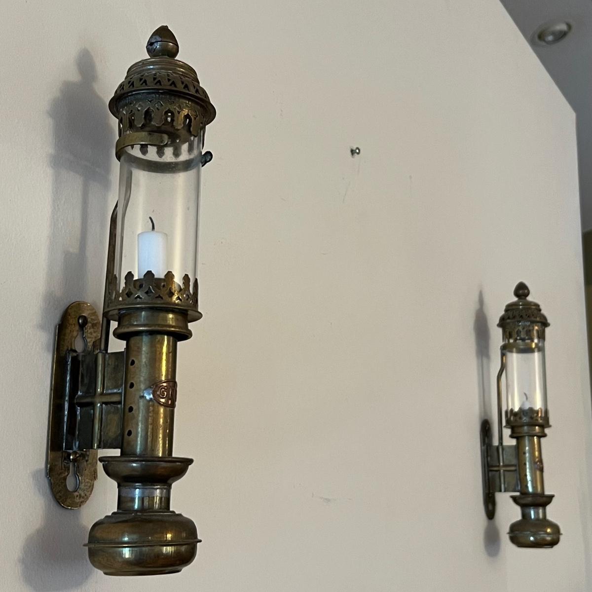 A matching pair of GNR brass sconces. Both house candles and were mounted on the wall, but have been taken down, along with included screws, ready for their new home. Note that the finial is unattached on one sconce, it can just rest in place or be glued back on.