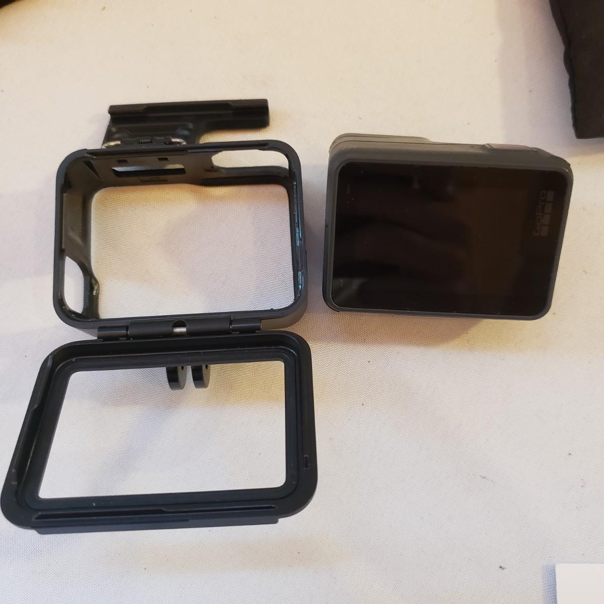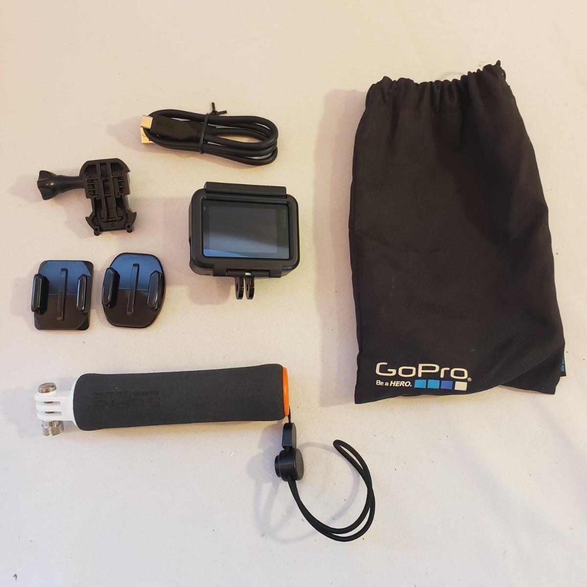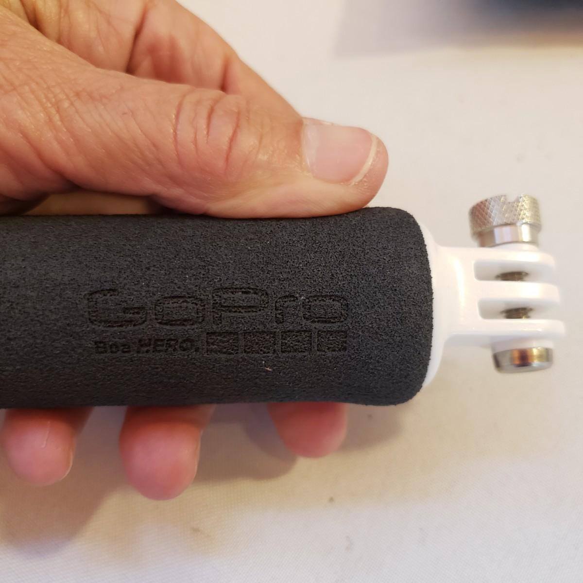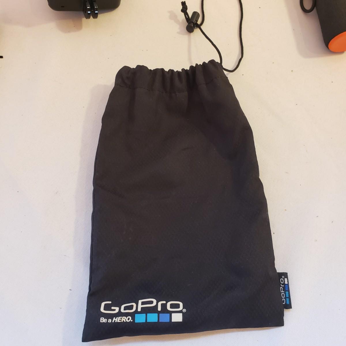 This Go Pro camera measures approximately 3" x 1" x 3"H. It comes with foam grip stick, two mounting brackets and mounting device that attaches to the stick, a USB power cord and a cinch bag. The camera powers on.