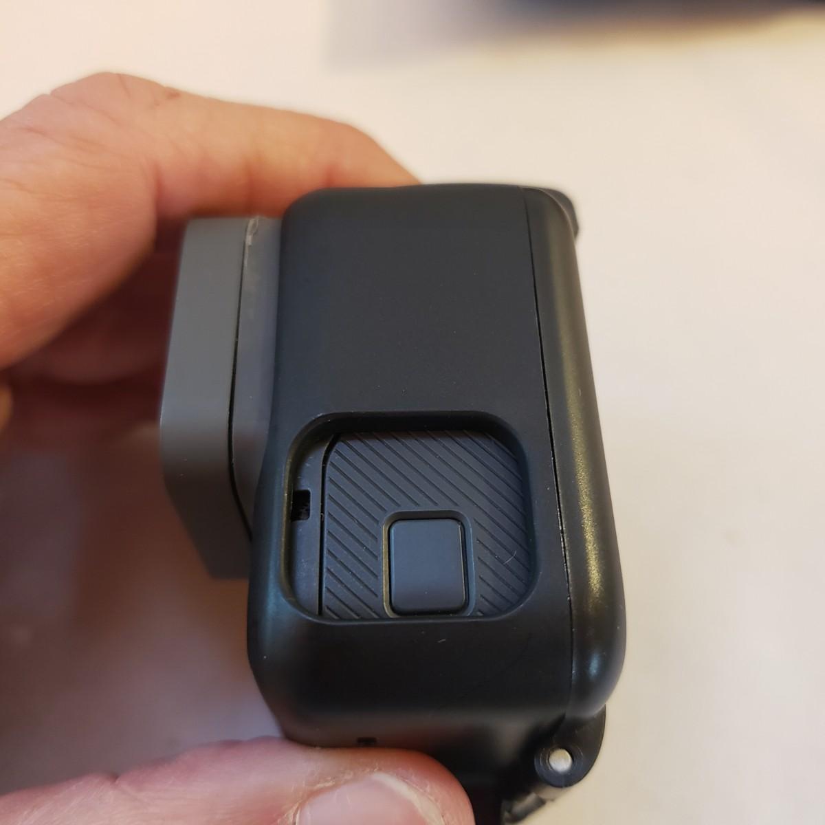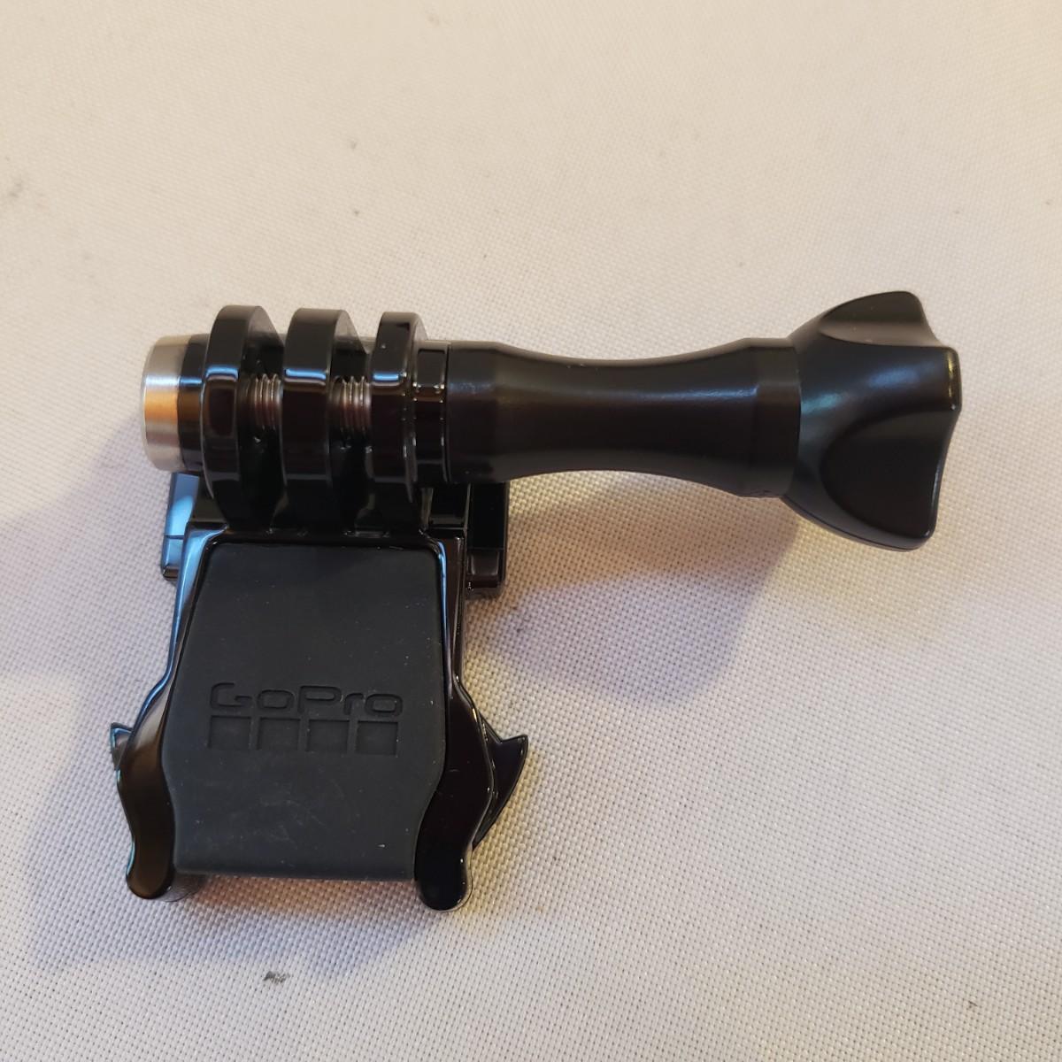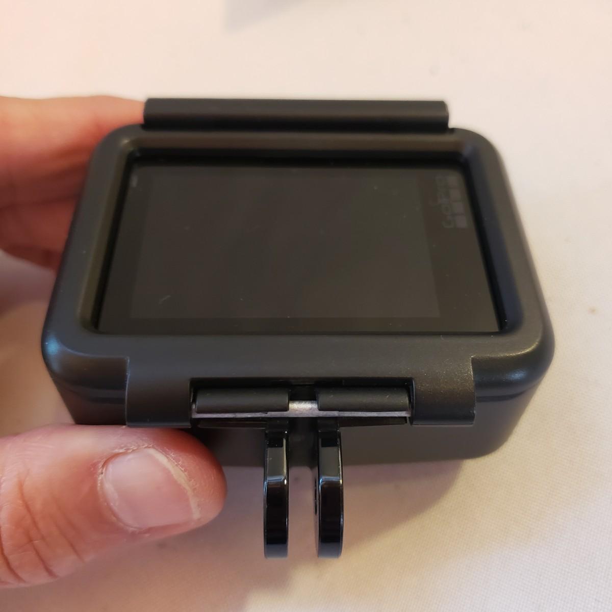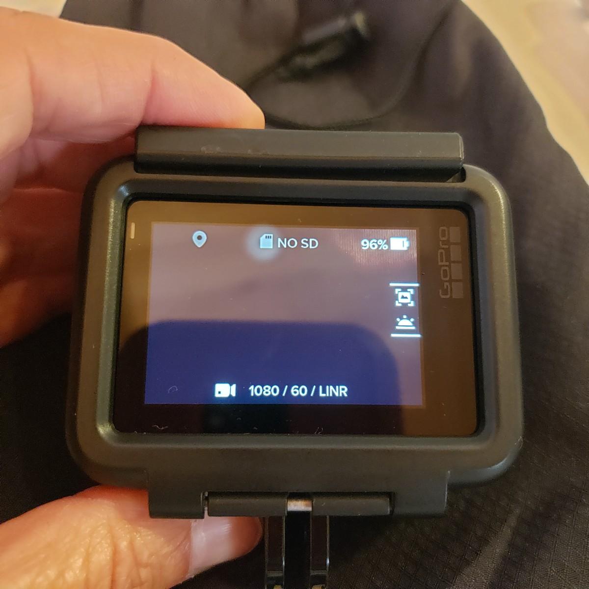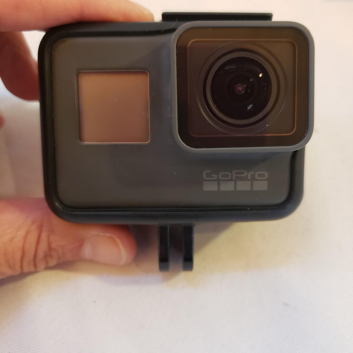 This Go Pro camera measures approximately 3" x 1" x 3"H. It comes with foam grip stick, two mounting brackets and mounting device that attaches to the stick, a USB power cord and a cinch bag. The camera powers on.