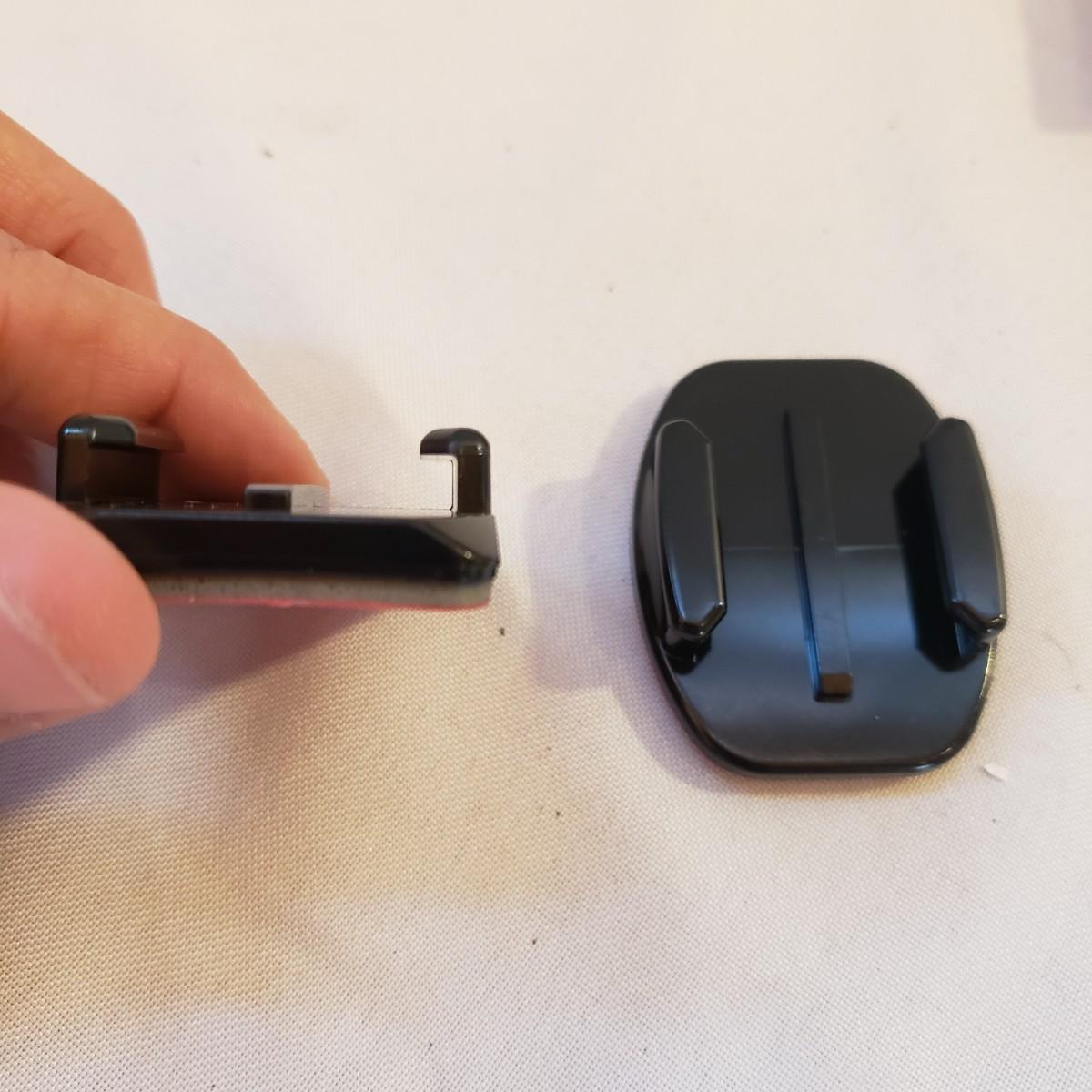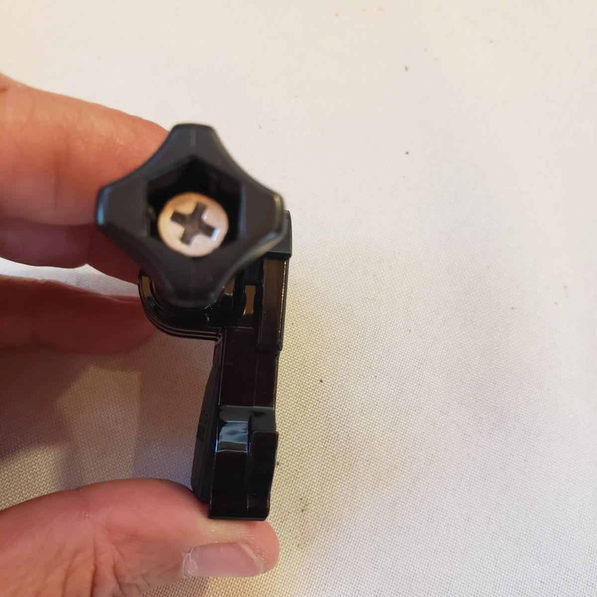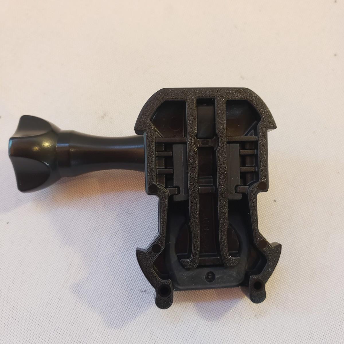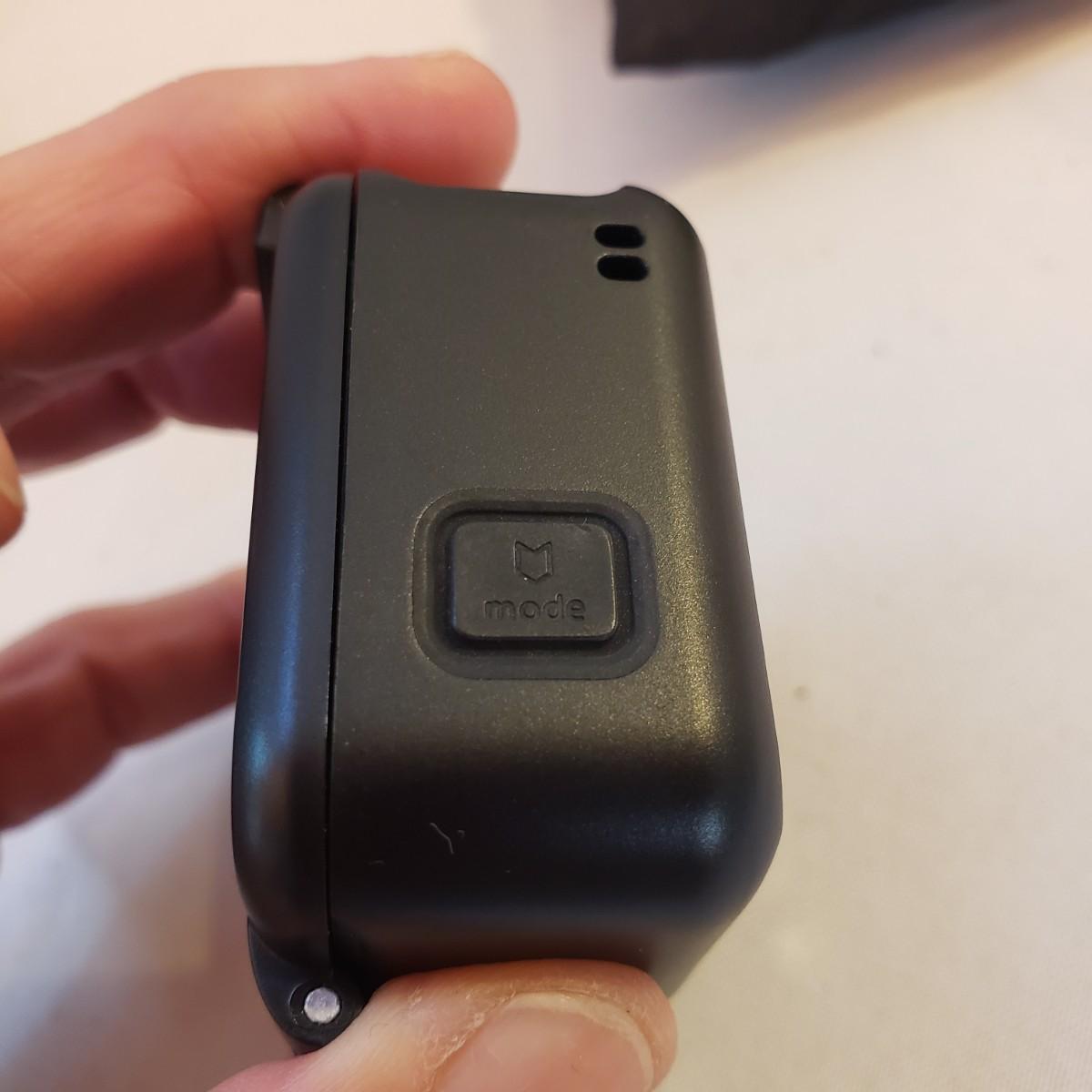This Go Pro camera measures approximately 3" x 1" x 3"H. It comes with foam grip stick, two mounting brackets and mounting device that attaches to the stick, a USB power cord and a cinch bag. The camera powers on.