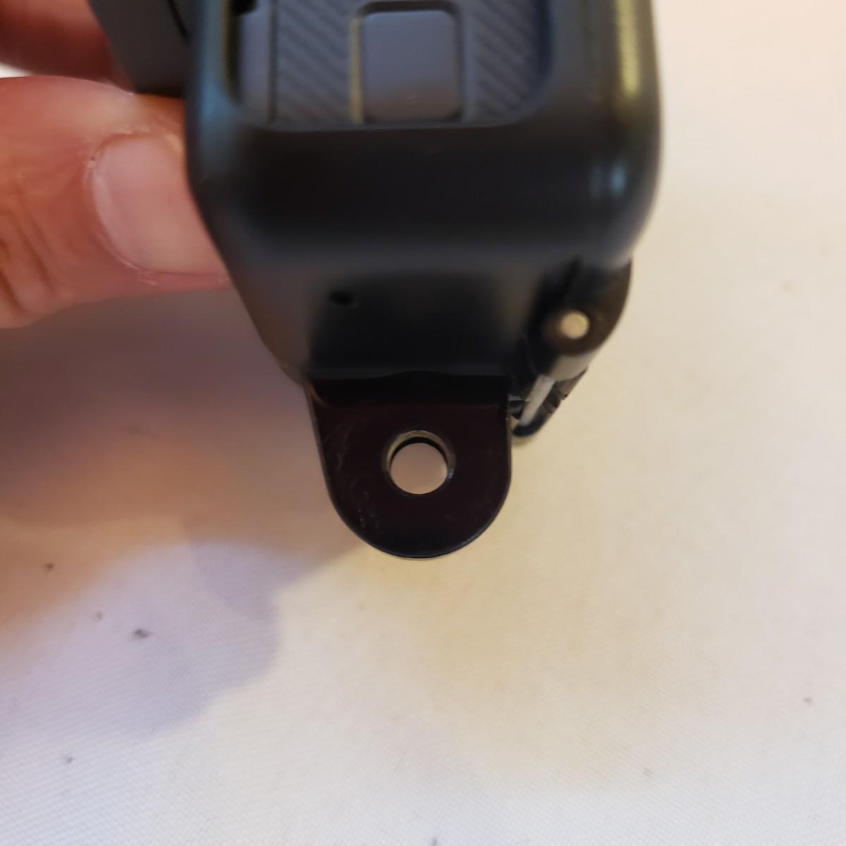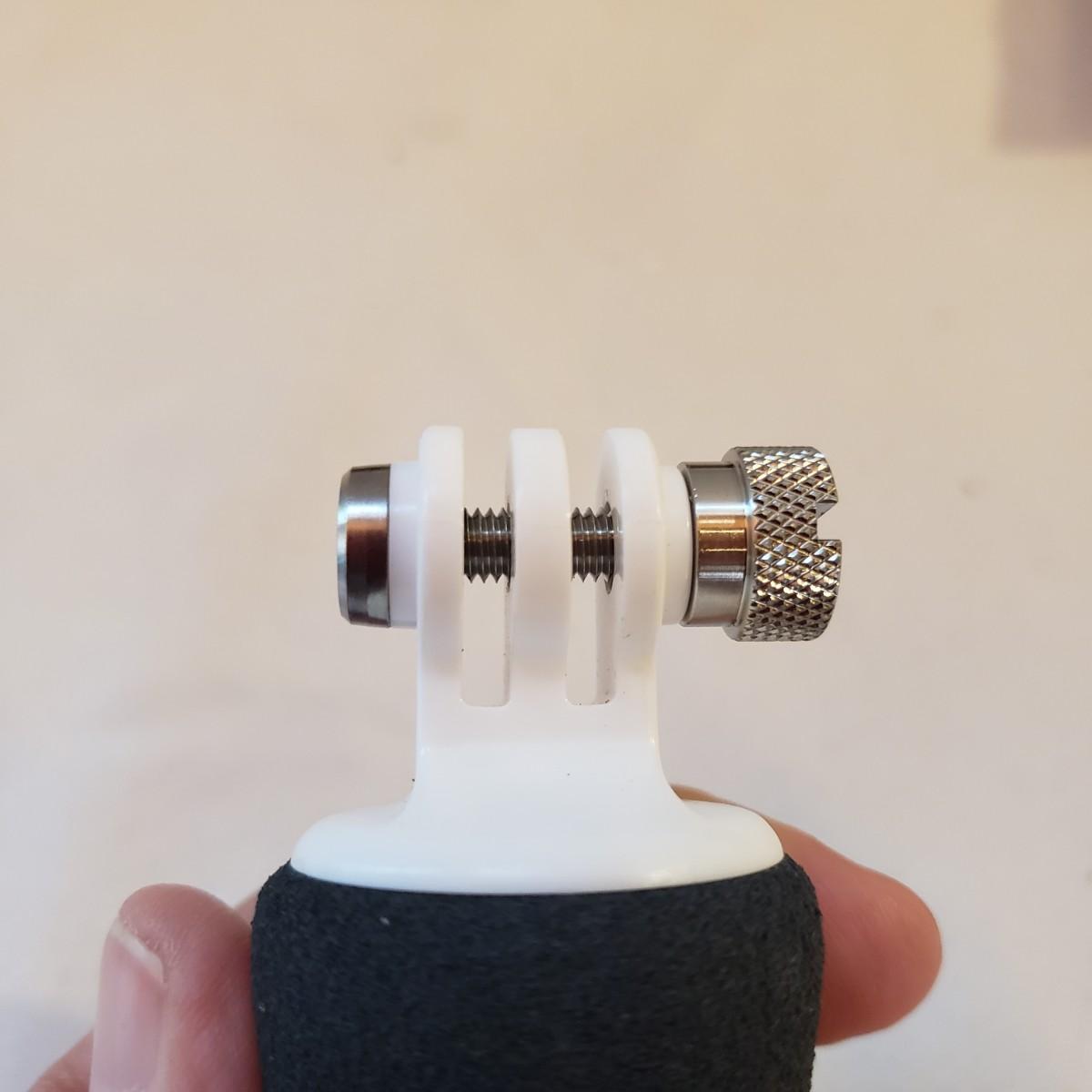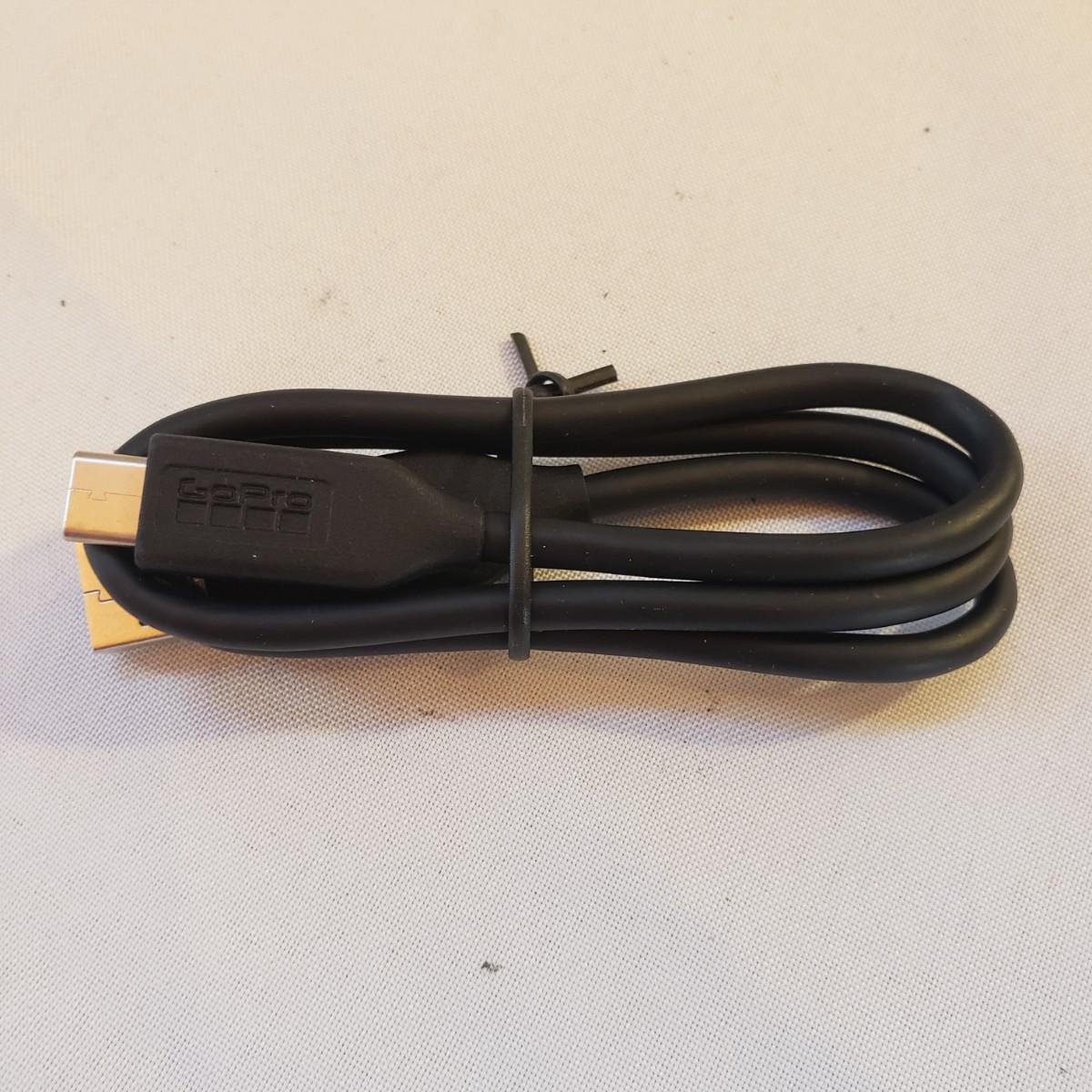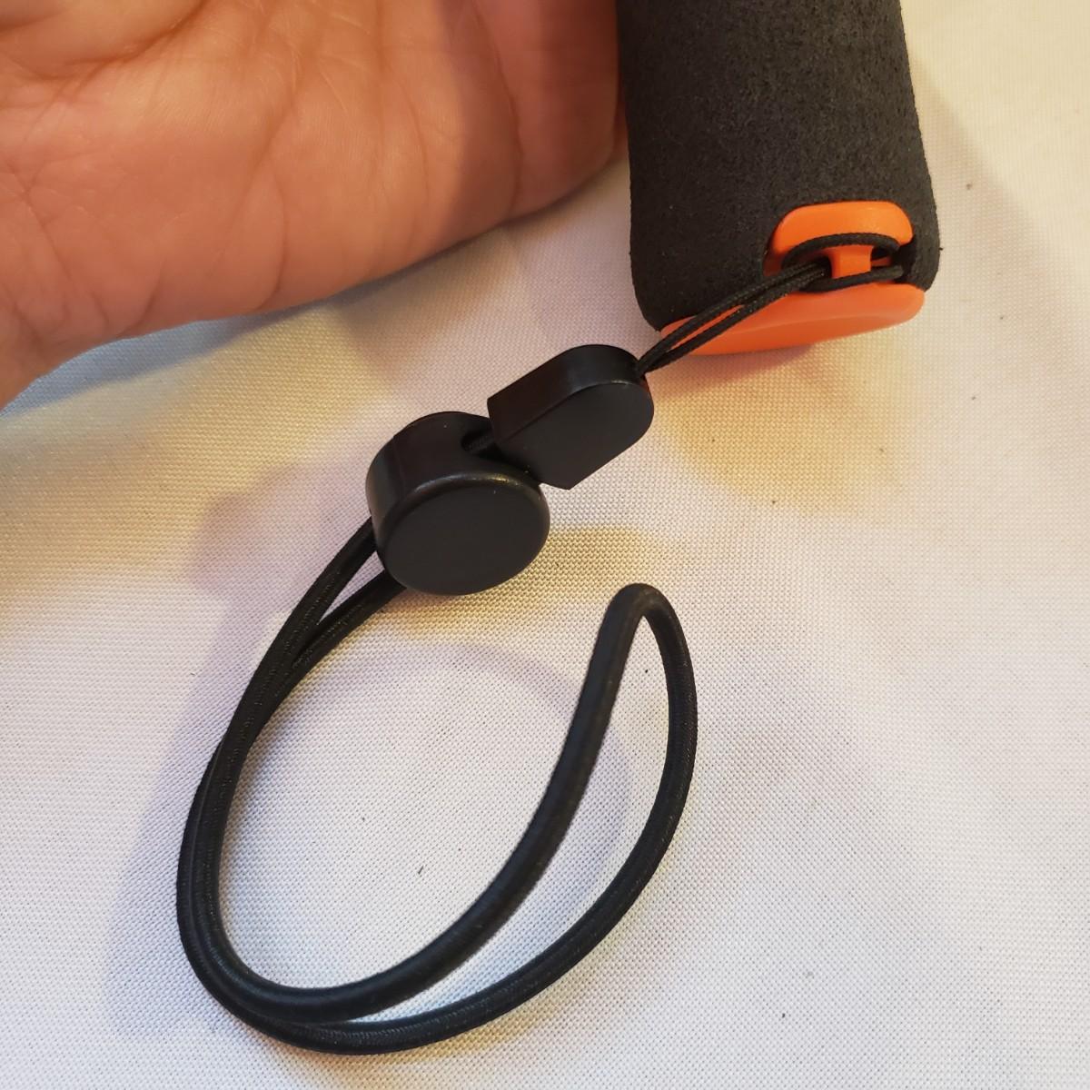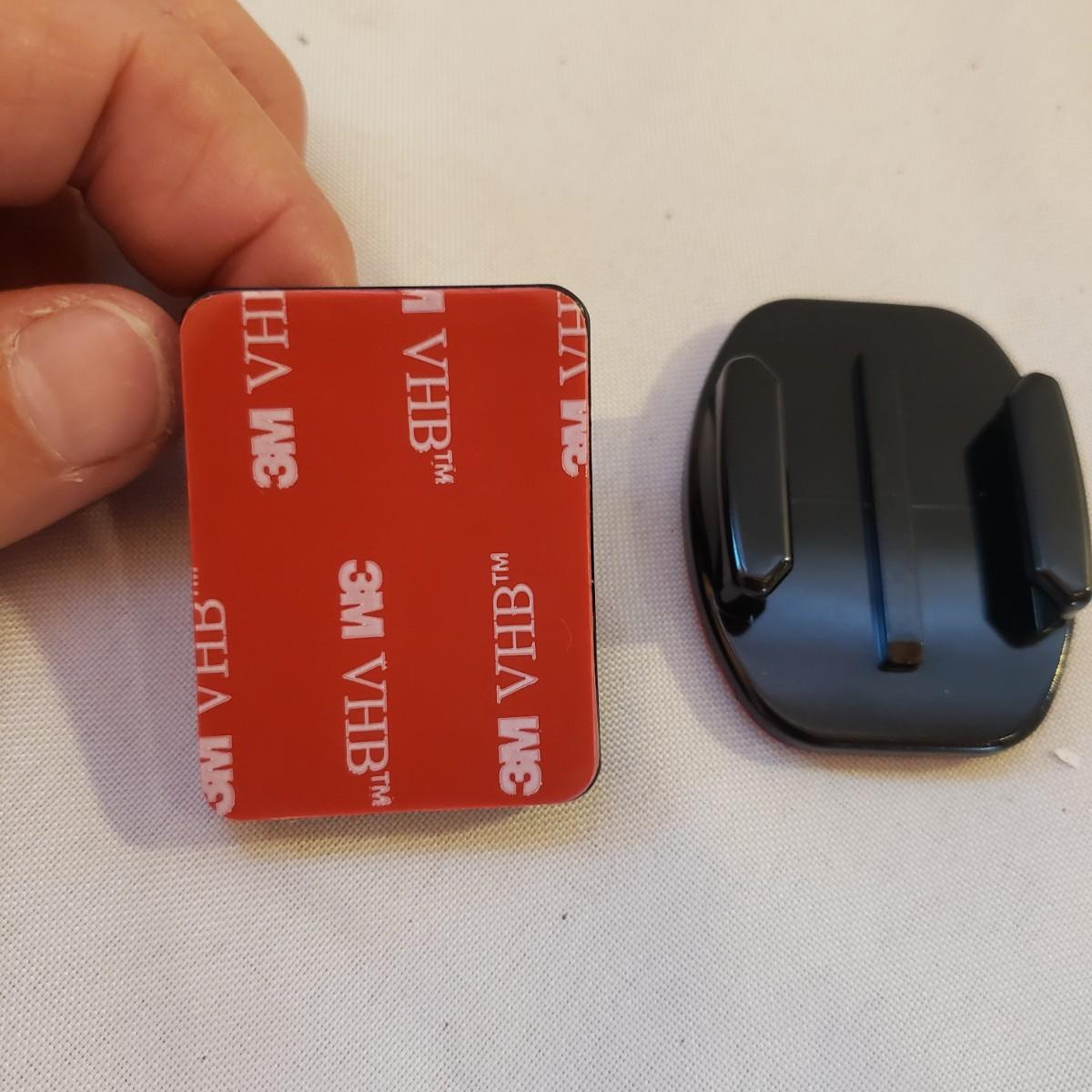 This Go Pro camera measures approximately 3" x 1" x 3"H. It comes with foam grip stick, two mounting brackets and mounting device that attaches to the stick, a USB power cord and a cinch bag. The camera powers on.