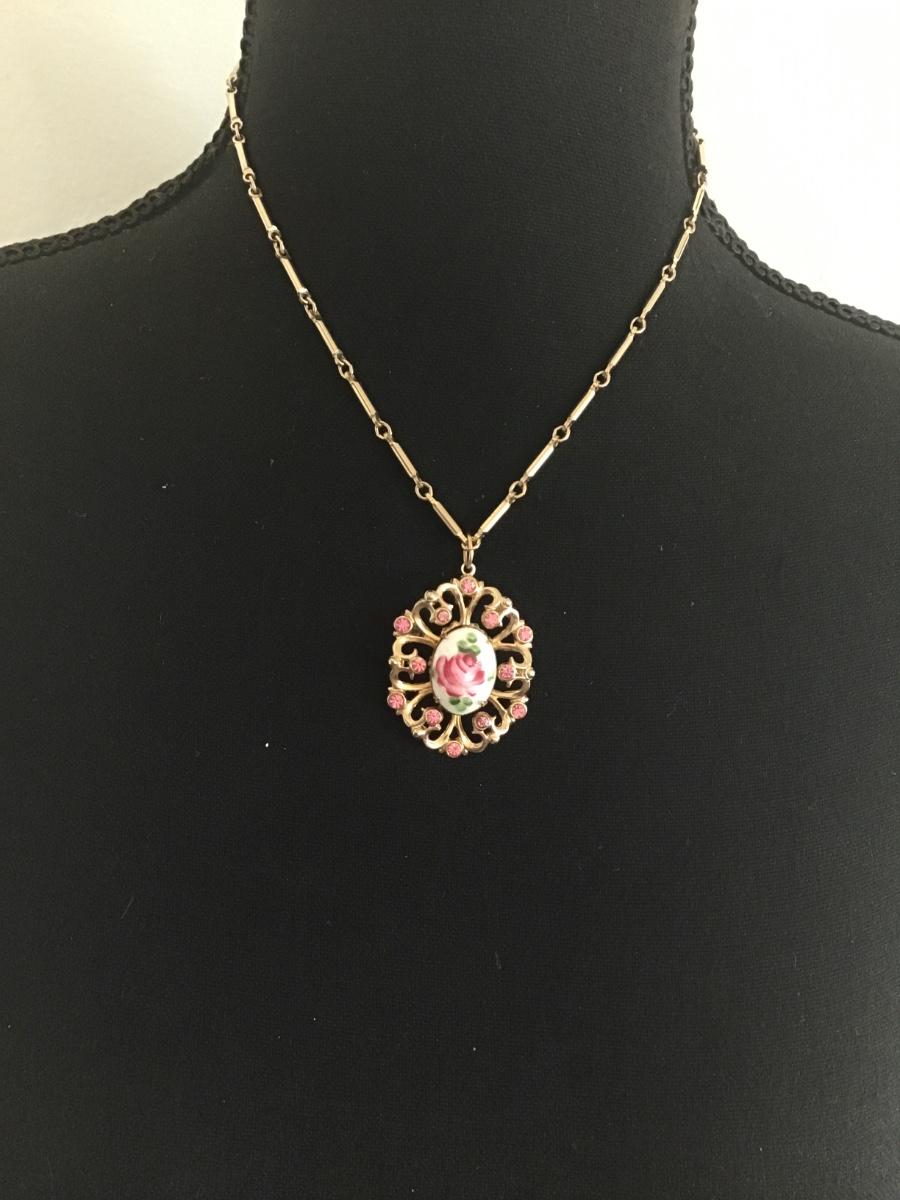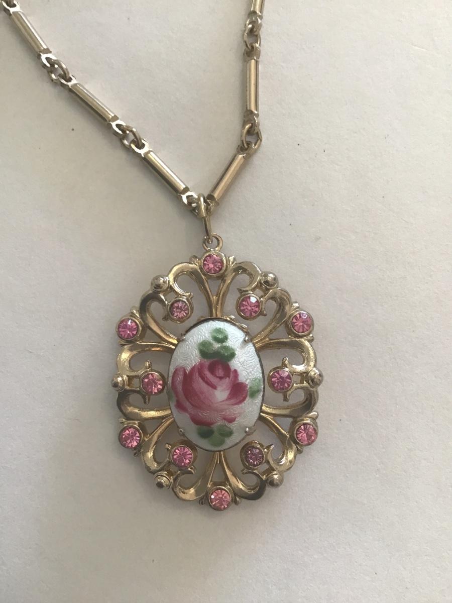Go, Tom necklace and white Guilloche Enamel pendant with pink rhinestones