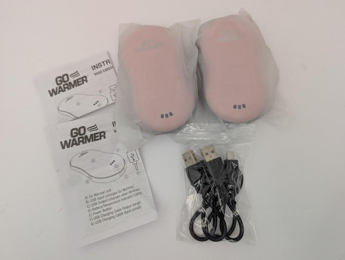 Set of two Go Warmer rechargeable hand warmers in pink, each with USB charging cables and instruction manuals. Features dual temperature settings, indicator lights, and power bank functionality for charging devices. Compact and portable design ideal for cold weather, outdoor activities, or travel. Both units are new in original packaging.