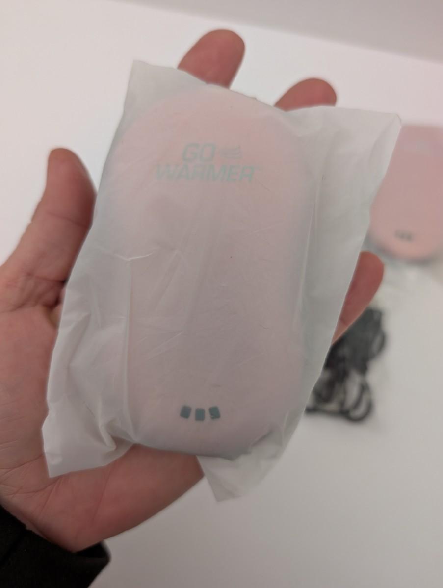 go warmer, rechargeable hand warmer, usb power bank, portable heater, pink hand warmer, winter accessories, travel gadget, cold weather gear, tech accessory, usb rechargeable, heated device, hand heating pad, outdoor gear, new in package, electronic warmer