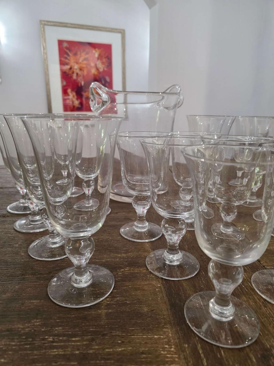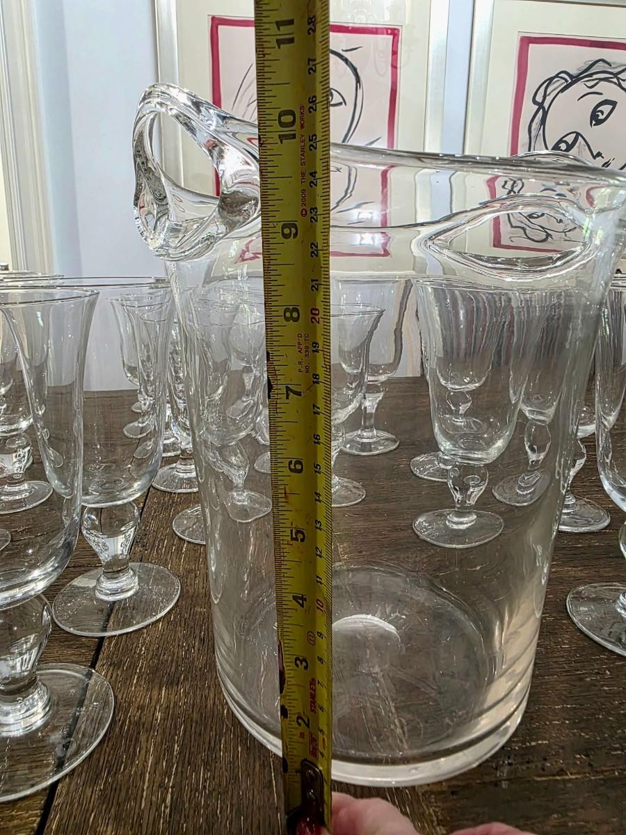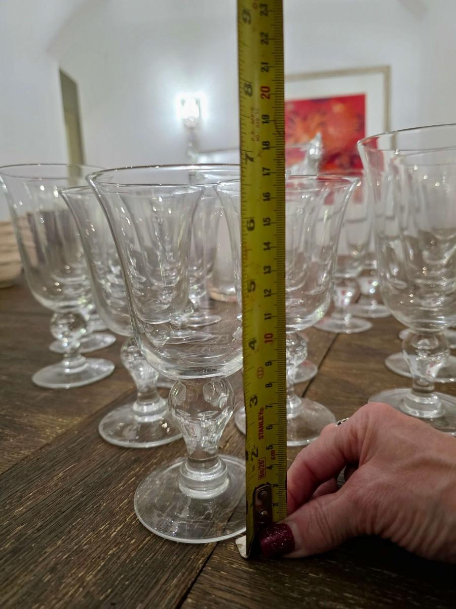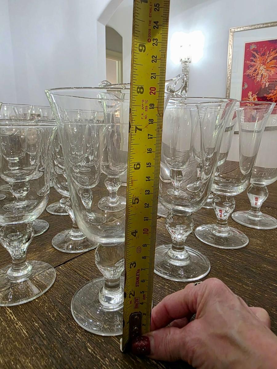 This is a lot including a glass ice bucket and 19 goblets, 2 different sizes. Please see measurements in pictures. The art you may see in the background is NOT included. You are bidding on the lot meaning you must pay for and take the entire lot.