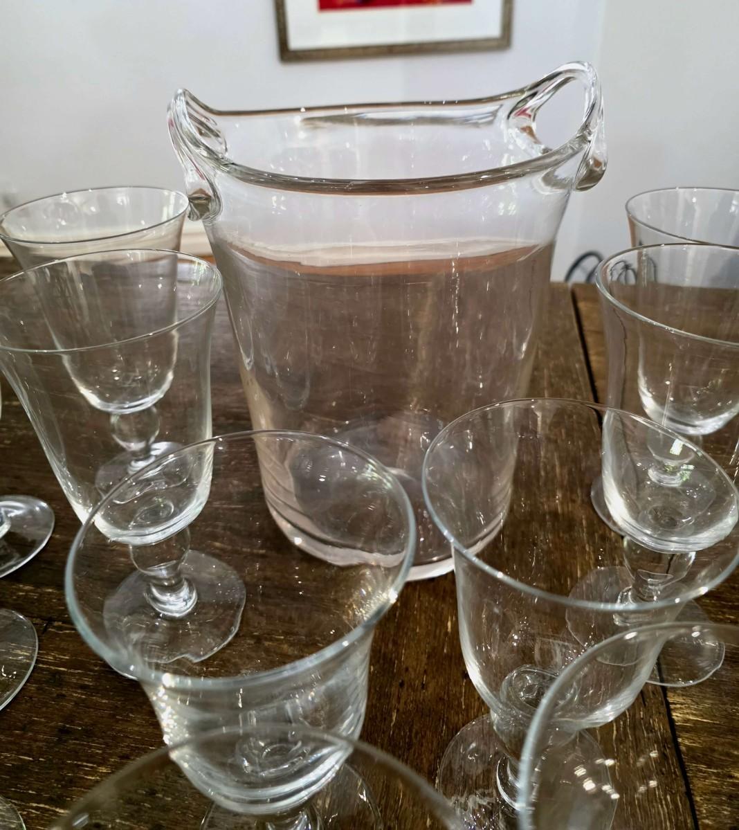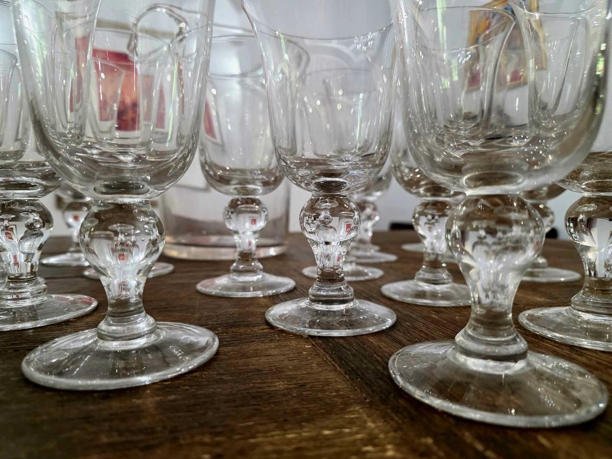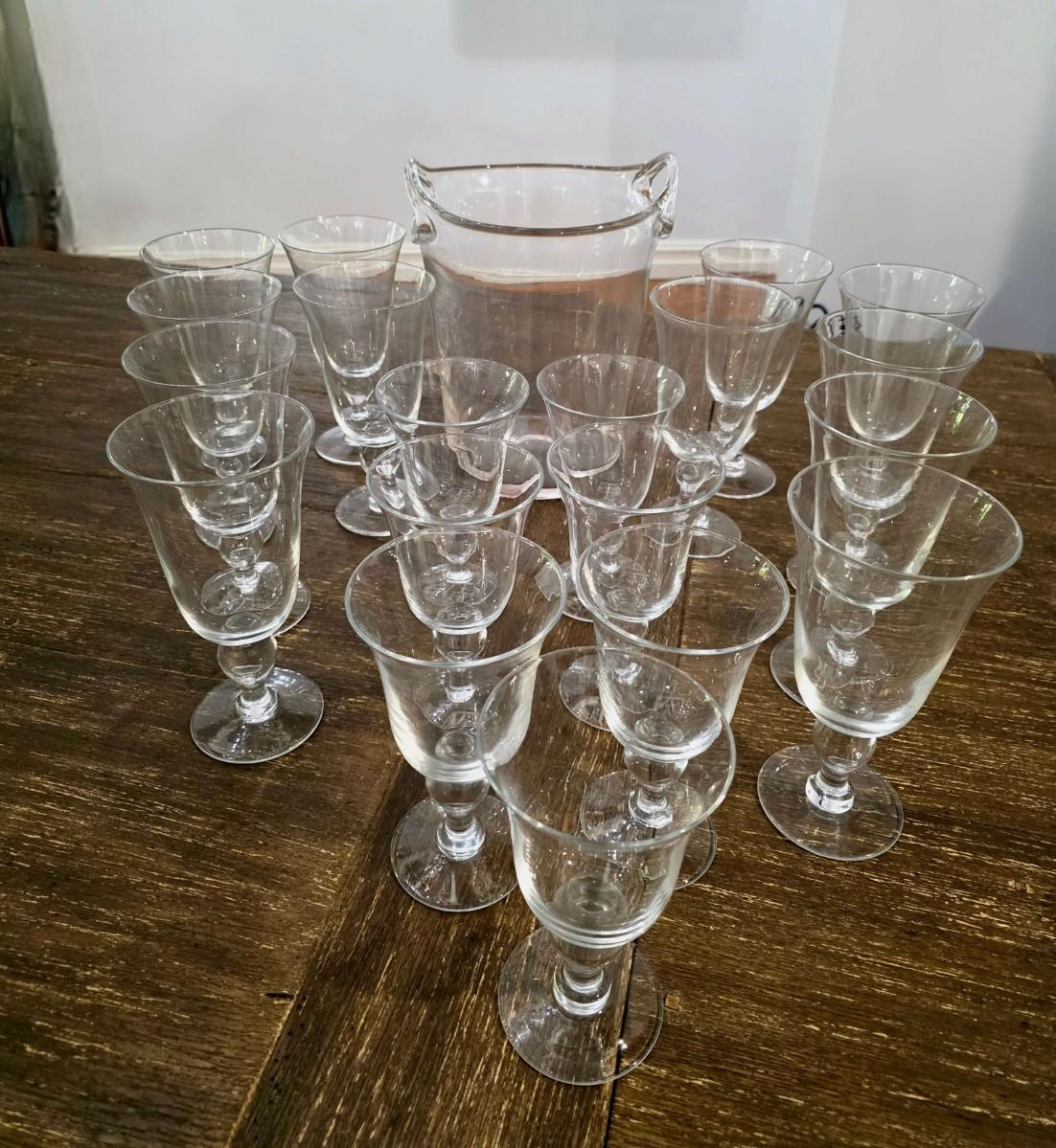 This is a lot including a glass ice bucket and 19 goblets, 2 different sizes. Please see measurements in pictures. The art you may see in the background is NOT included. You are bidding on the lot meaning you must pay for and take the entire lot.