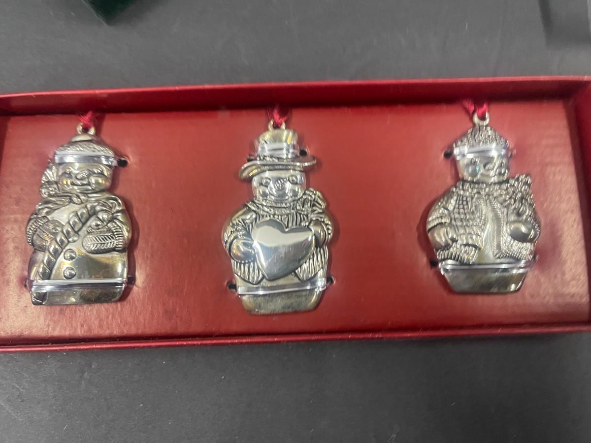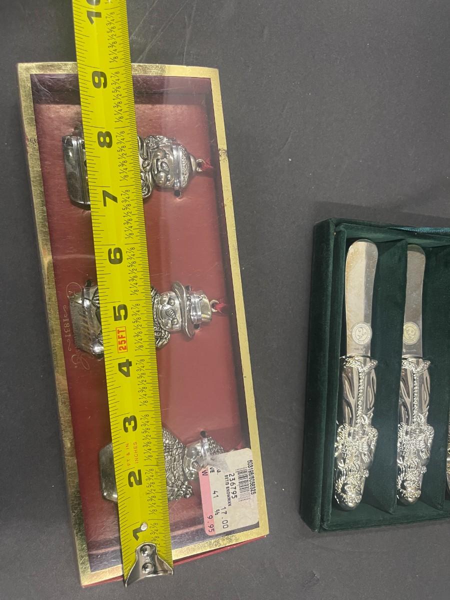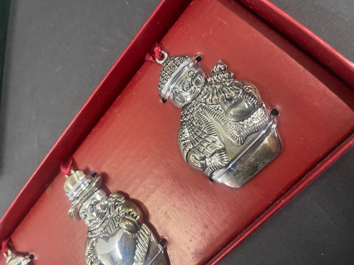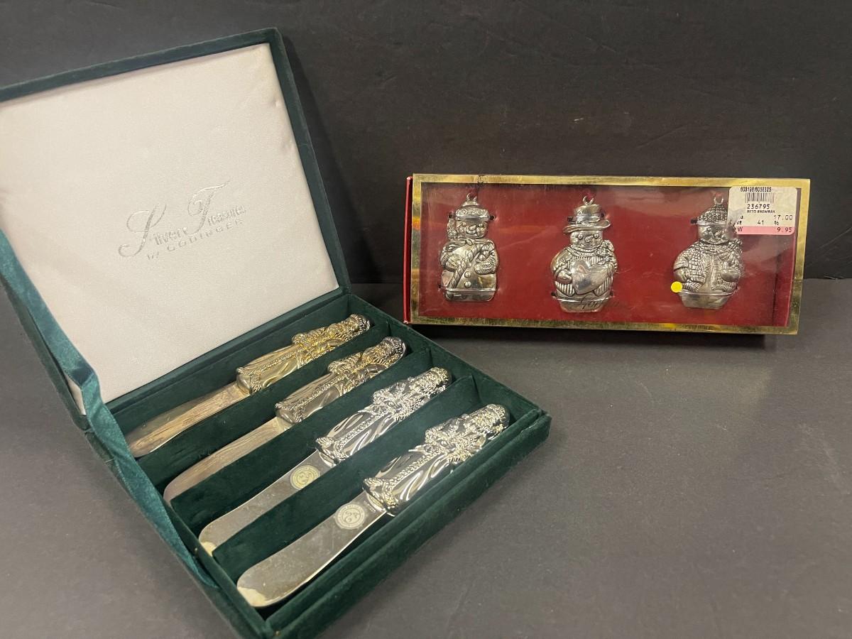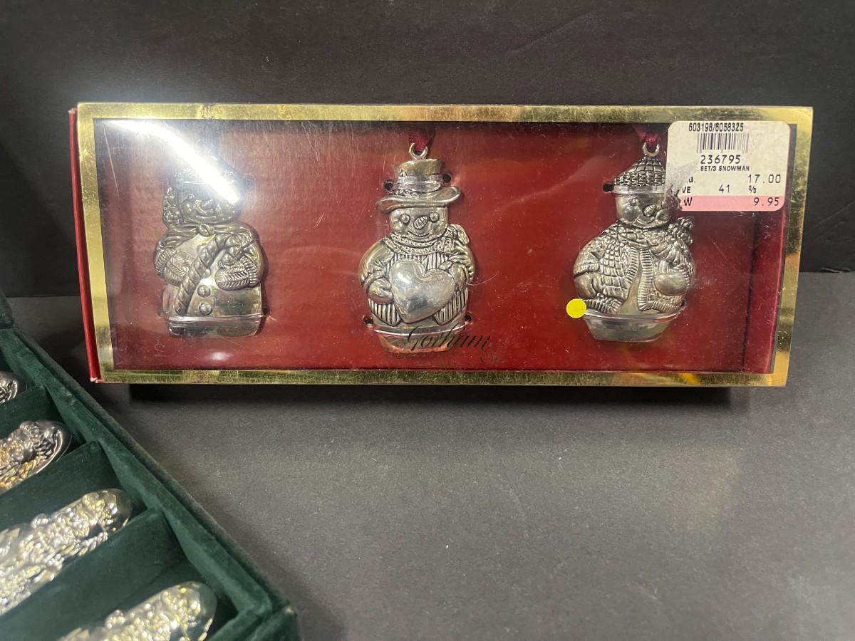 Set of Godinger silver plate Santa spreaders & Gorham set of 3 snowmen silverplate ornaments (new in box, box is damaged).