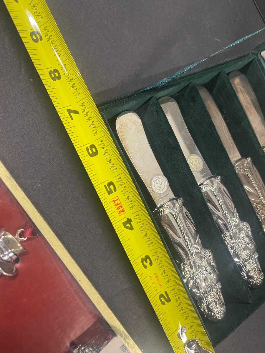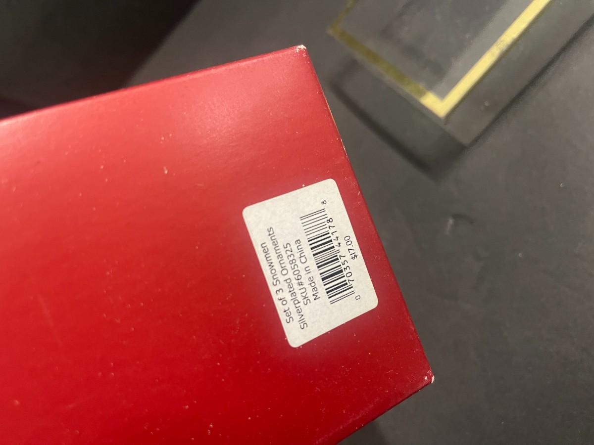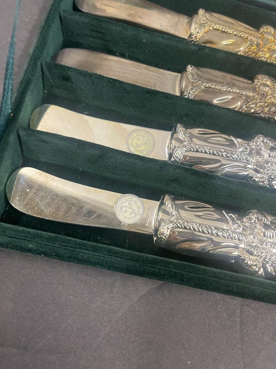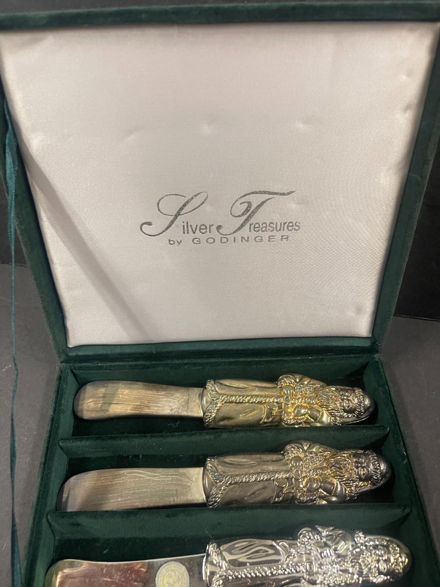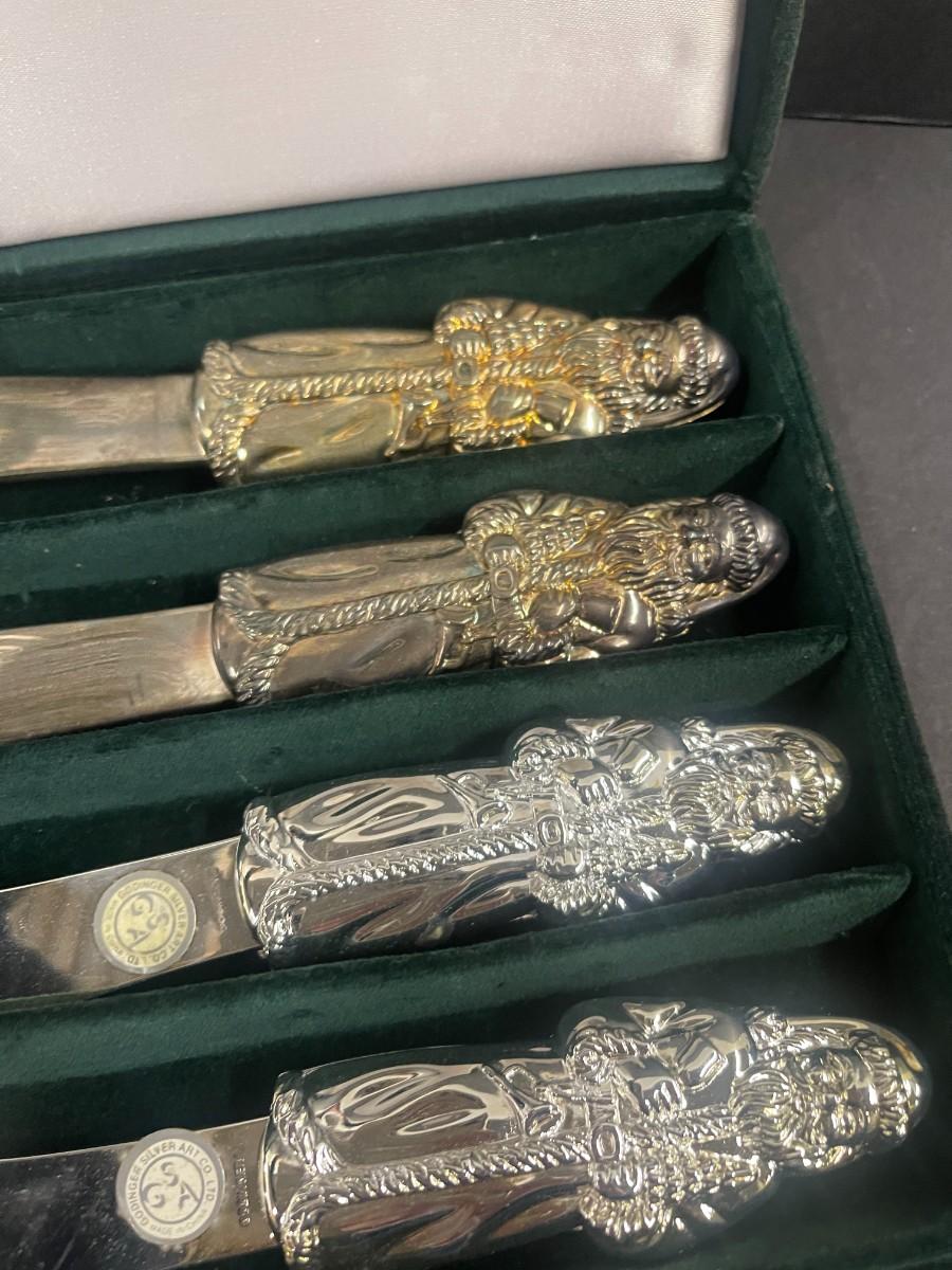 Set of Godinger silver plate Santa spreaders & Gorham set of 3 snowmen silverplate ornaments (new in box, box is damaged).