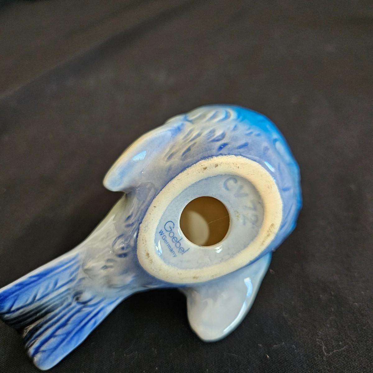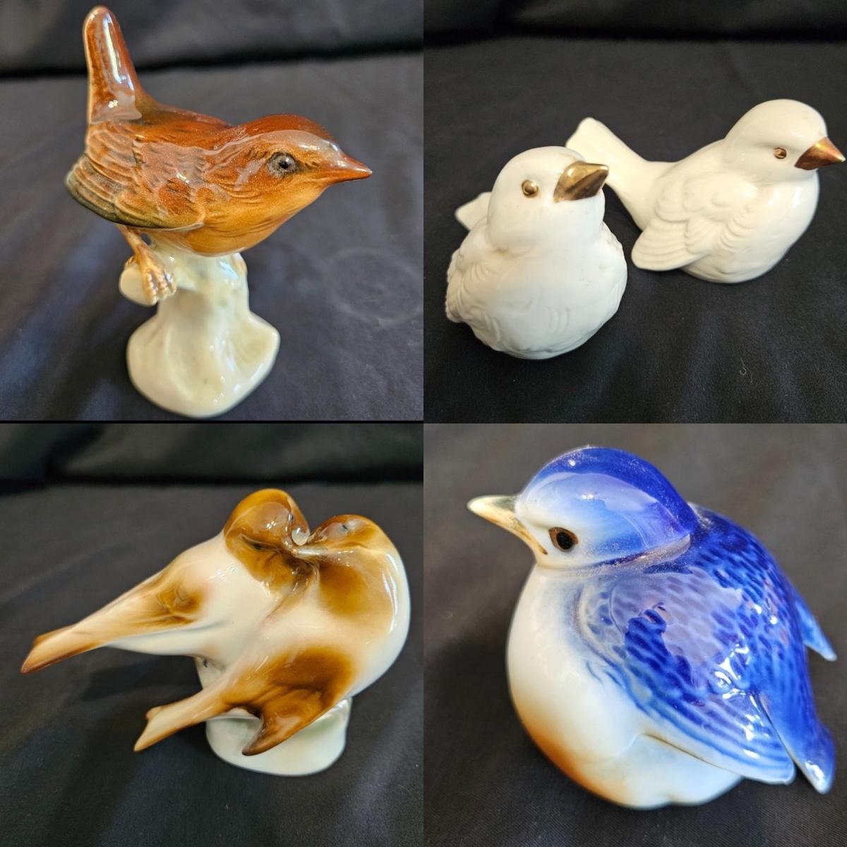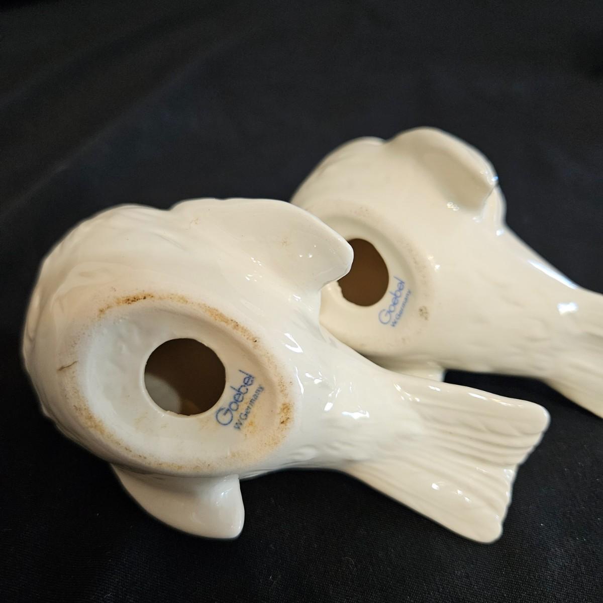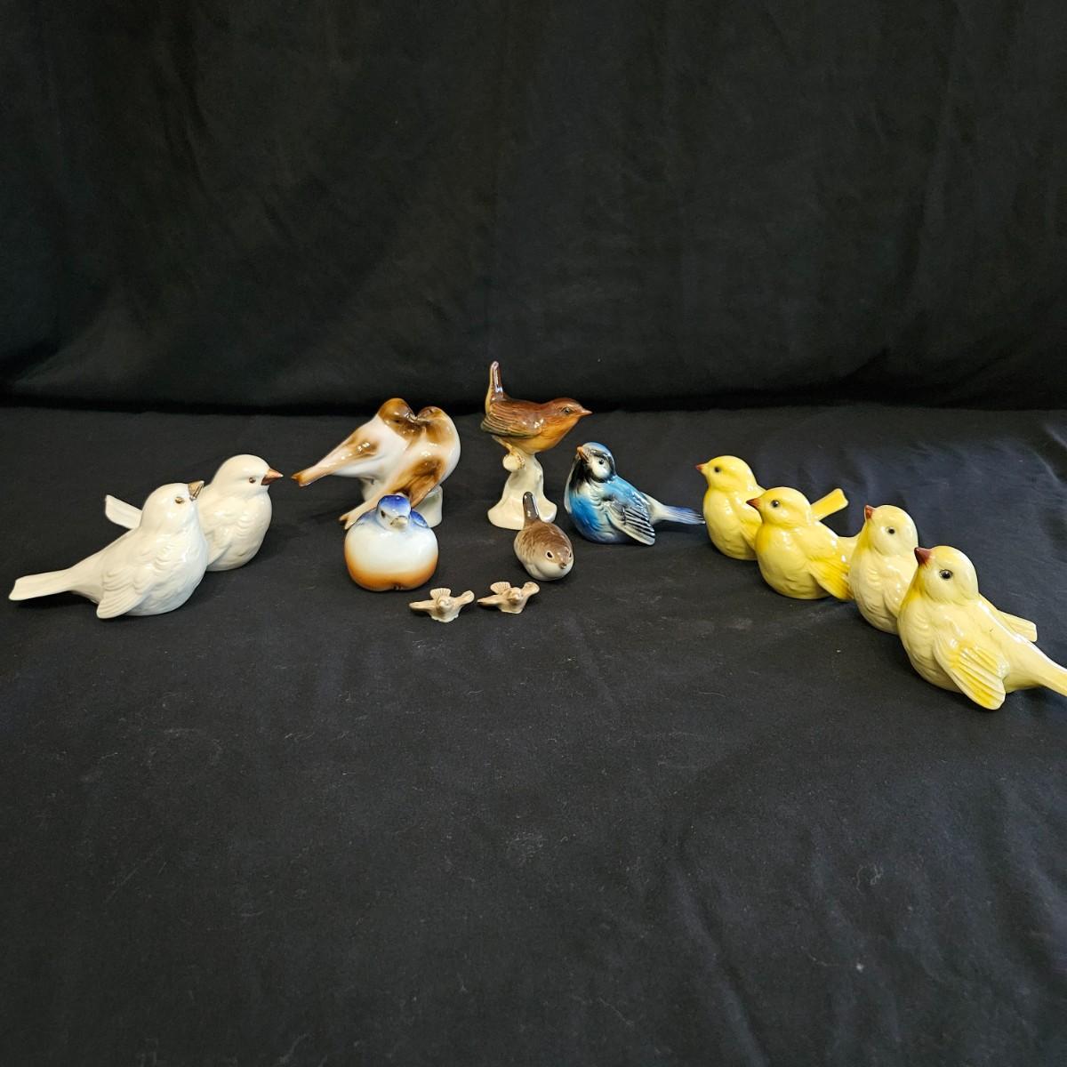 A collection of 13 ceramic birds, seven of which are manufactured by Goebel. The two smallest birds are marked Wade of England and the remainder are marked with country of origin or unmarked. The piece with two birds measures approximately 5" x 2.5" x 3.5"H. Shipping available
