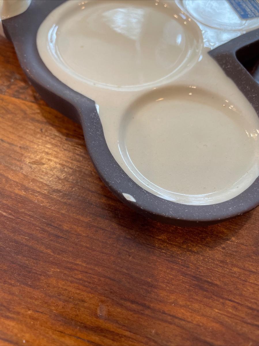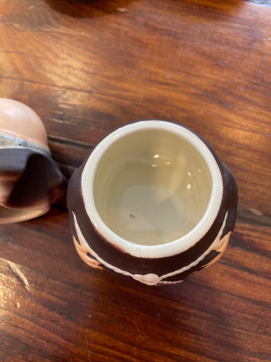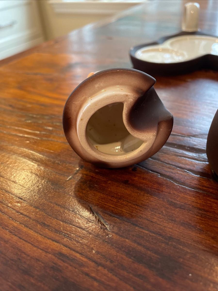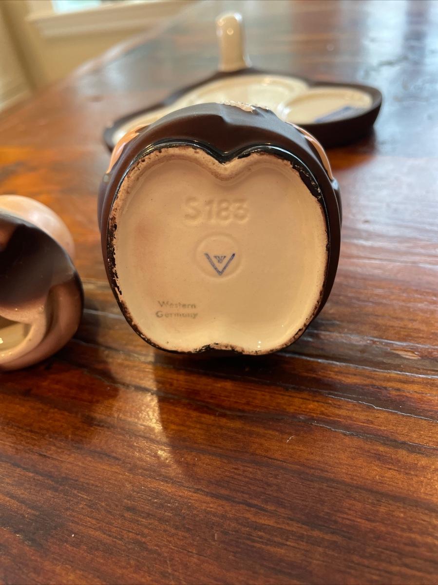 Wonderful four piece set consisting of jam jar (no spoon), tray, and salt and pepper. Two small chips shown, one on tray and the other on bottom of salt. They could use a good cleaning. Please look closely at all photos to see exact condition, they have some wear here and there.
