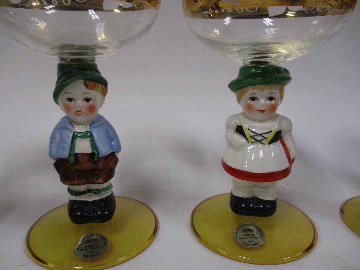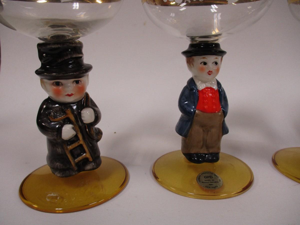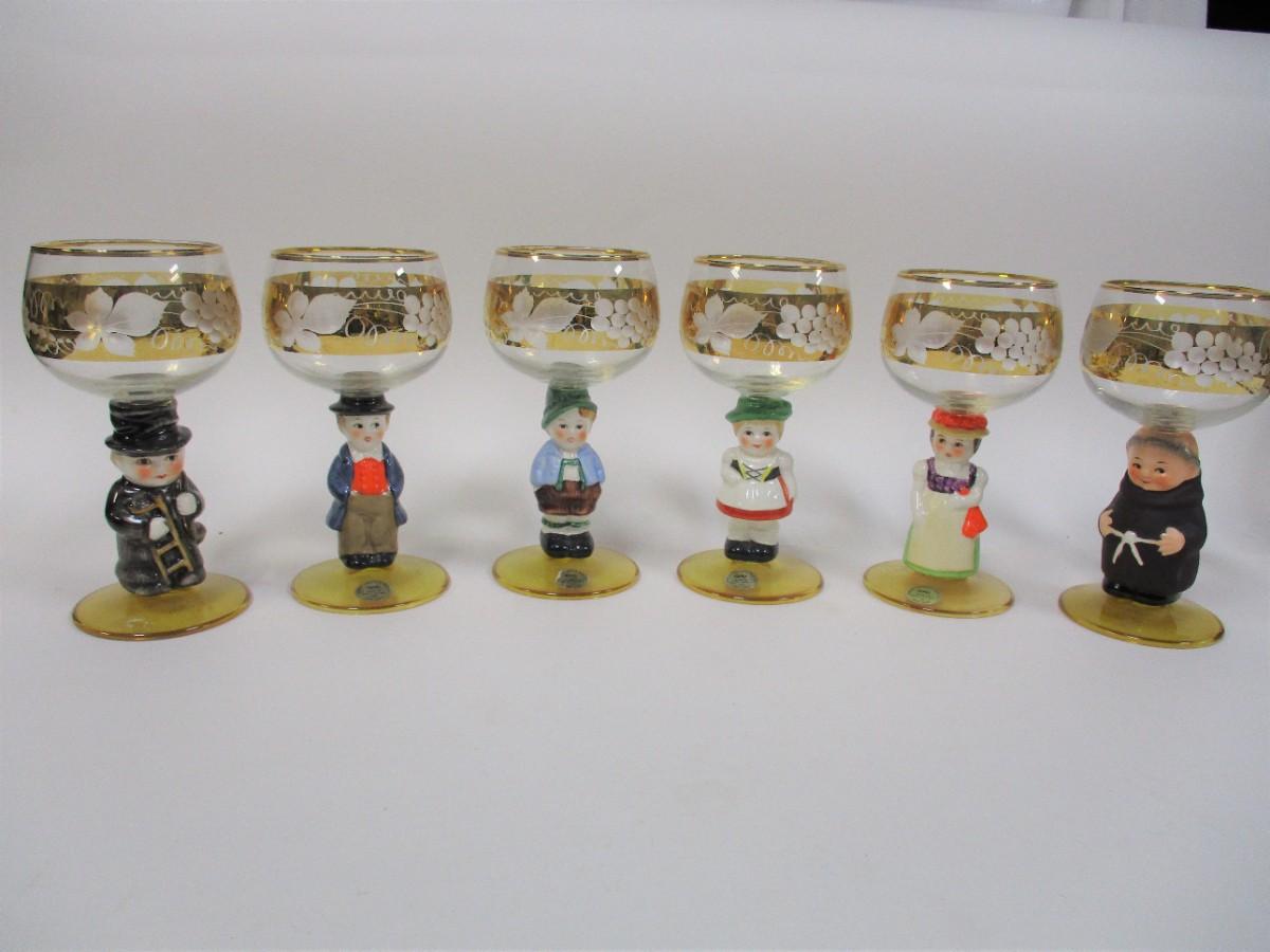 Goebel Hummel Figural Set of 6 Wine Stem Glasses 14K Gold Trim w/ Sticker Labels
