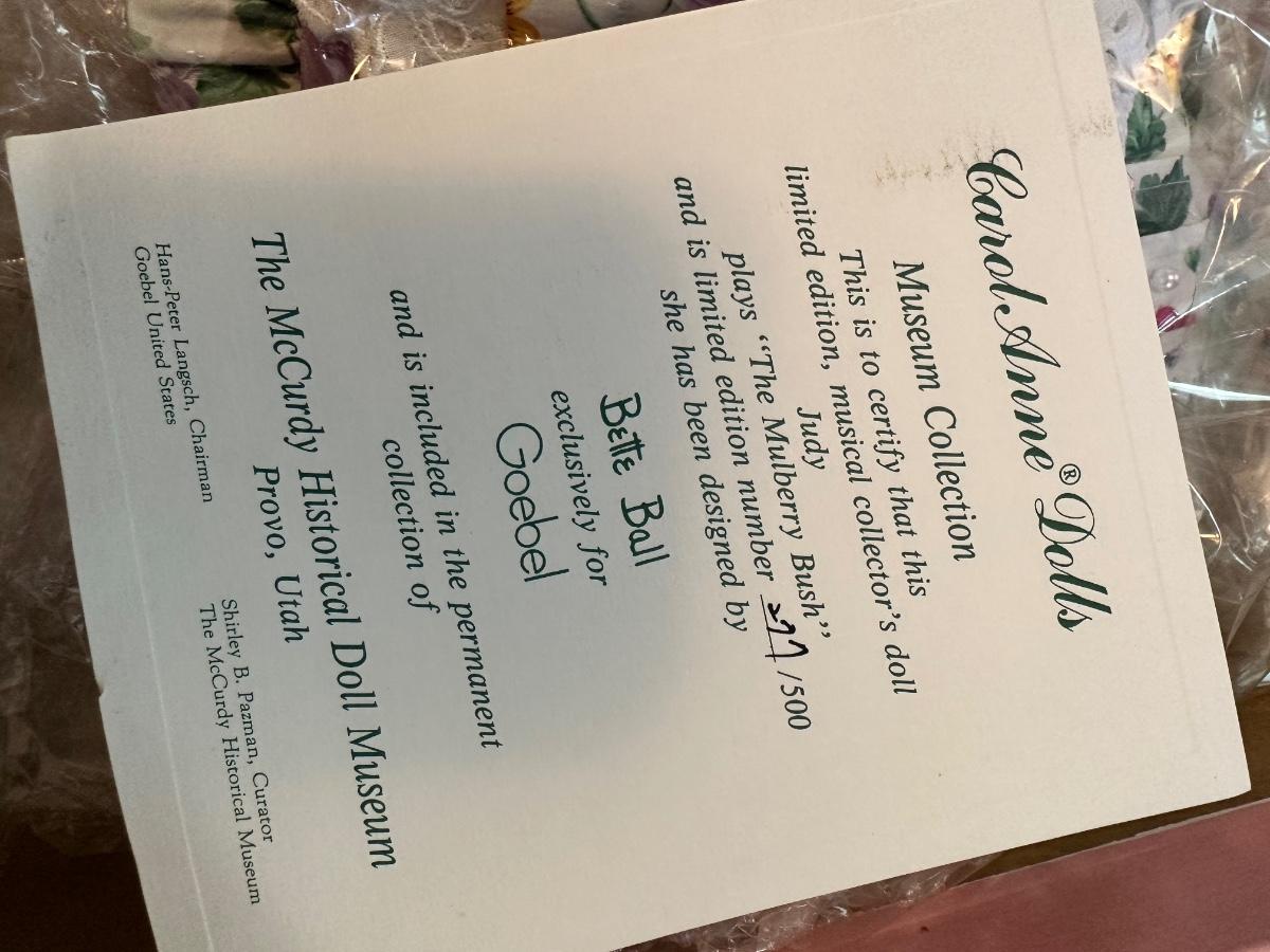 Goebel Judy Doll, 277/500, artist Bette Ball, Museum Collection, plays "The Mulberry Bush"