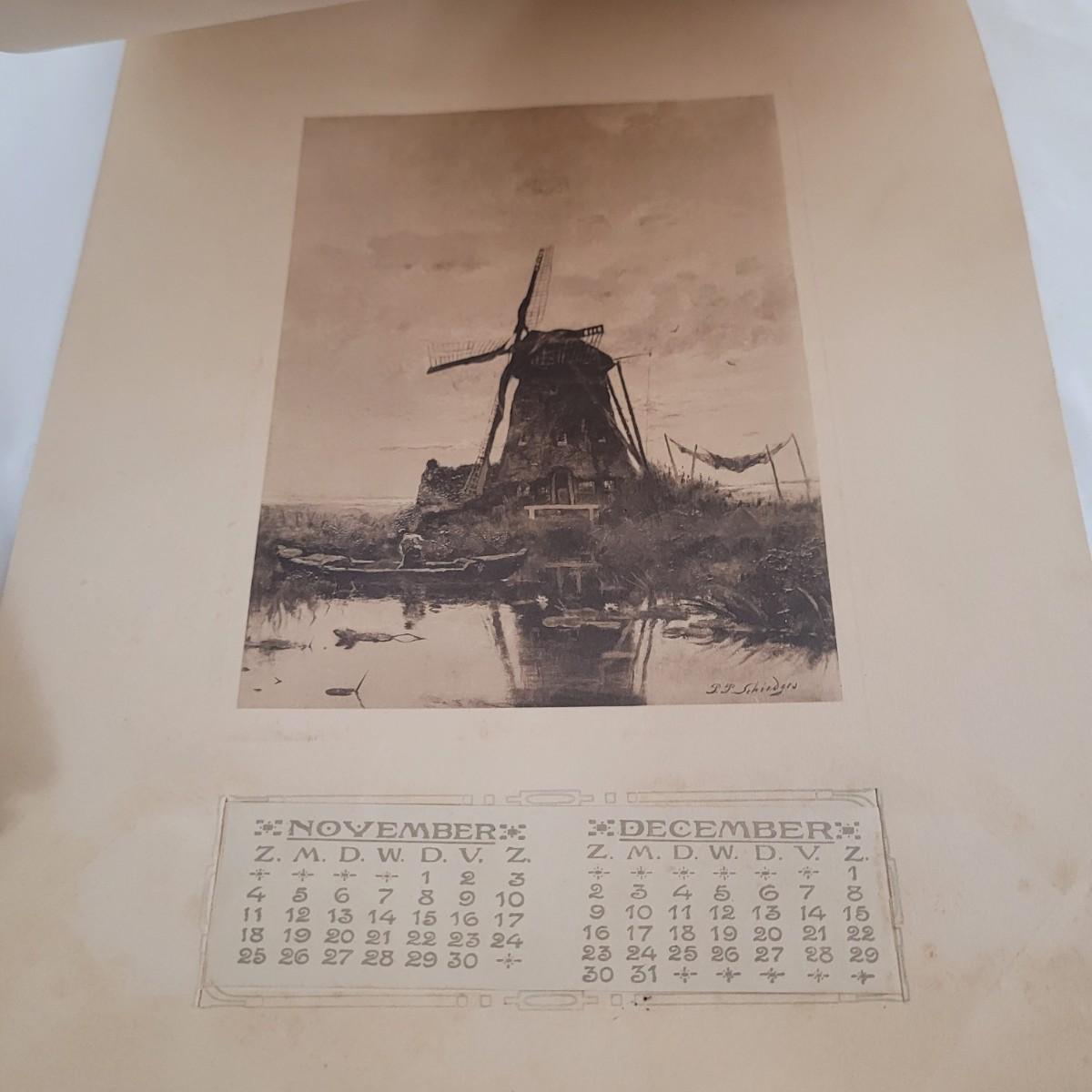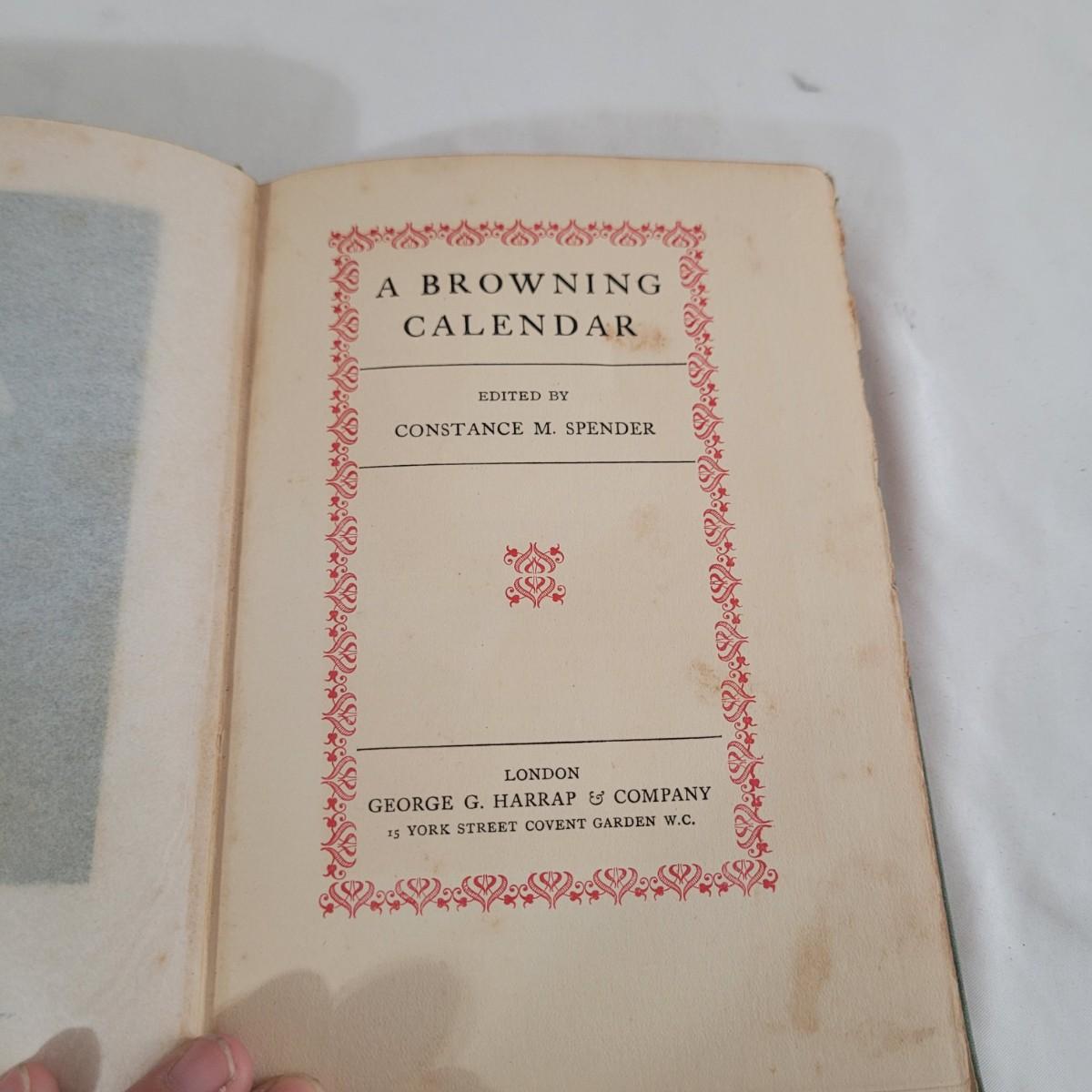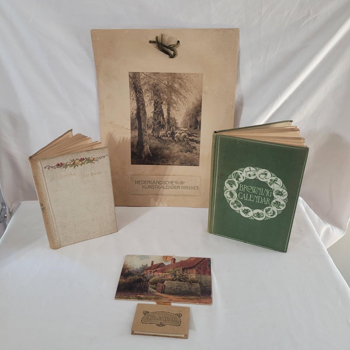 This collection of antique books and calendars includes the 1894 published Goethe Year Book, Browning Calendar, a 1932 mini calendar, and a 1923 Nederlandsche Kunst large calender. Large calendar measures approximately 9.5” x 12.5”. Shipping available.