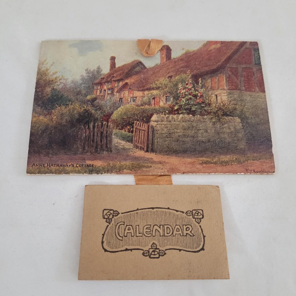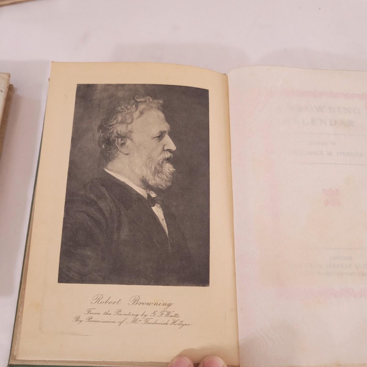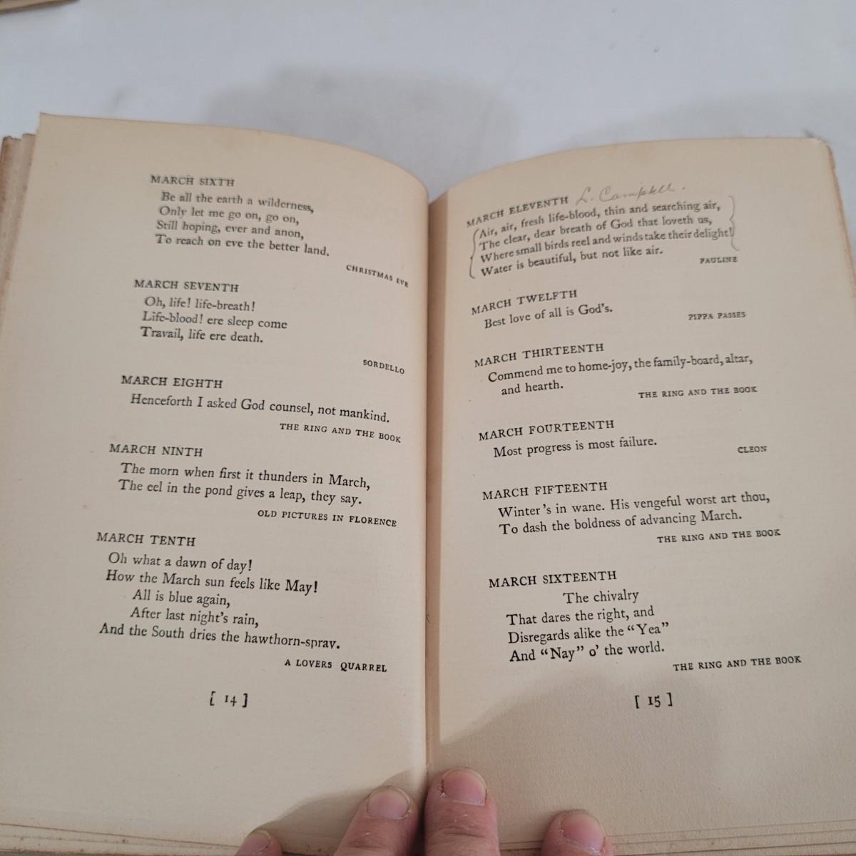 This collection of antique books and calendars includes the 1894 published Goethe Year Book, Browning Calendar, a 1932 mini calendar, and a 1923 Nederlandsche Kunst large calender. Large calendar measures approximately 9.5” x 12.5”. Shipping available.
