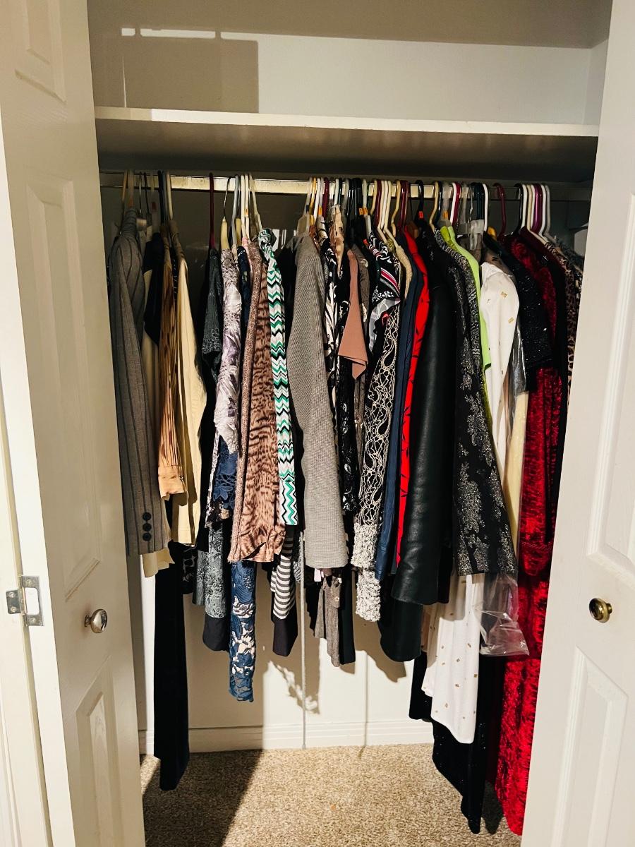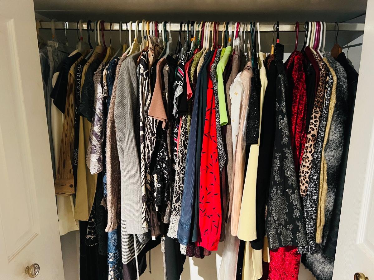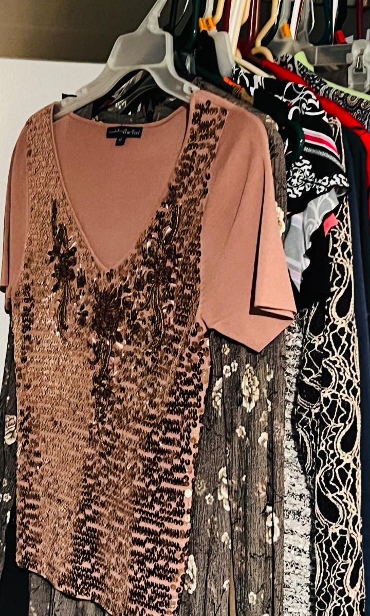 Ladies Going places closet lot. Sizes mostly small and some medium. All sorts of clothes from party dresses, nice Sweaters, three-quarter sleeves Leather jacket is a size small (does have loose buttons).