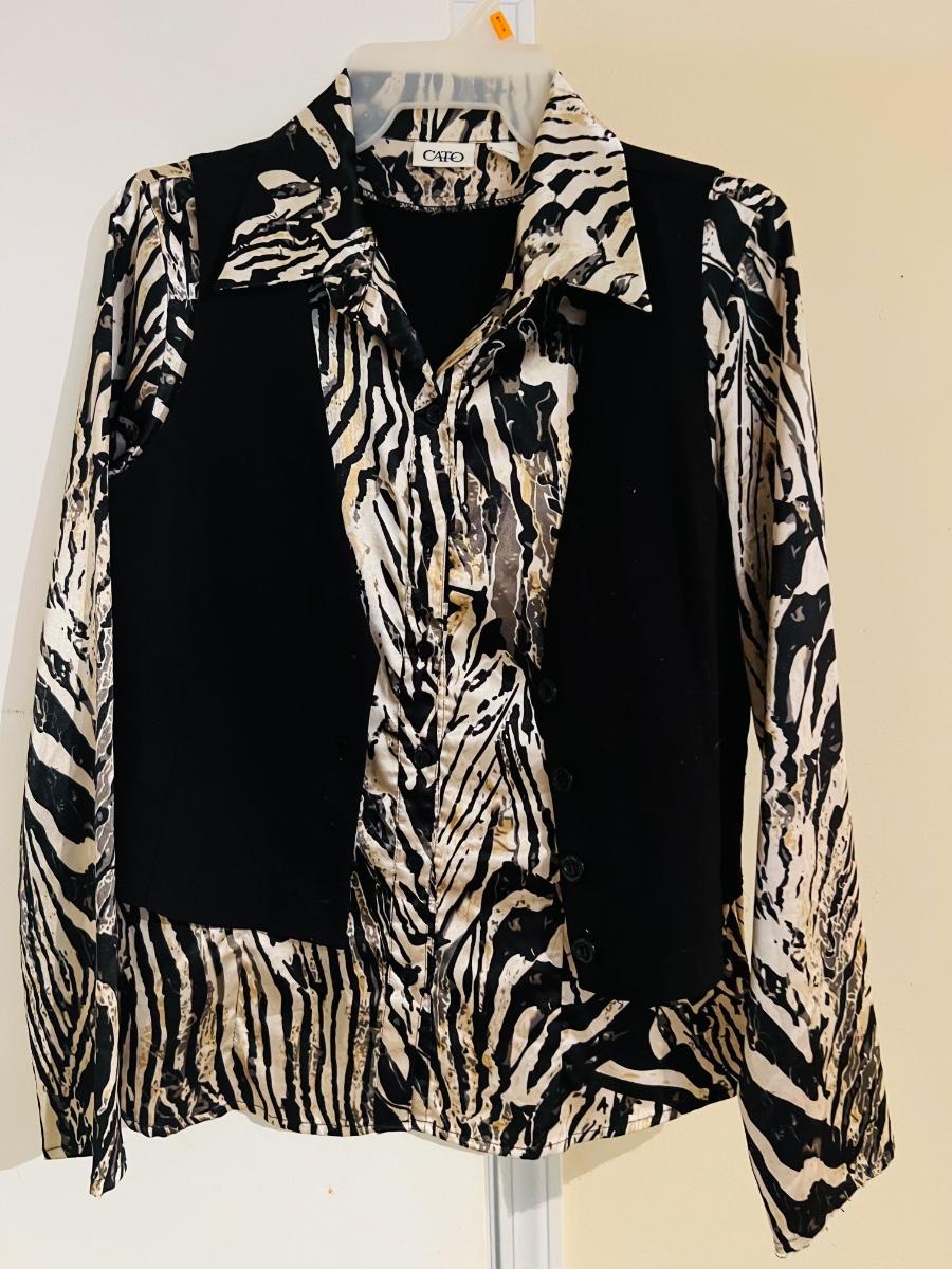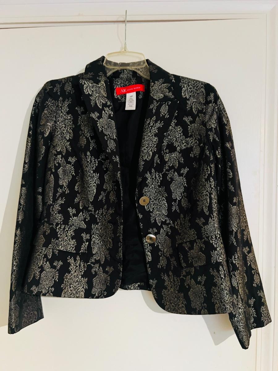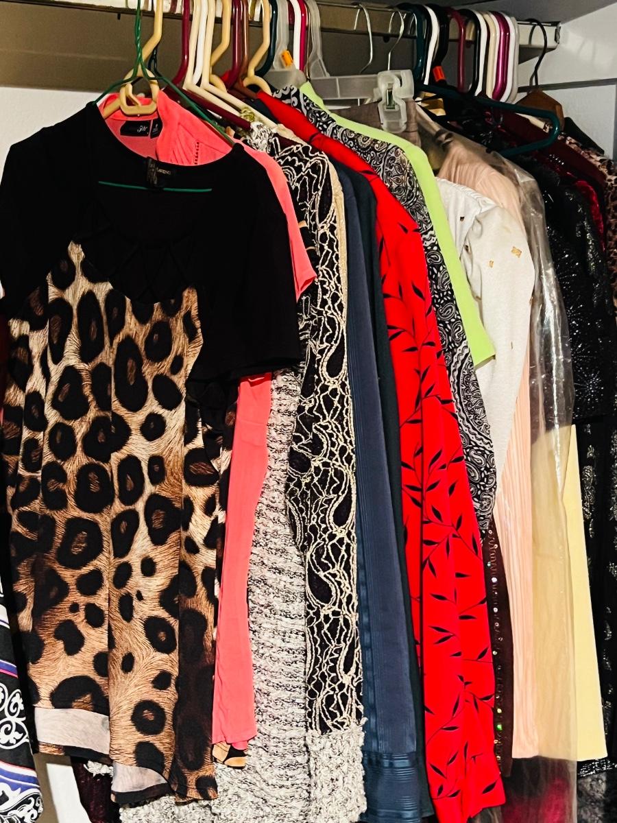 Ladies Going places closet lot. Sizes mostly small and some medium. All sorts of clothes from party dresses, nice Sweaters, three-quarter sleeves Leather jacket is a size small (does have loose buttons).