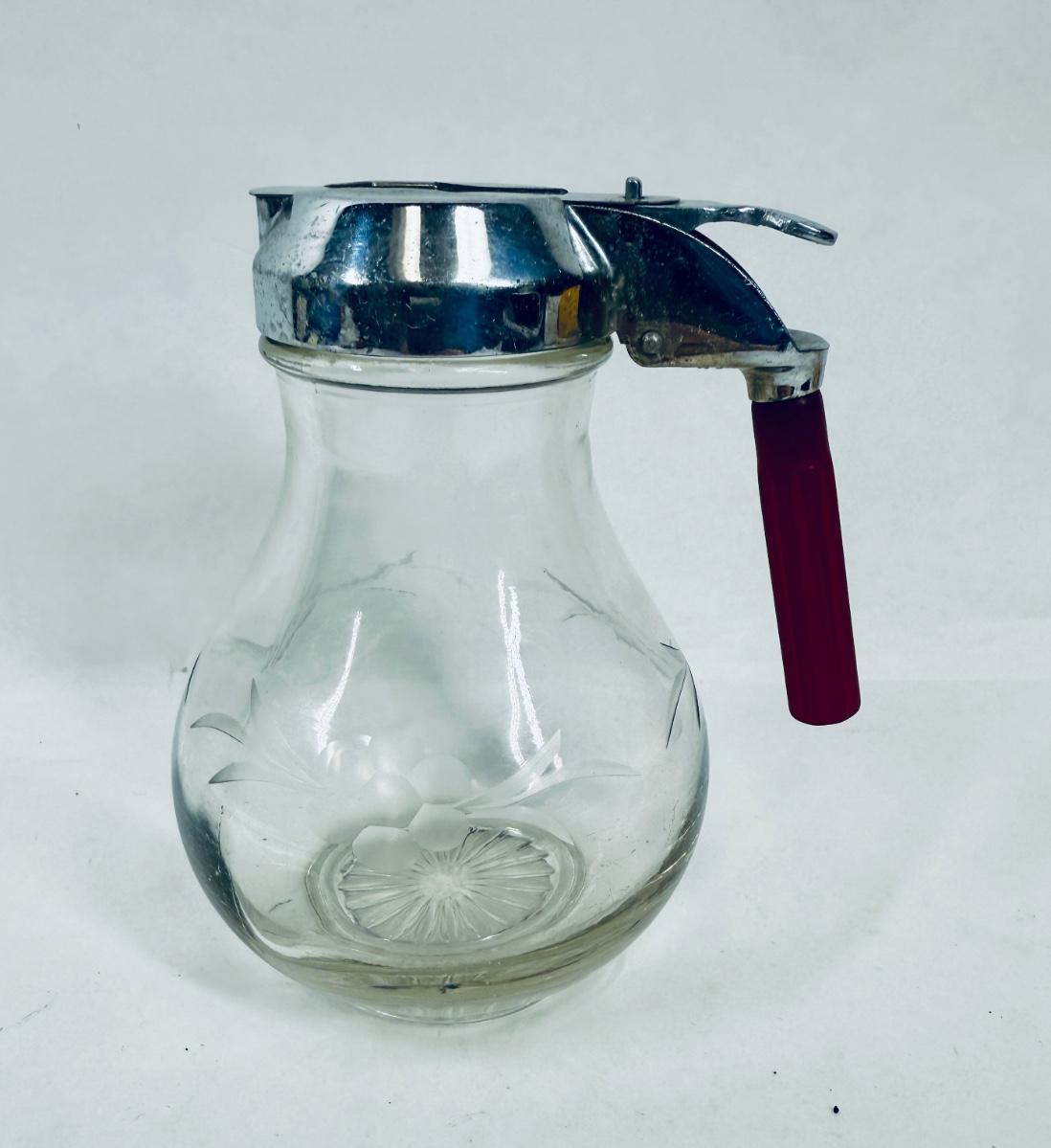 Vintage Etched Floral Glass Syrup Pitcher, chrome lid with red bakelite handle. Vintage style originally from the 1940's. Great condition.