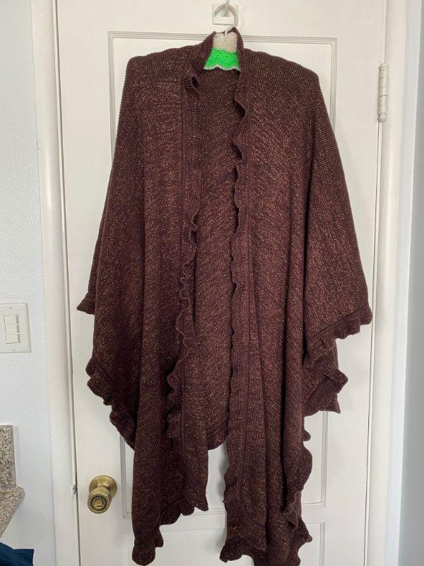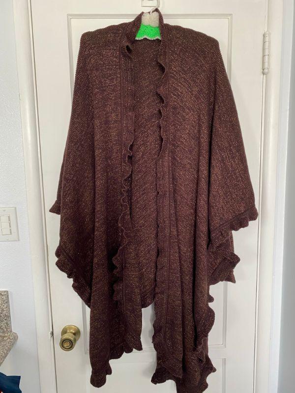 Brown with gold glittery threads knitted sweater wrap by Avenue. One Size. Ruffled edge.