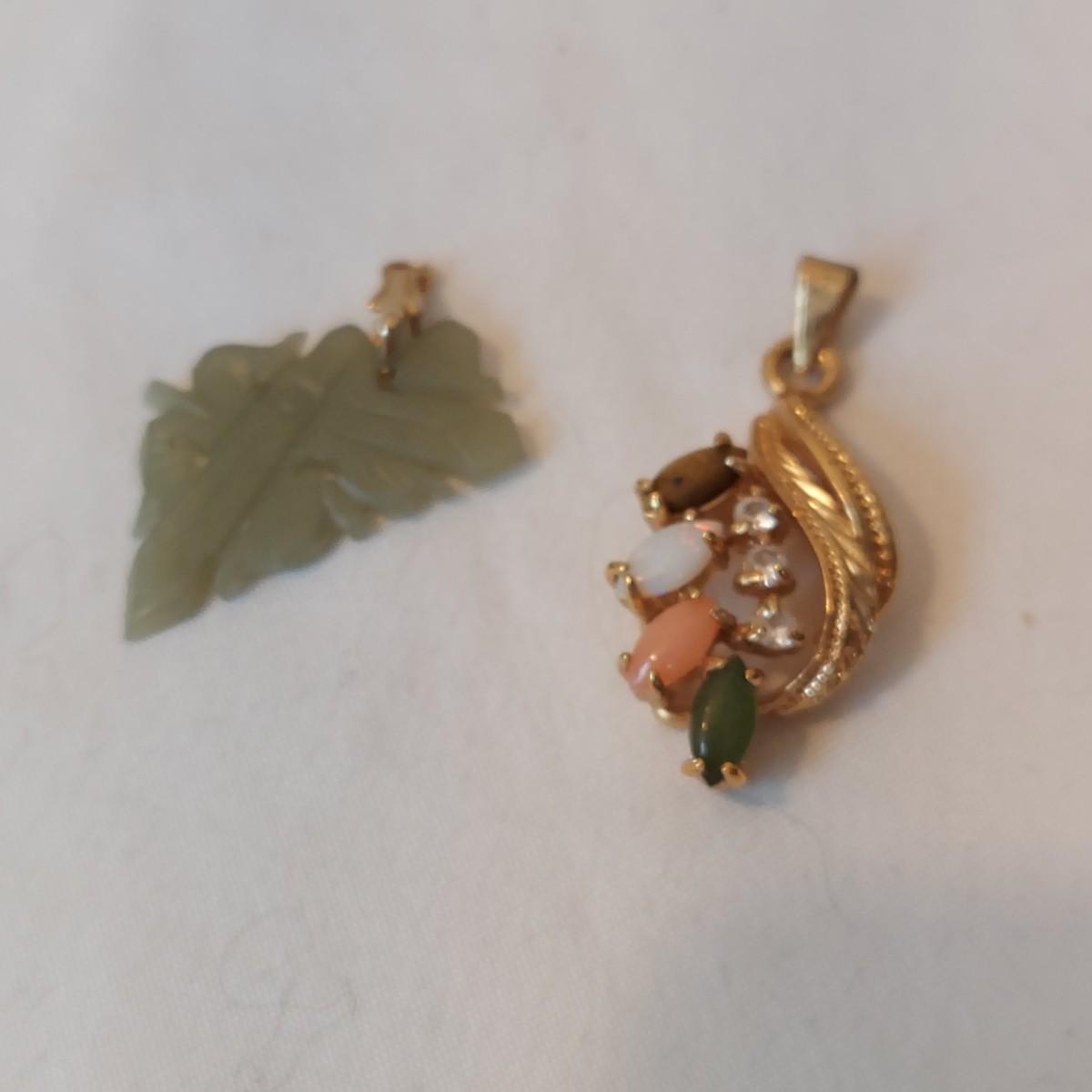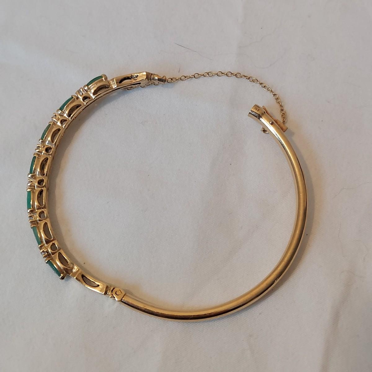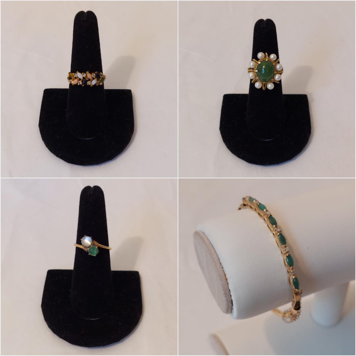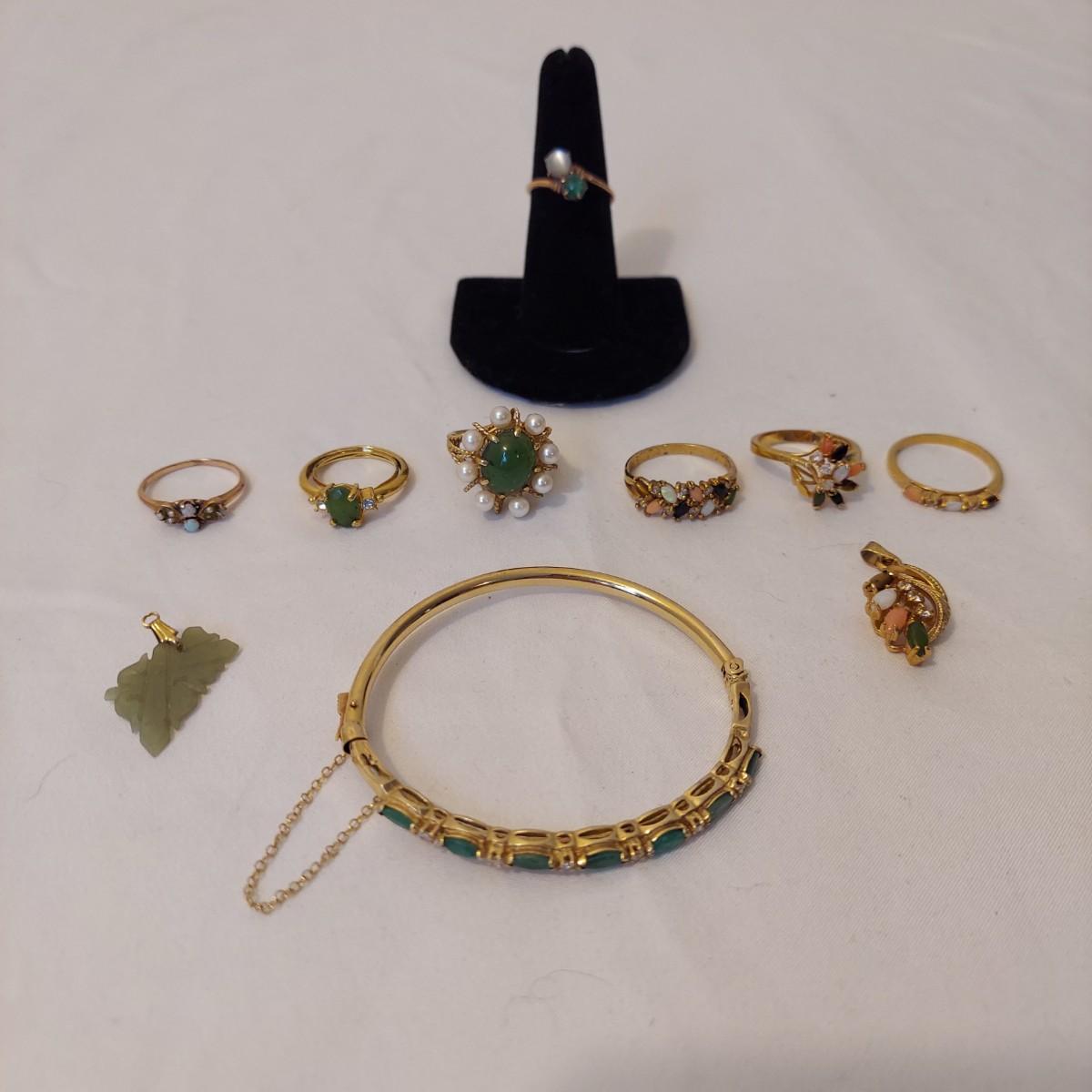 Lot includes one bracelet, two charms and seven rings. Two rings and the bracelet are stamped 14 or 14K. Several pieces have green stones in a jade green color. No stones were tested. Please see photos for details. All sales are final. No returns or refunds. Please bid accordingly. Shipping available