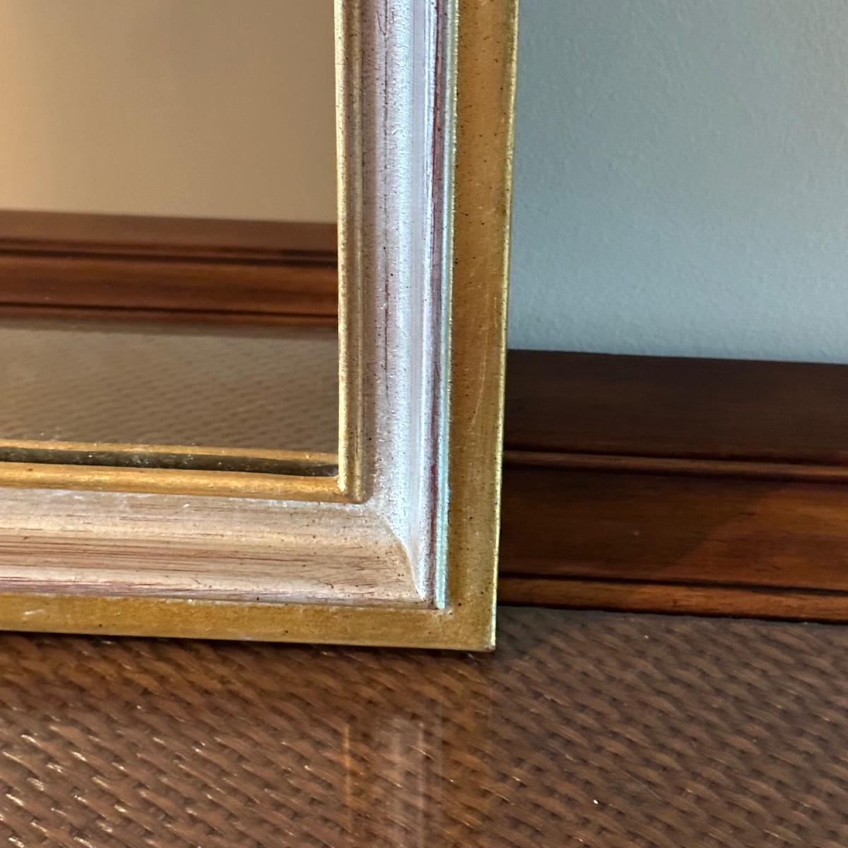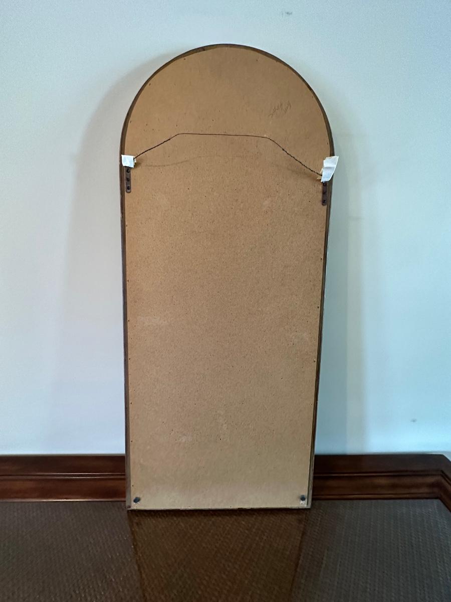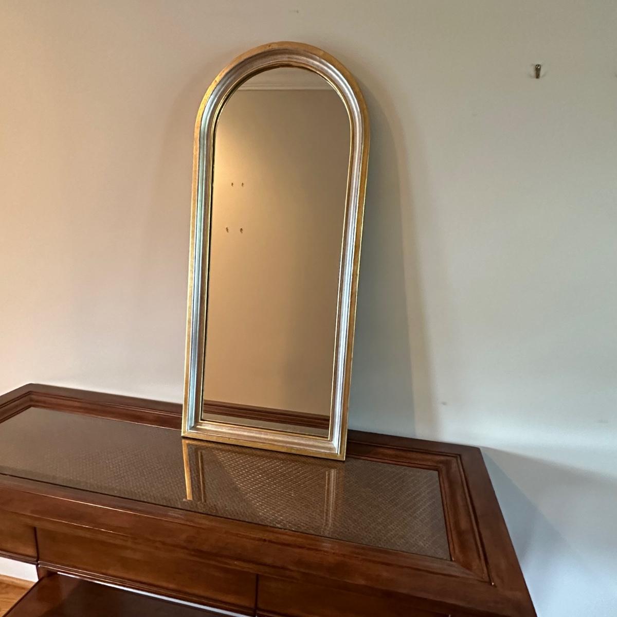 Mirror with gold and silver finish on wooden frame with curved top. 17” x 38.5”H. Shipping available.