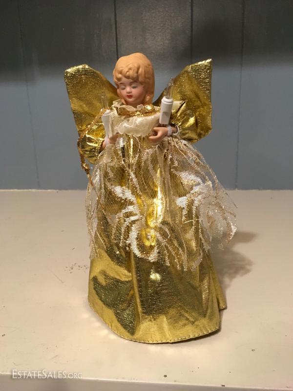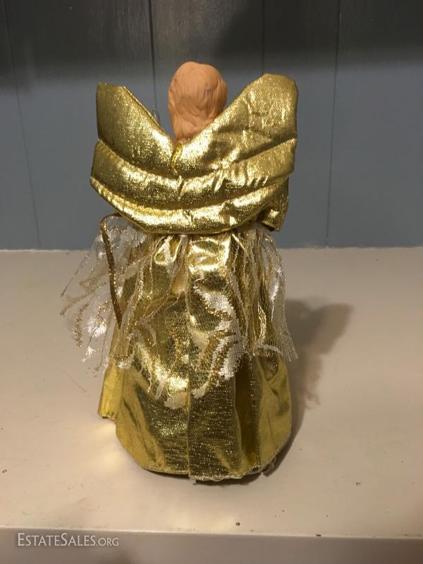 Angel tree topper is wearing a gold fabric dress. Topper lights up when plugged into an outlet. About 8 and 1/2" tall.