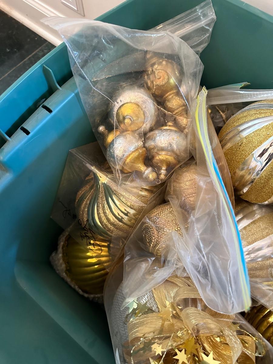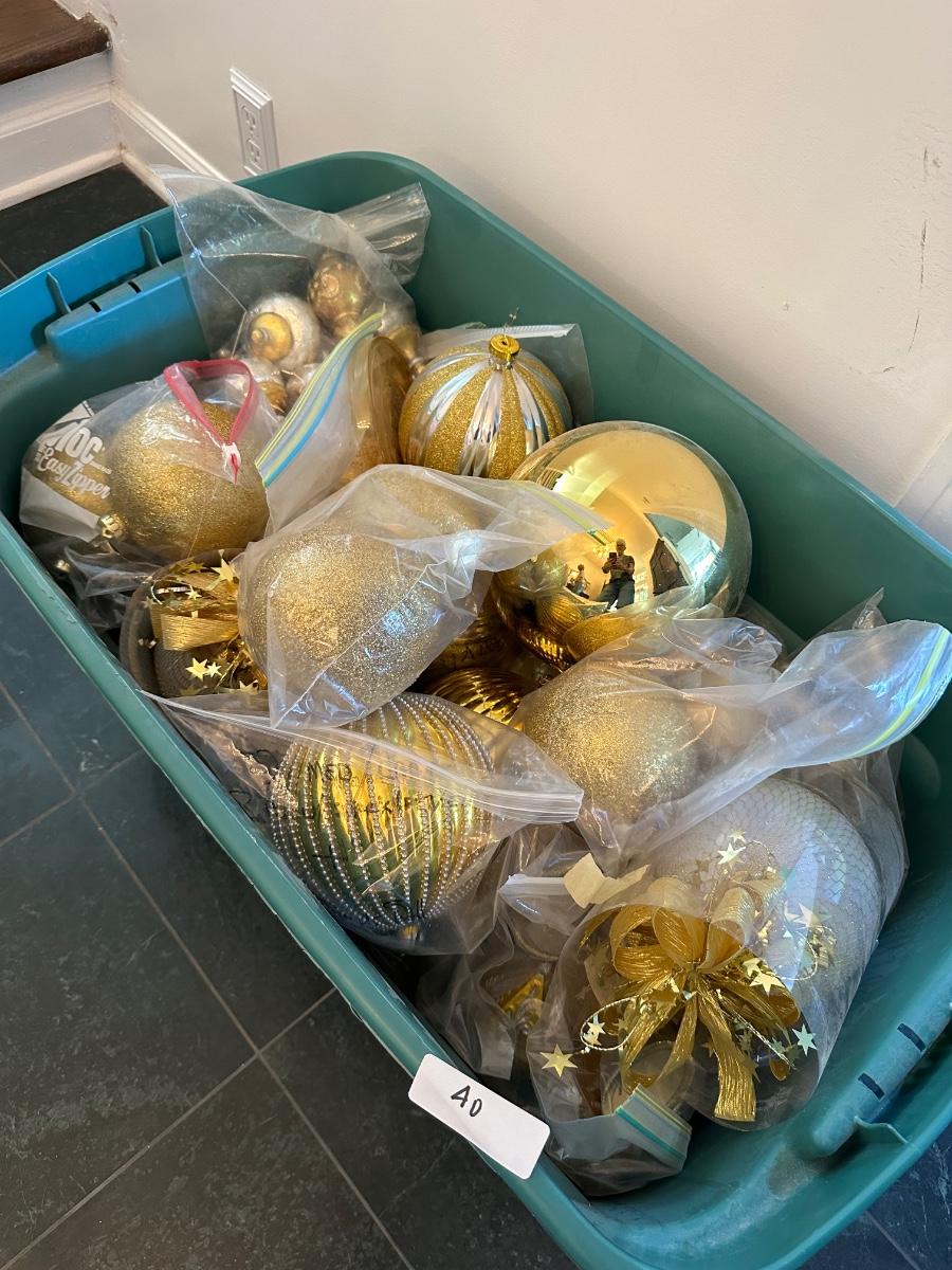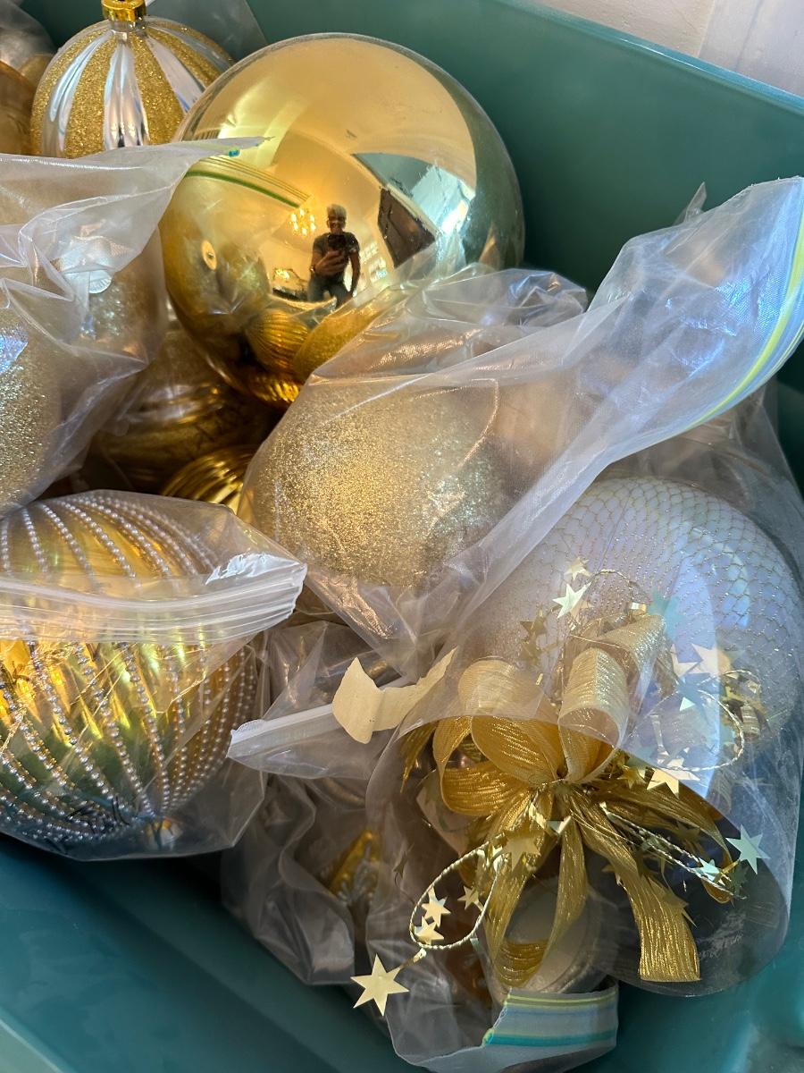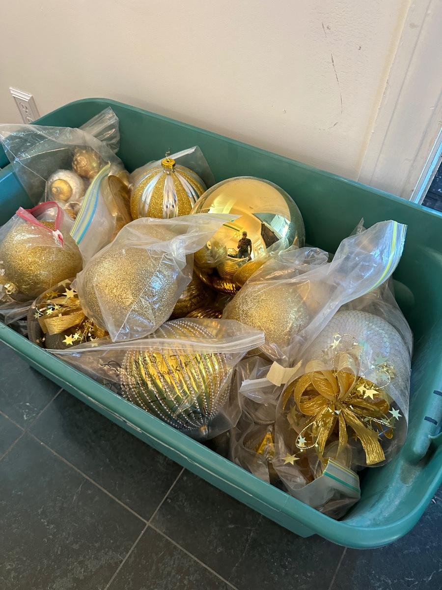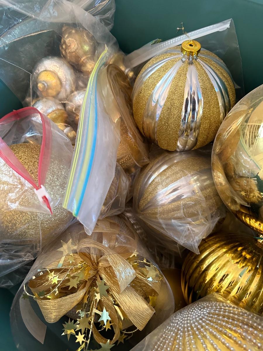 GREEN TUB OF MISC SIZED GOLD CHRISTMAS BALLS
