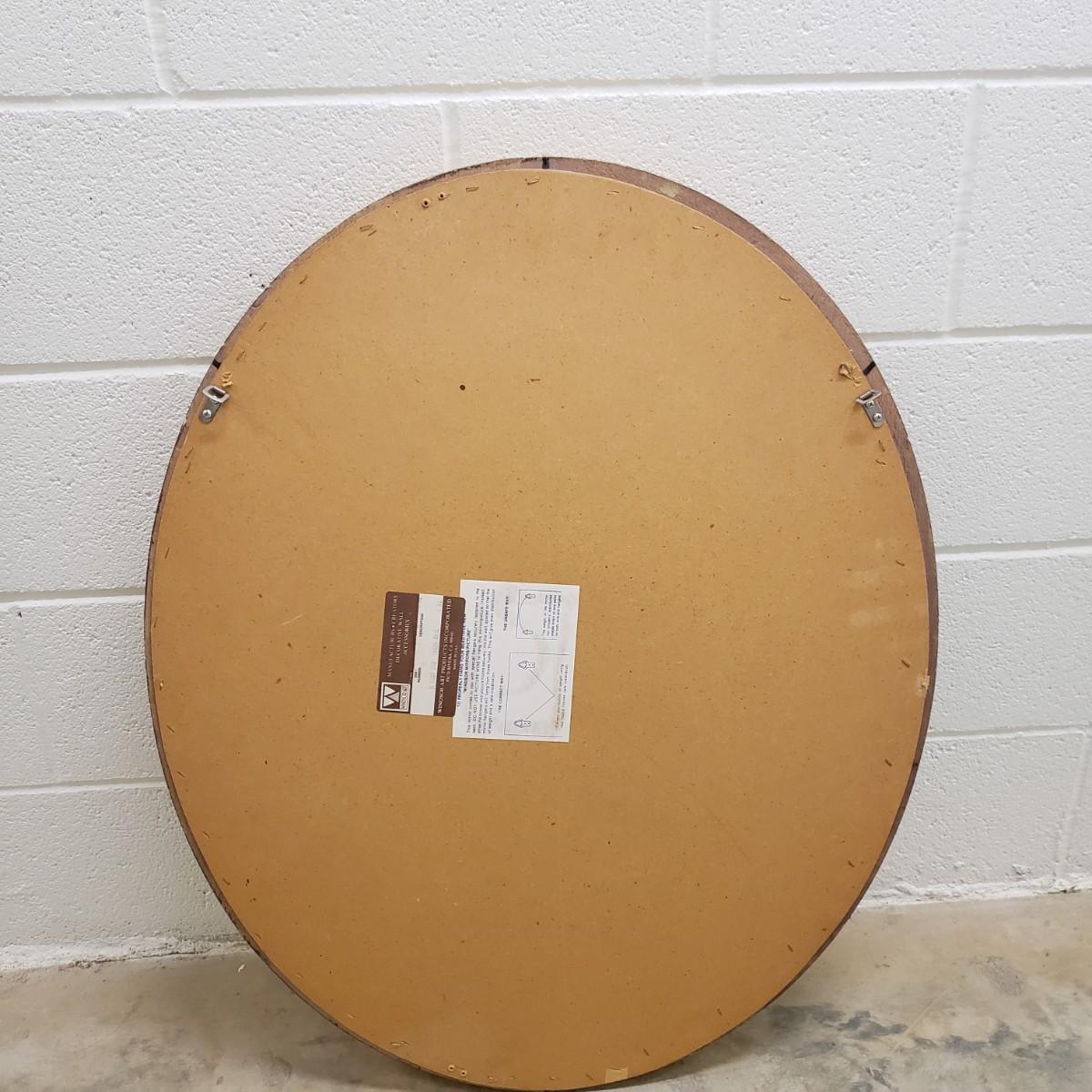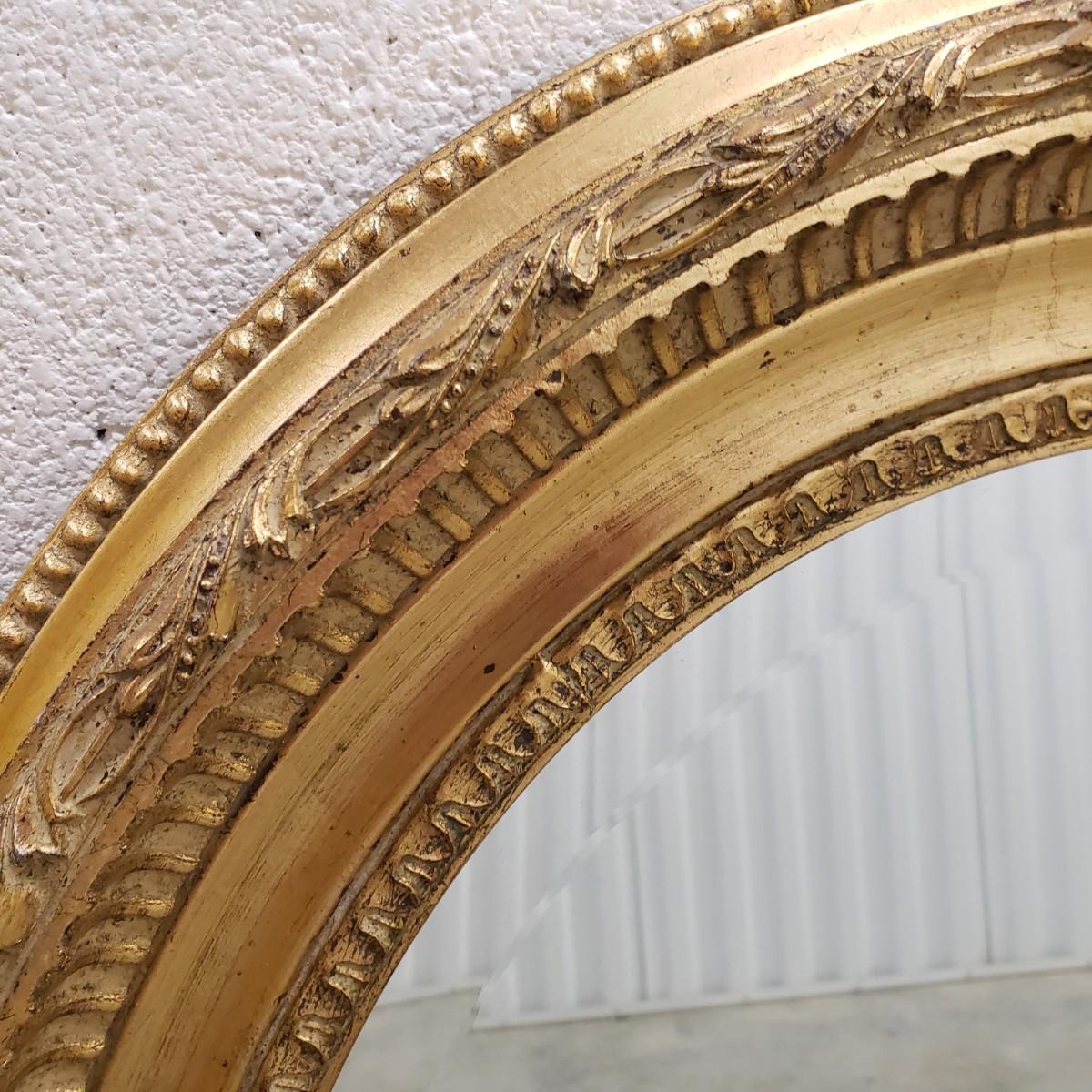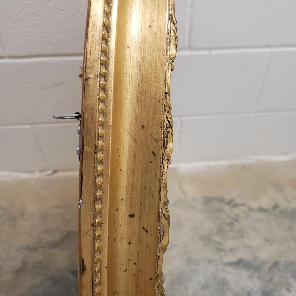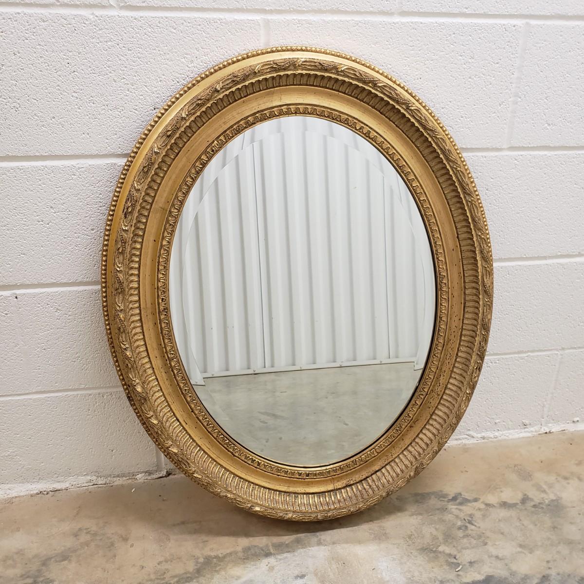 The gold wooden frame with a beveled oval mirror measures 25"x3"x32". The mirror does not have a wire for hanging, but does have the 2 pieces already attached for the wire. The mirror appears to be in great condition, no chips or scratches.