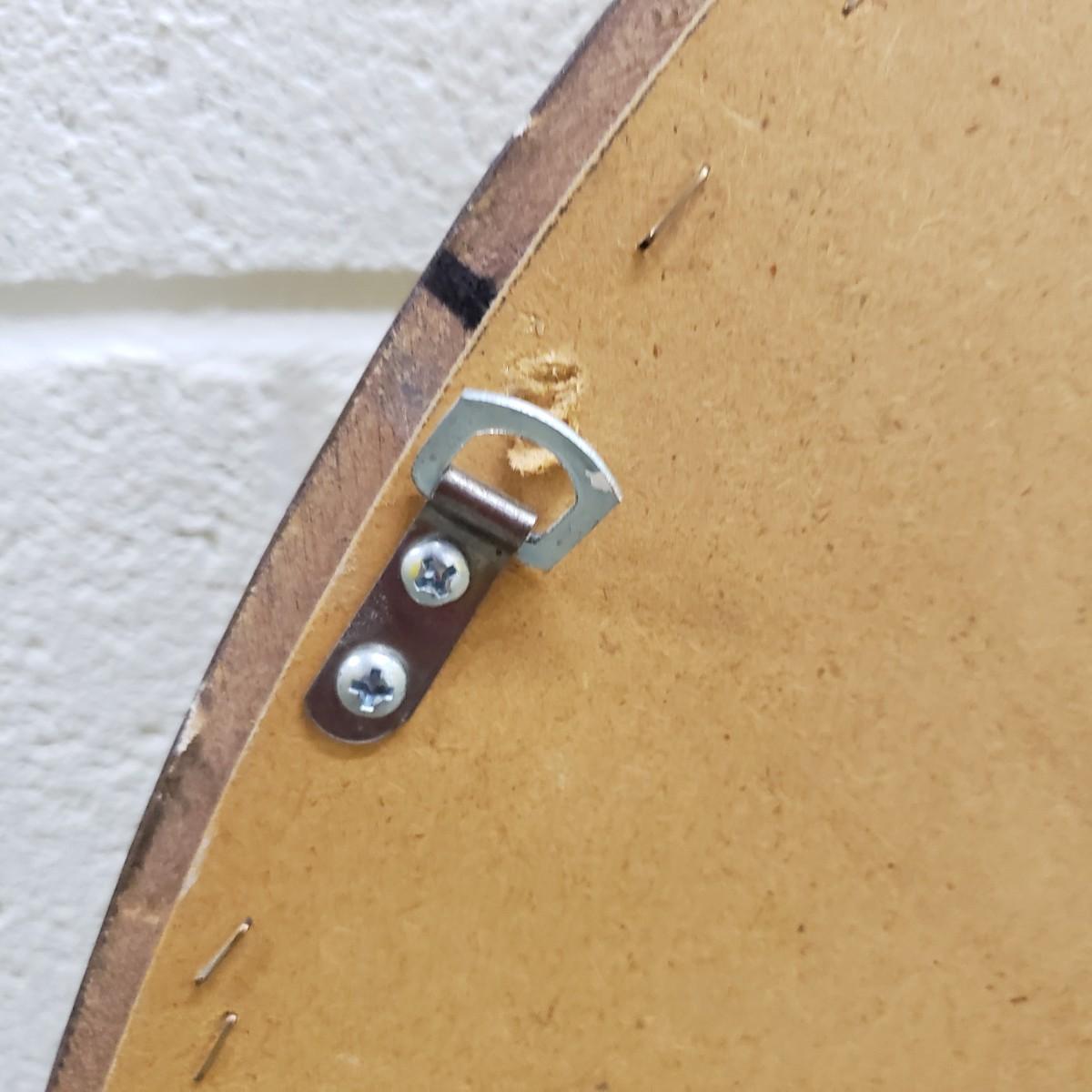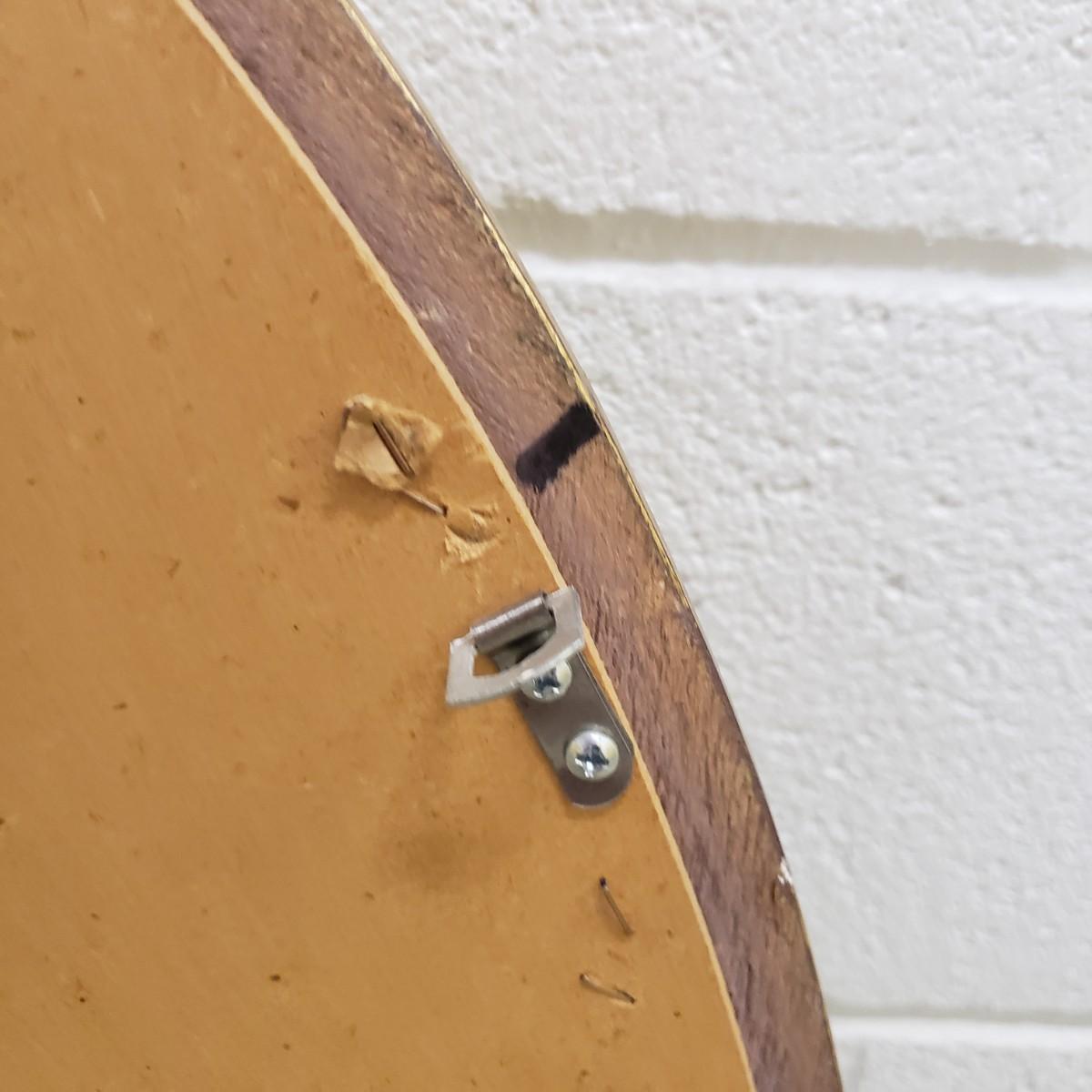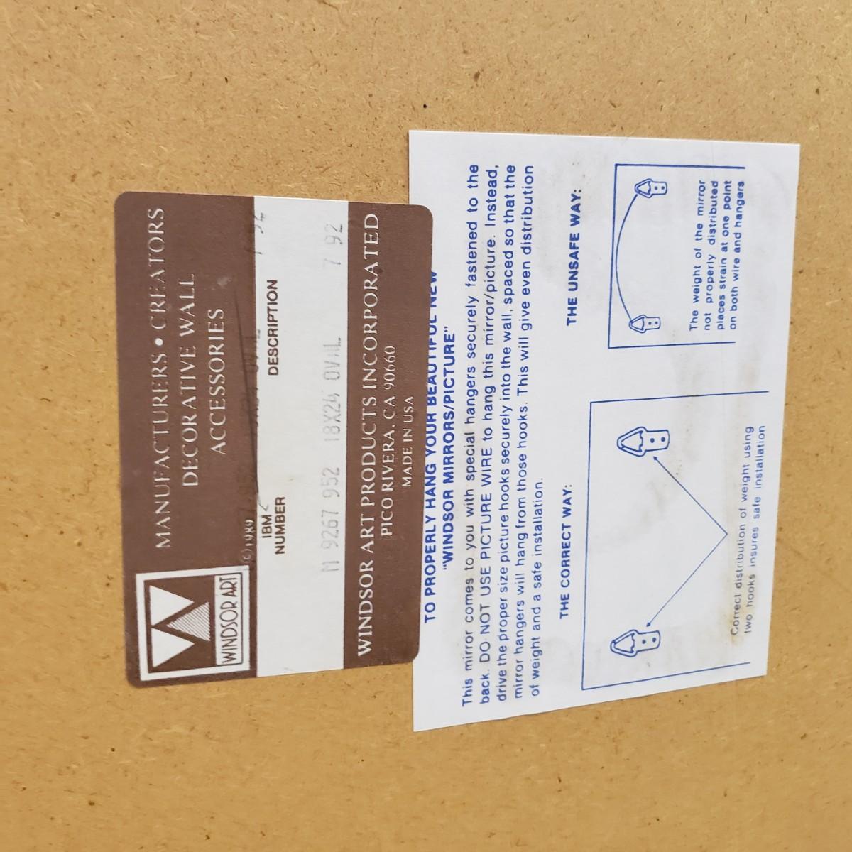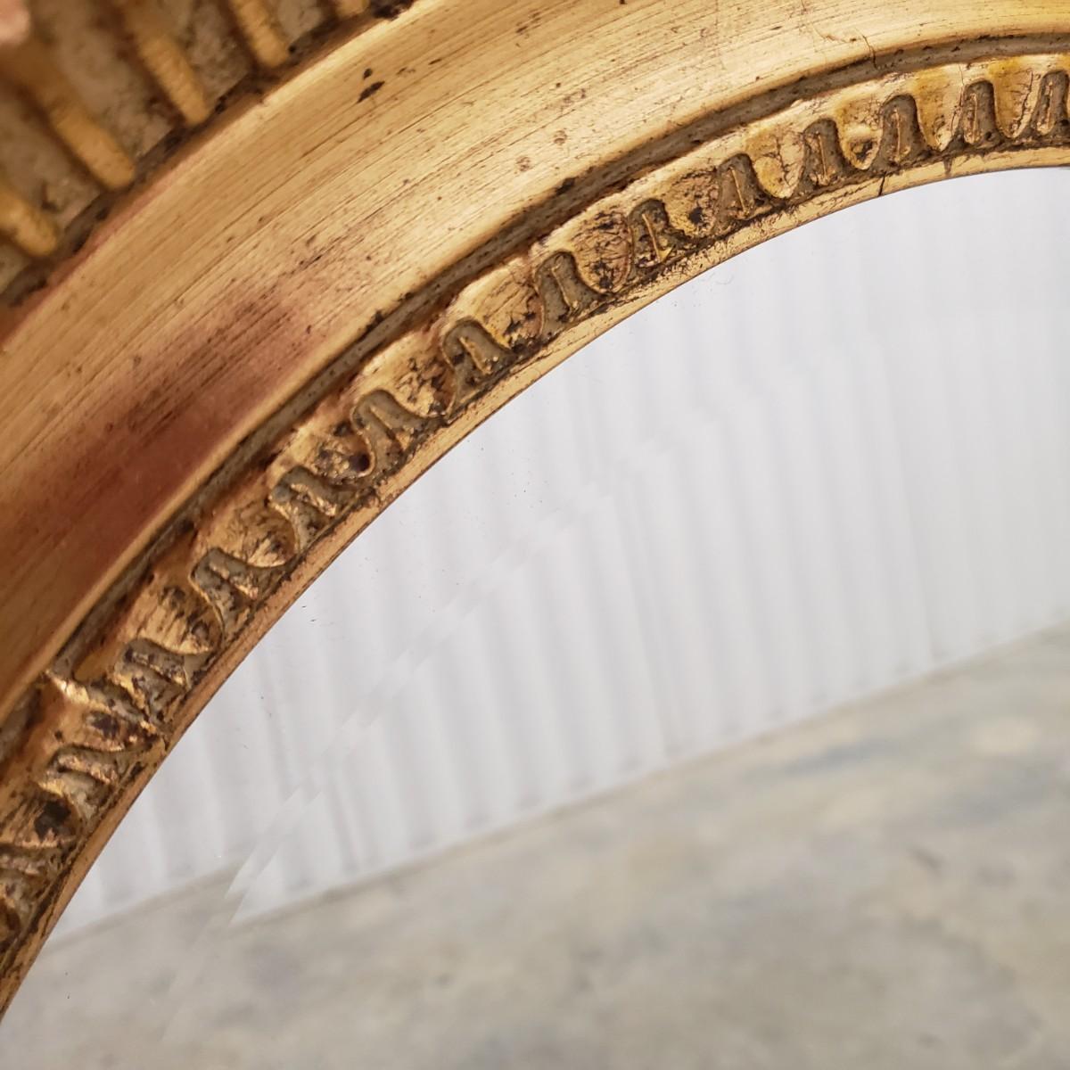 The gold wooden frame with a beveled oval mirror measures 25"x3"x32". The mirror does not have a wire for hanging, but does have the 2 pieces already attached for the wire. The mirror appears to be in great condition, no chips or scratches.
