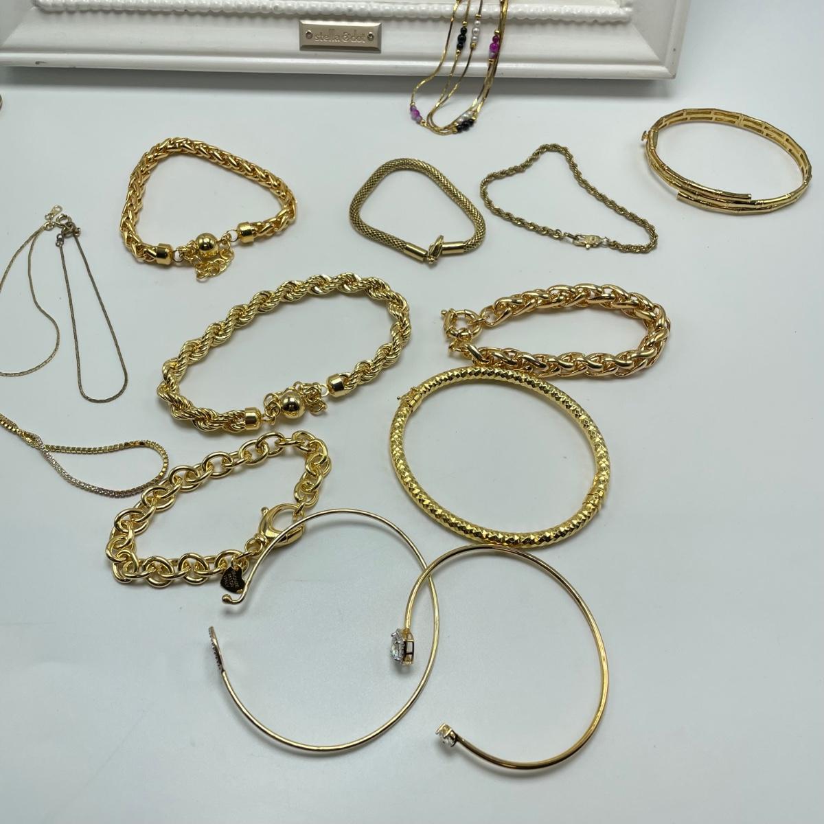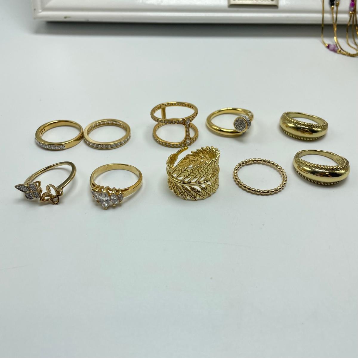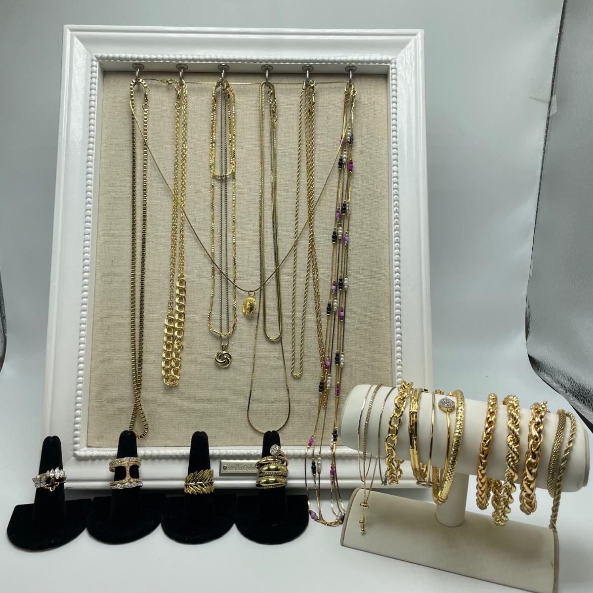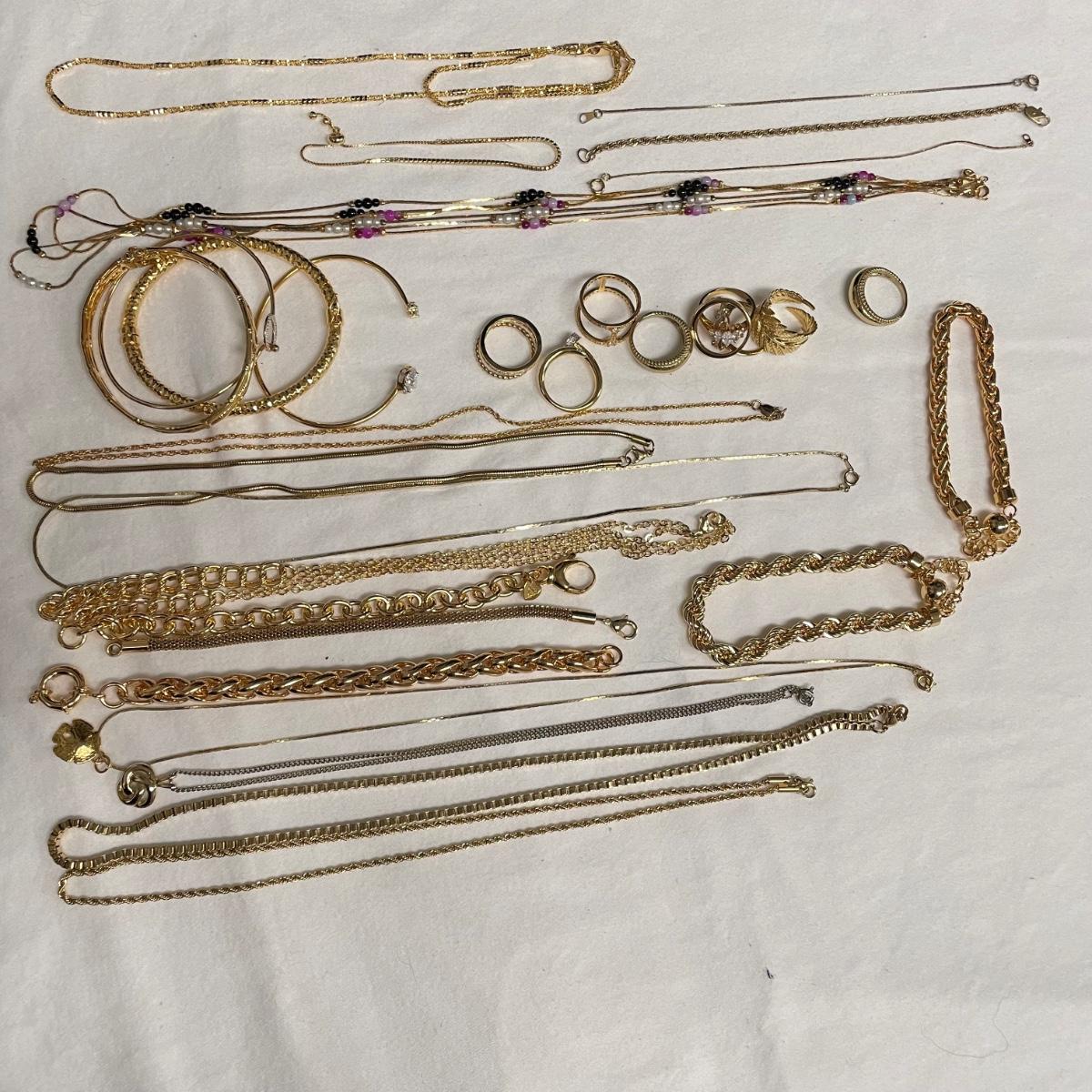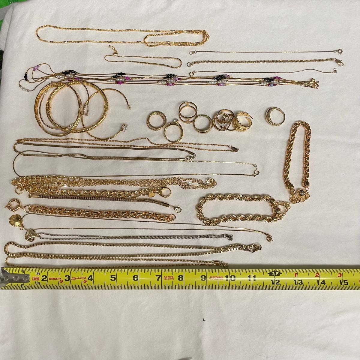 Large selection of gold and brass colored necklaces, rings and bracelets. Known stamps are shown in photos. Lot includes at least ten each of bracelets, necklaces and rings. Please see photos for all markings found. We cannot guarantee the authenticity of the gemstones. All sales are final. No returns or refunds. Please bid accordingly.