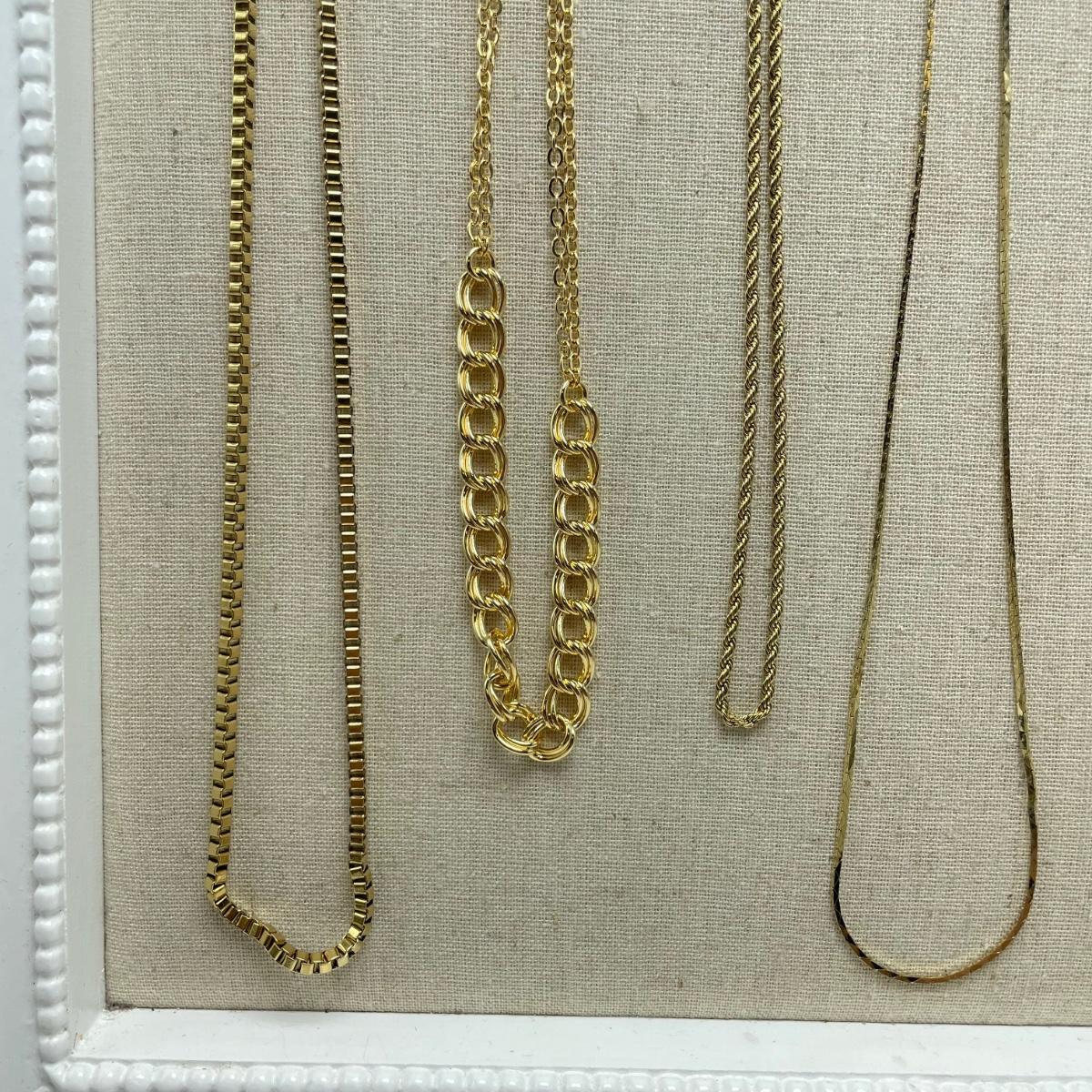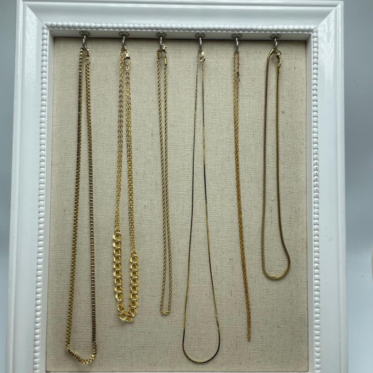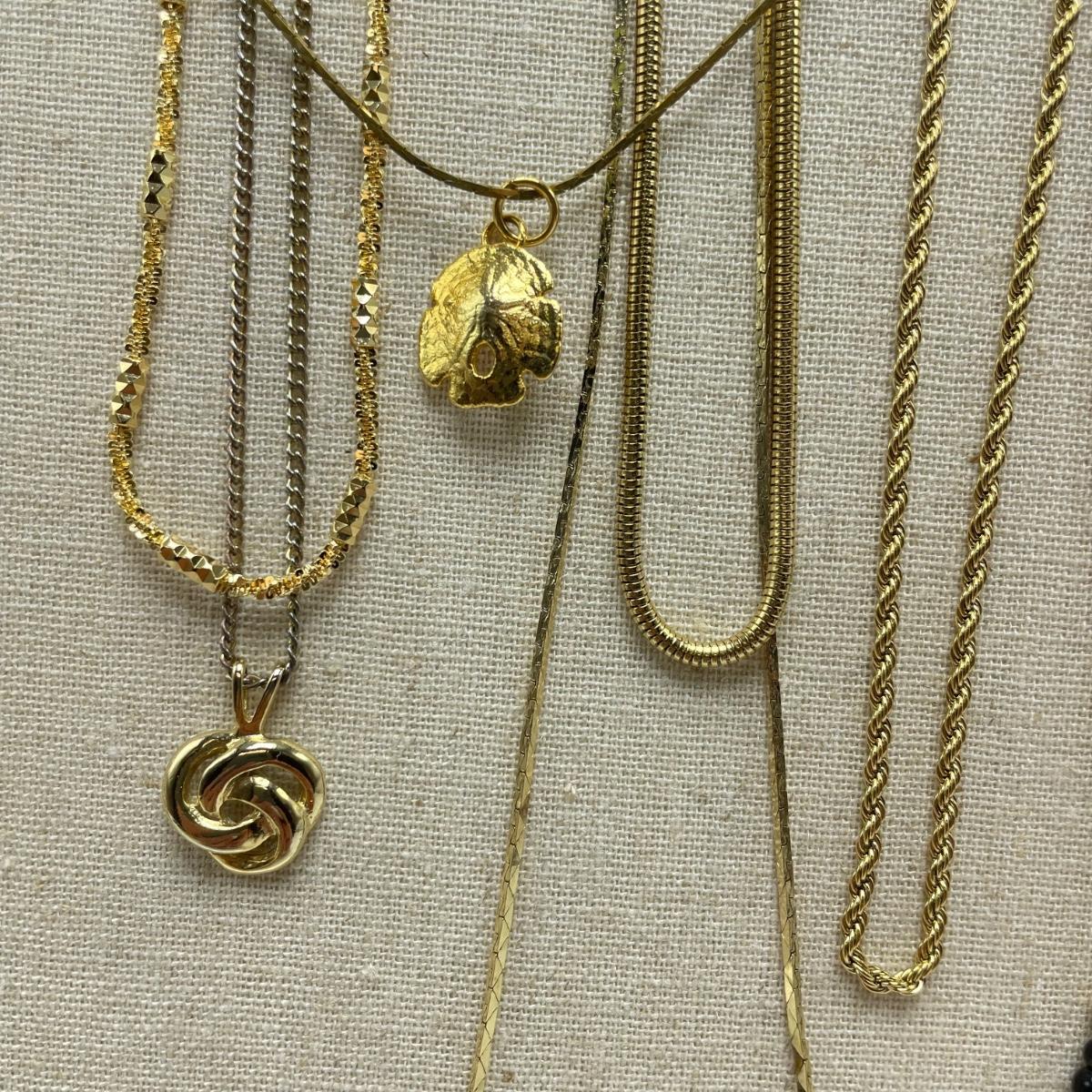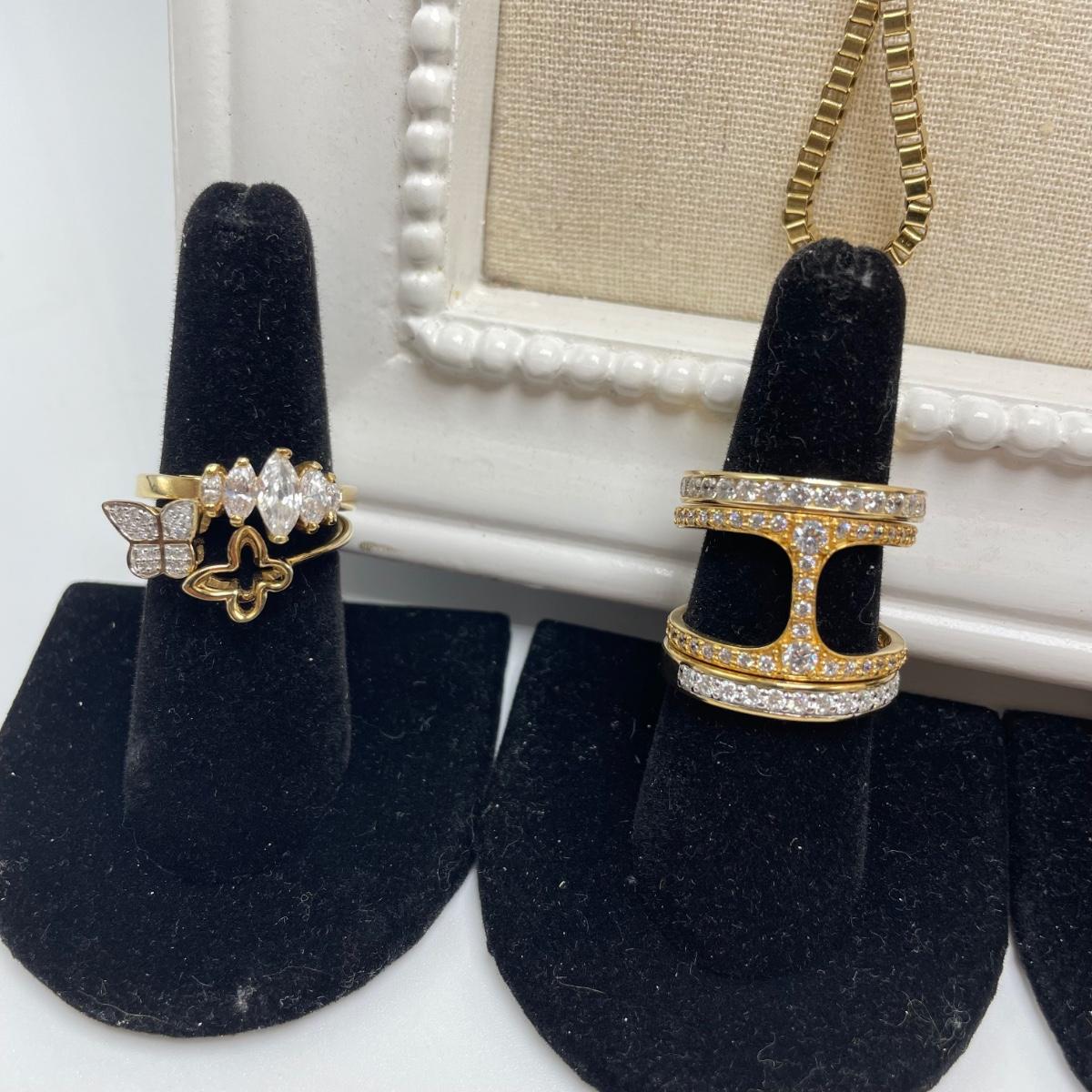 Large selection of gold and brass colored necklaces, rings and bracelets. Known stamps are shown in photos. Lot includes at least ten each of bracelets, necklaces and rings. Please see photos for all markings found. We cannot guarantee the authenticity of the gemstones. All sales are final. No returns or refunds. Please bid accordingly.