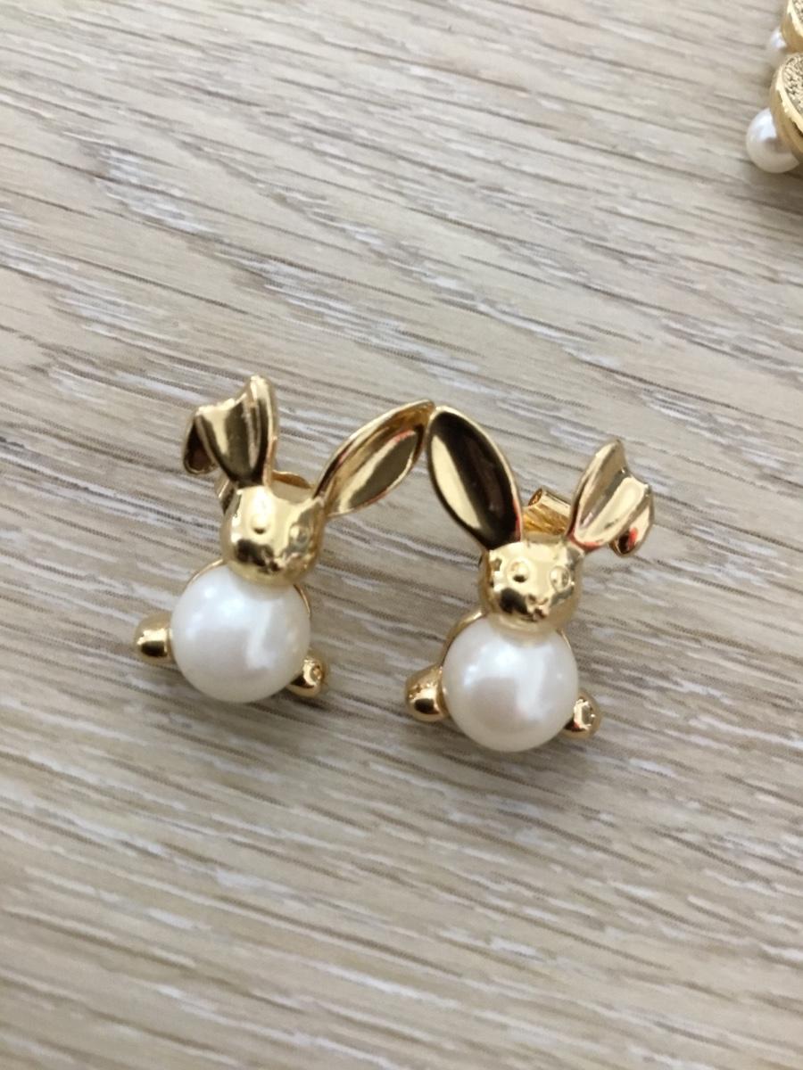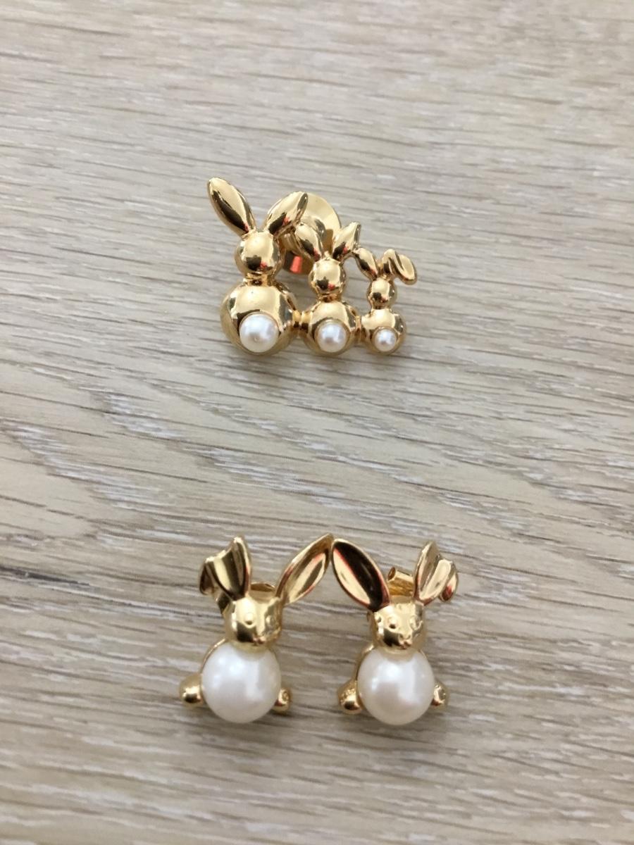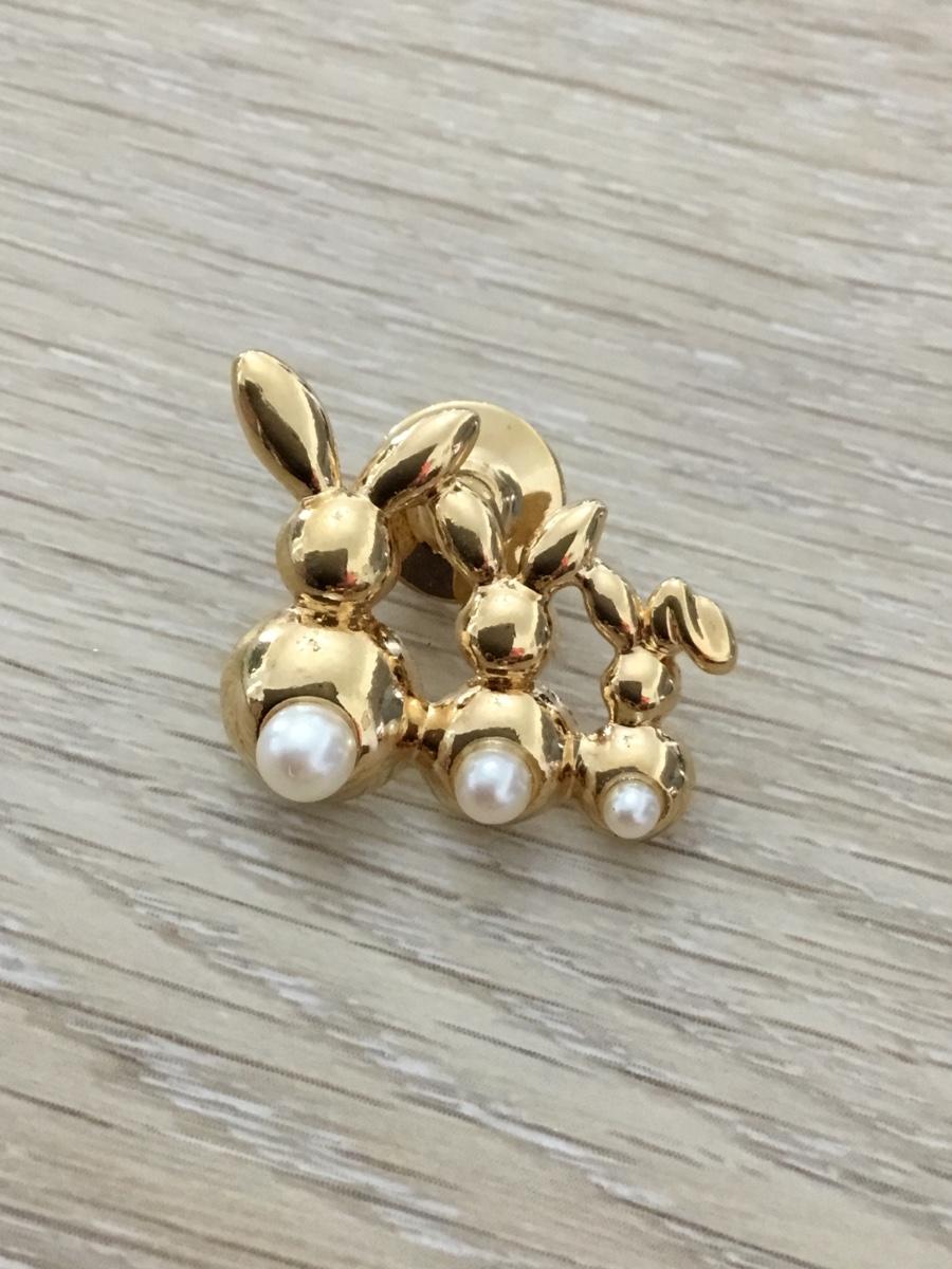 Gold Bunny Family Pin Three Faux Pearl Rabbits Lapel Pin Tie Tack Pinback And earrings set Avon