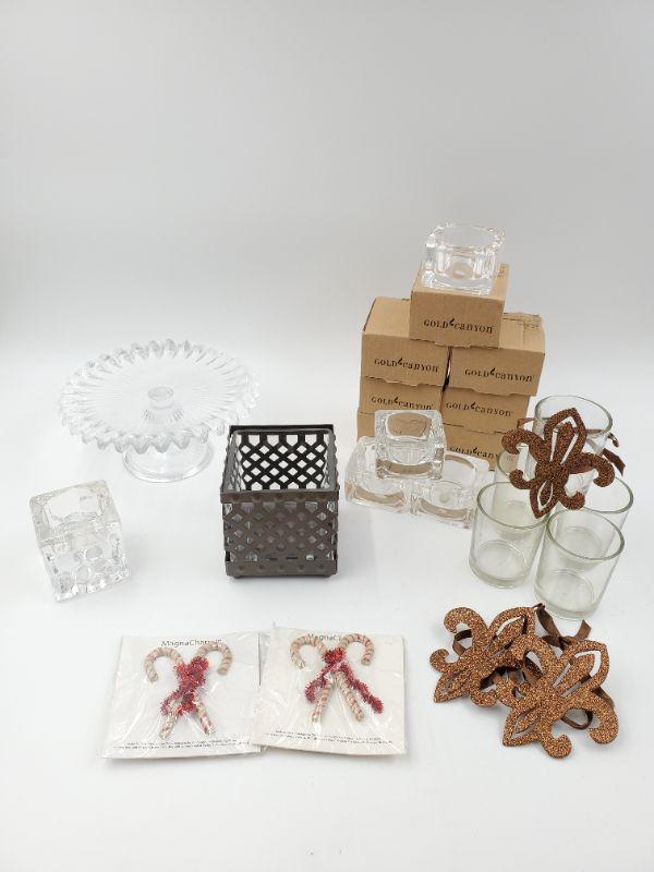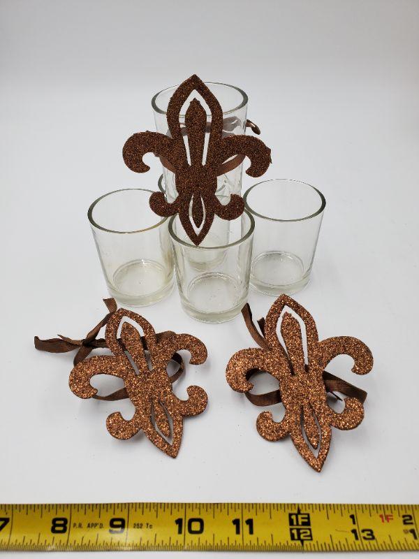 5 round votive holders, 3 sparkly accents with ribbons to wrap around.